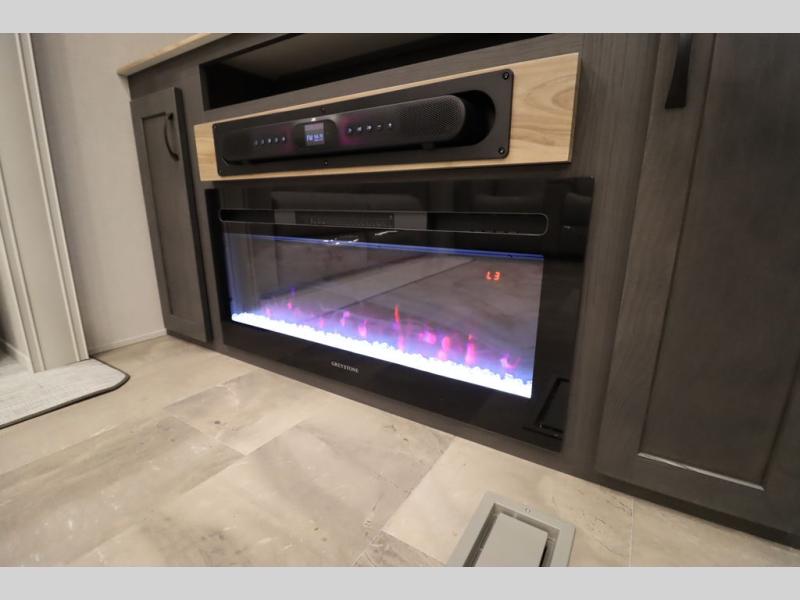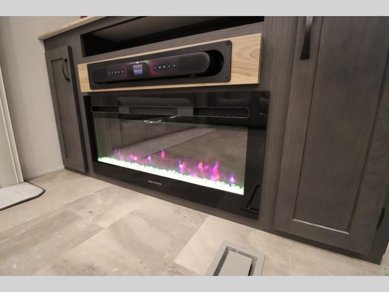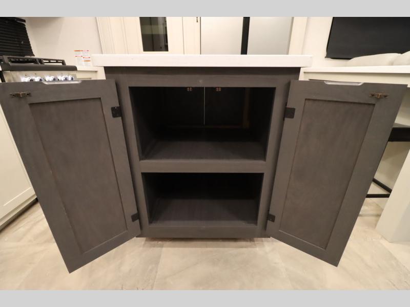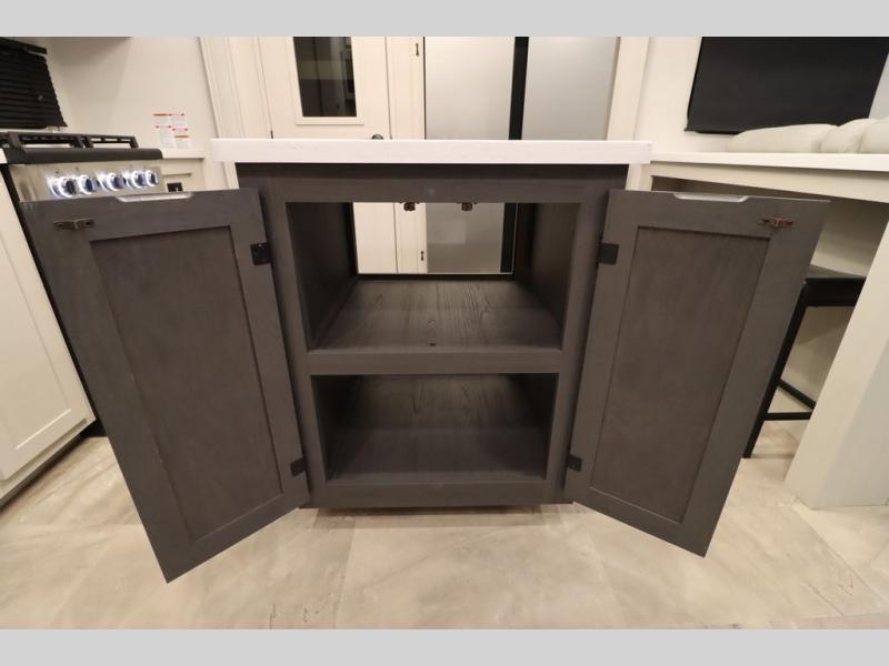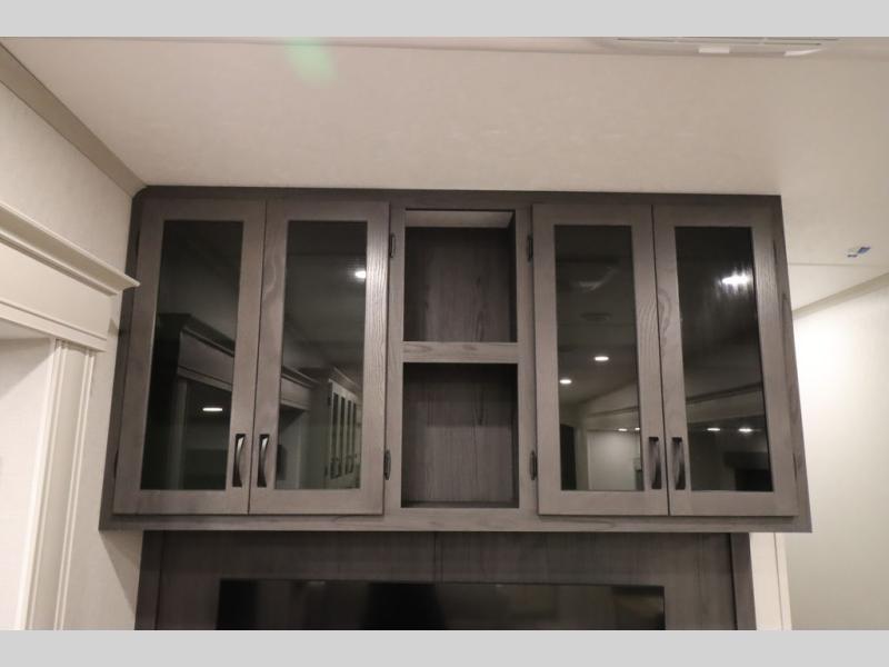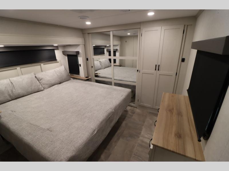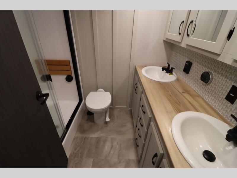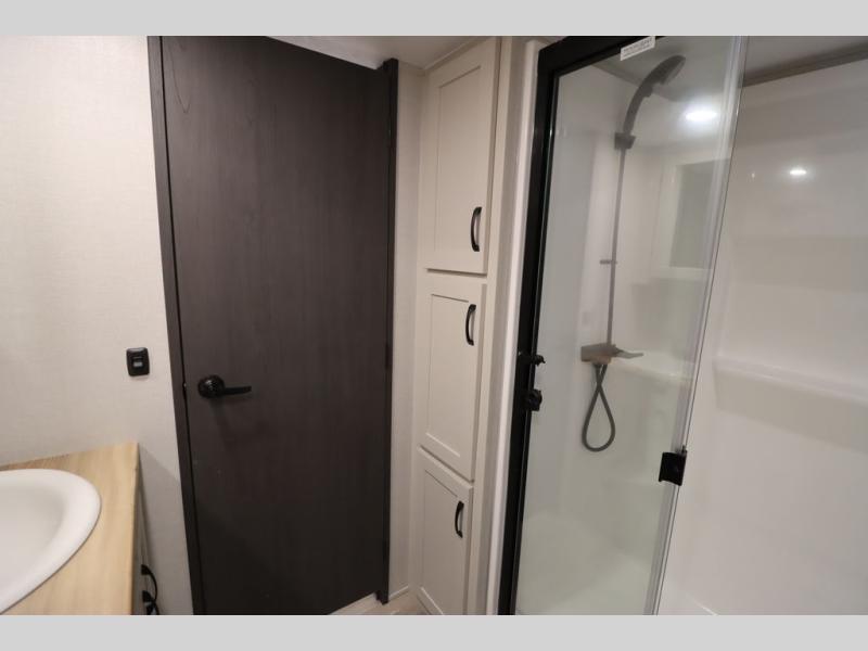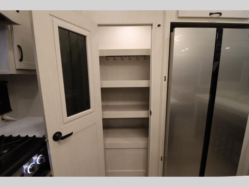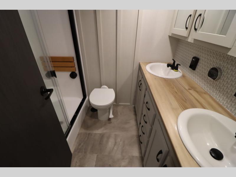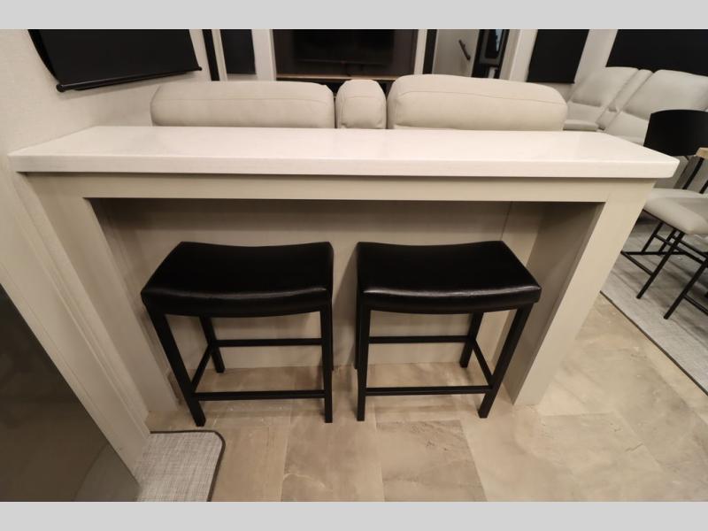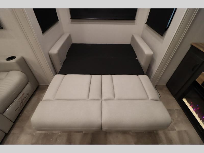 One look at this fifth wheel and you'll be sold. You'll find tons of counter space in the rear kitchen along with a kitchen island, a large pantry, and a hutch for even more storage. Visit in the main living area on the two theater seats and tri-fold sofa, or you may want to head outdoors under the two power awnings! There is even an outside refrigerator here to entertain guests. The spacious full bath will allow you to clean up after a day of adventuring, and here you'll find a full-size shower with sliding glass doors and a seat, plus a dual sink vanity. The front private bedroom will feel just like home with its king bed slide out, large wardrobe, and dresser to keep your clothes tidy.