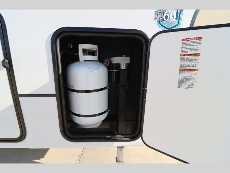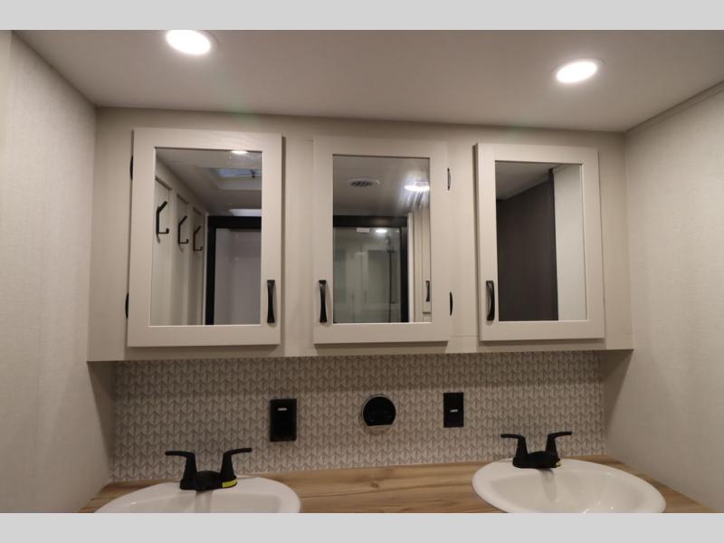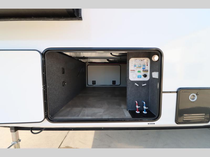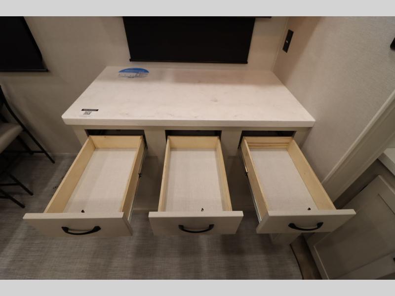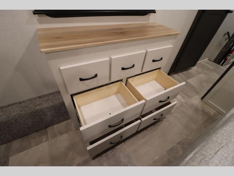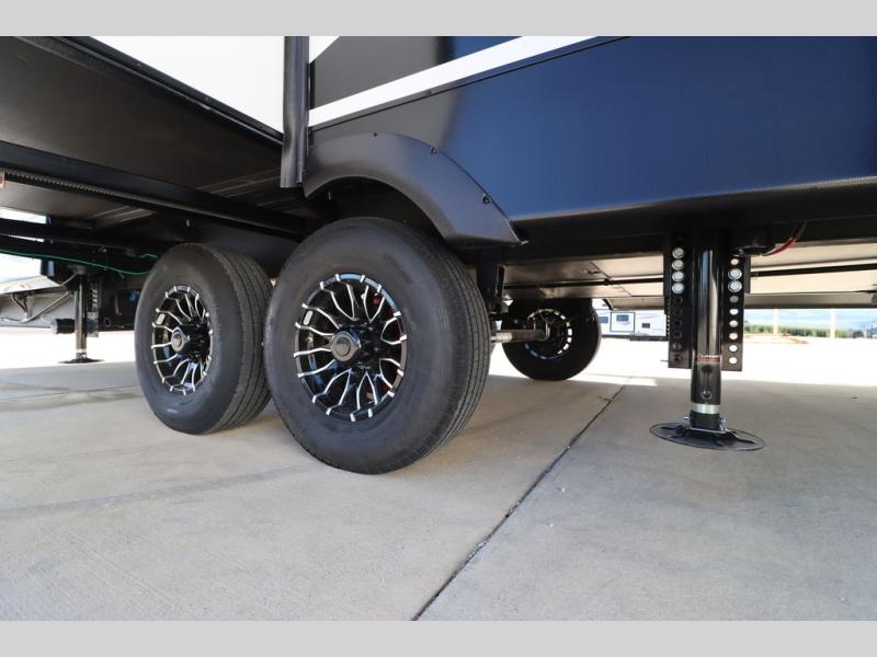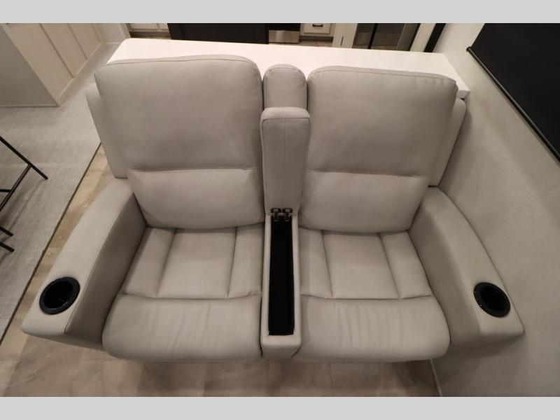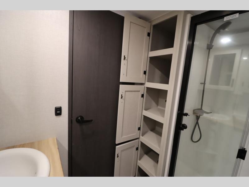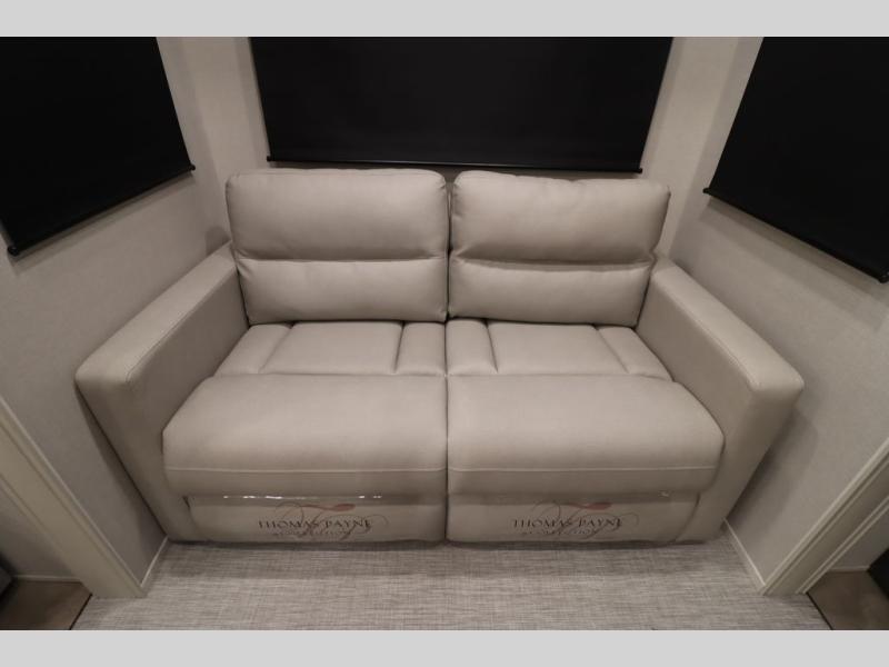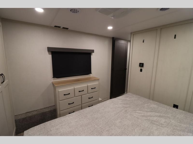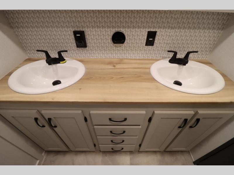 One look at this fifth wheel and you'll be sold. You'll find tons of counter space in the rear kitchen along with a kitchen island, a large pantry, and a hutch for even more storage. Visit in the main living area on the two theater seats and tri-fold sofa, or you may want to head outdoors under the two power awnings! There is even an outside refrigerator here to entertain guests. The spacious full bath will allow you to clean up after a day of adventuring, and here you'll find a full-size shower with sliding glass doors and a seat, plus a dual sink vanity. The front private bedroom will feel just like home with its king bed slide out, large wardrobe, and dresser to keep your clothes tidy.