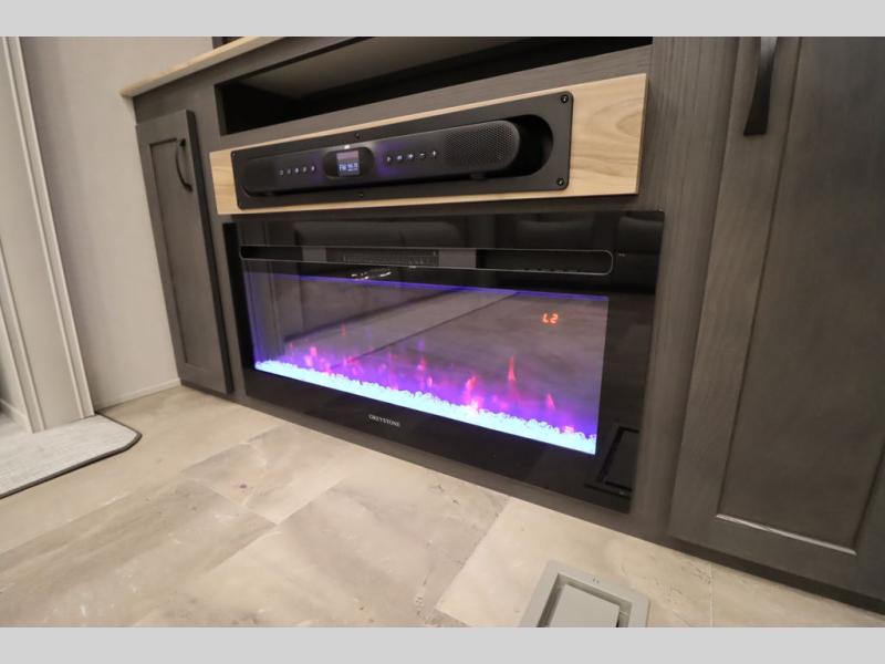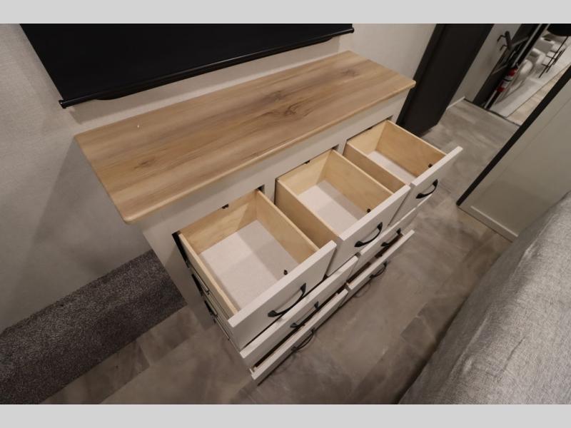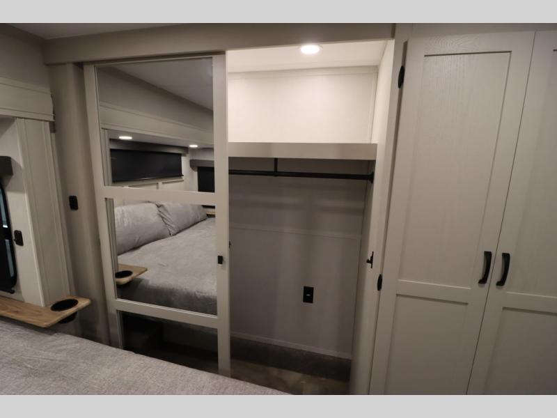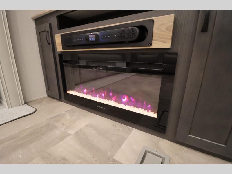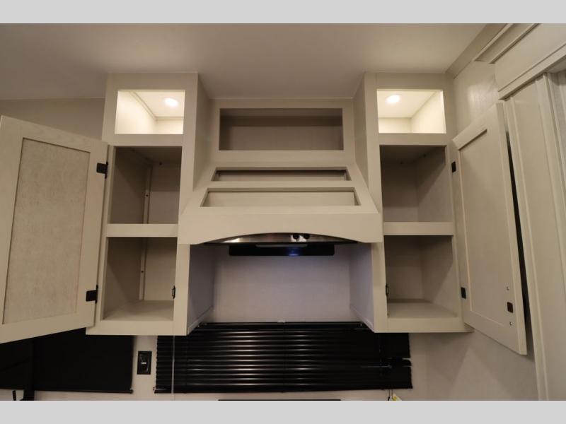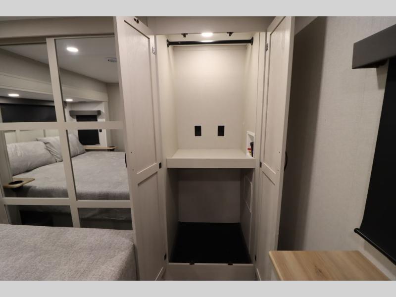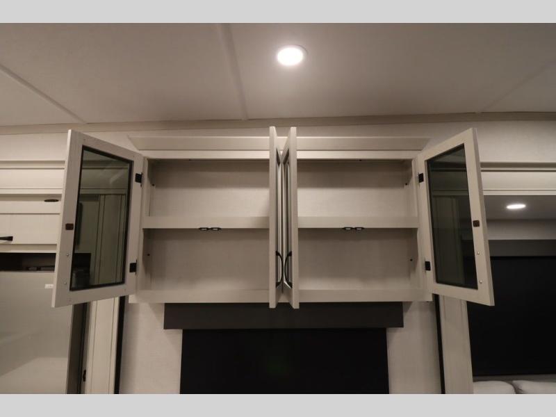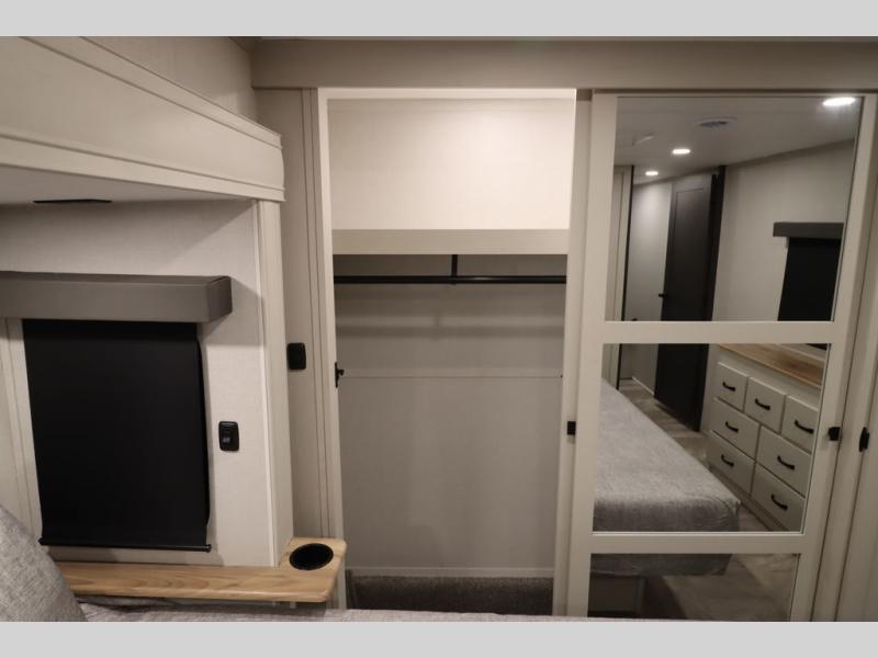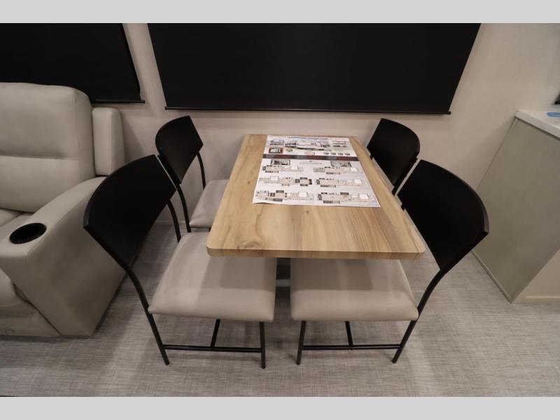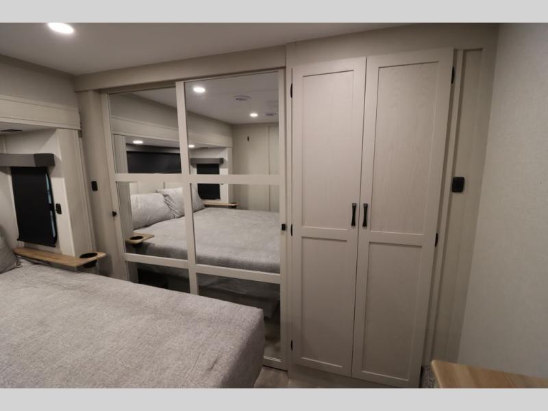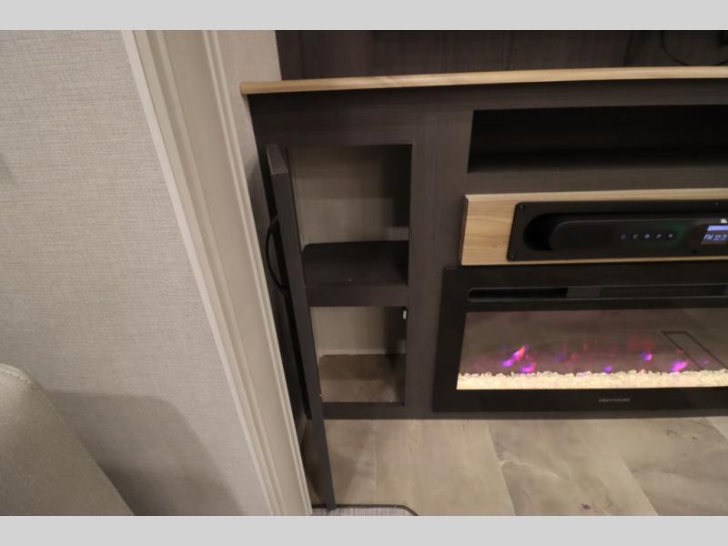 One look at this fifth wheel and you'll be sold. You'll find tons of counter space in the rear kitchen along with a kitchen island, a large pantry, and a hutch for even more storage. Visit in the main living area on the two theater seats and tri-fold sofa, or you may want to head outdoors under the two power awnings! There is even an outside refrigerator here to entertain guests. The spacious full bath will allow you to clean up after a day of adventuring, and here you'll find a full-size shower with sliding glass doors and a seat, plus a dual sink vanity. The front private bedroom will feel just like home with its king bed slide out, large wardrobe, and dresser to keep your clothes tidy.