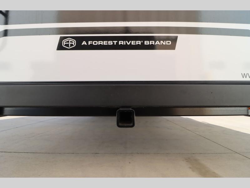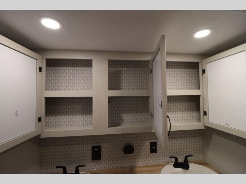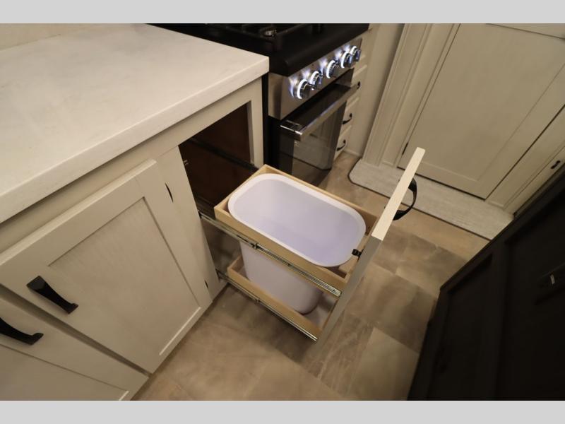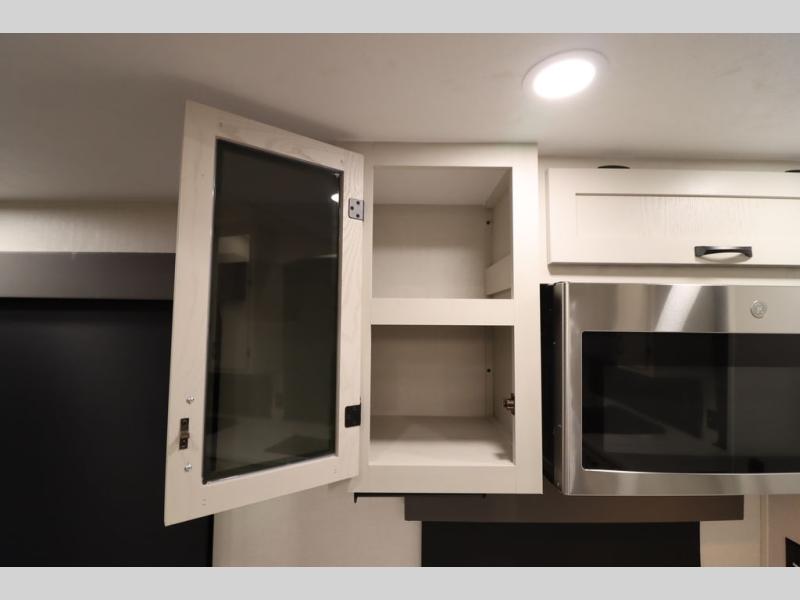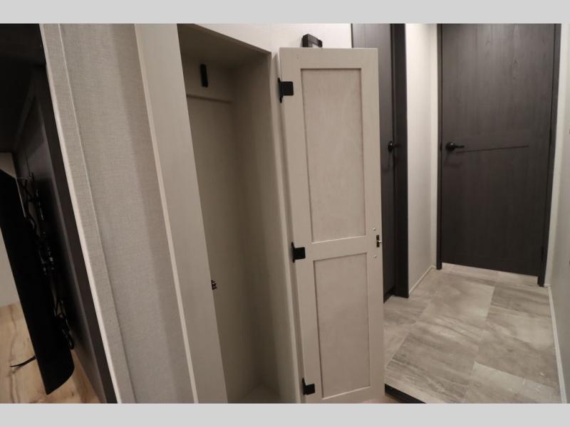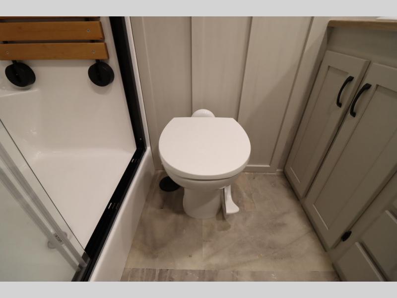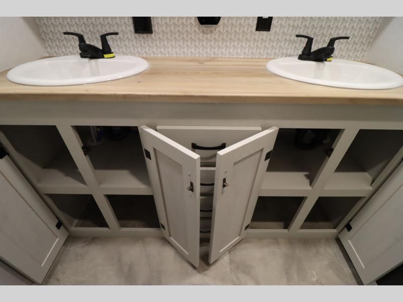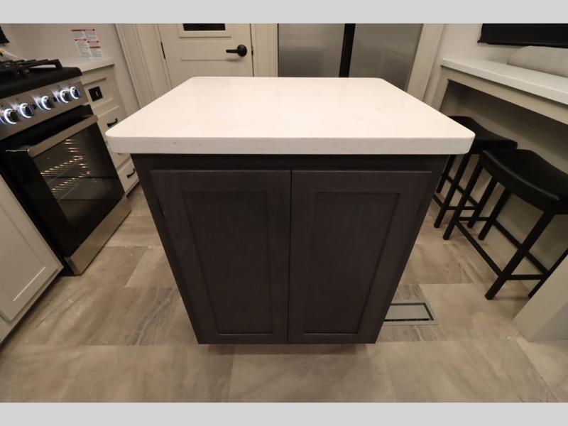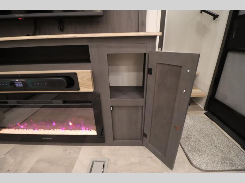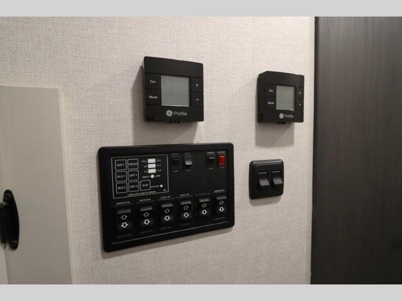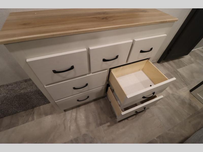 One look at this fifth wheel and you'll be sold. You'll find tons of counter space in the rear kitchen along with a kitchen island, a large pantry, and a hutch for even more storage. Visit in the main living area on the two theater seats and tri-fold sofa, or you may want to head outdoors under the two power awnings! There is even an outside refrigerator here to entertain guests. The spacious full bath will allow you to clean up after a day of adventuring, and here you'll find a full-size shower with sliding glass doors and a seat, plus a dual sink vanity. The front private bedroom will feel just like home with its king bed slide out, large wardrobe, and dresser to keep your clothes tidy.