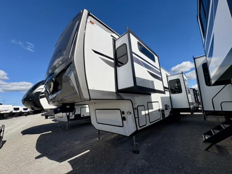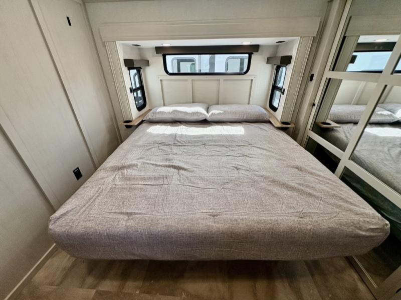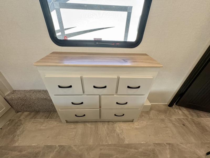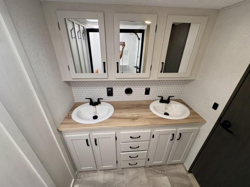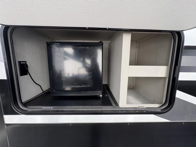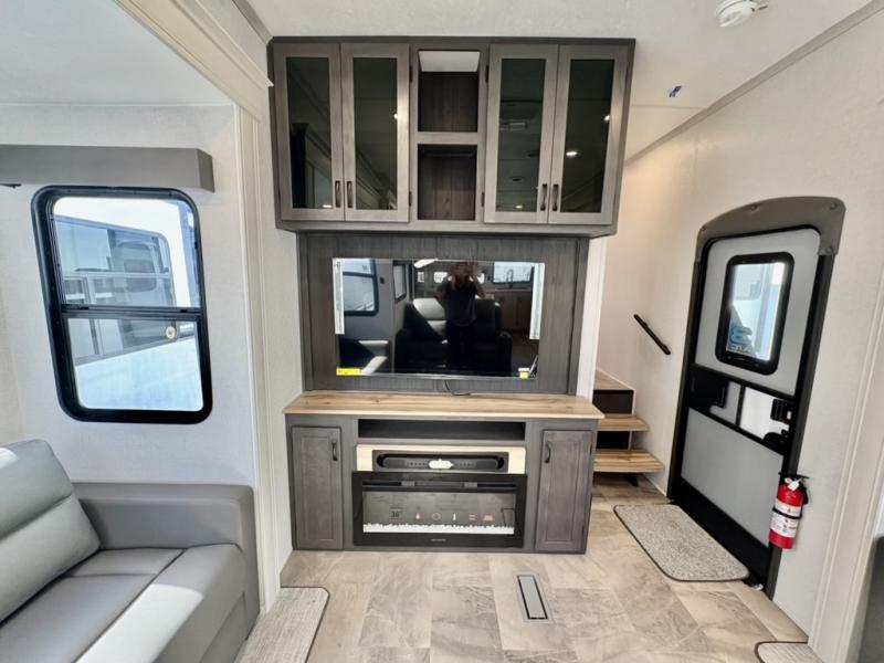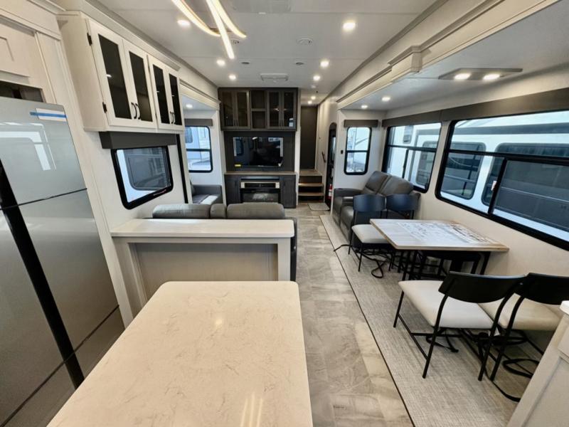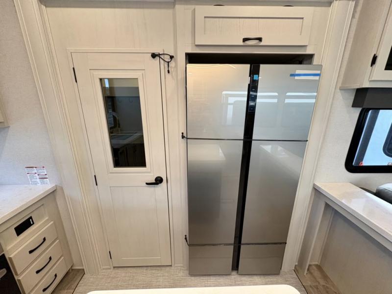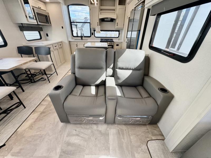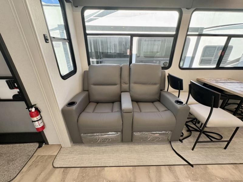 One look at this fifth wheel and you'll be sold. You'll find tons of counter space in the rear kitchen along with a kitchen island, a large pantry, and a hutch for even more storage. Visit in the main living area on the two theater seats and tri-fold sofa, or you may want to head outdoors under the two power awnings! There is even an outside refrigerator here to entertain guests. The spacious full bath will allow you to clean up after a day of adventuring, and here you'll find a full-size shower with sliding glass doors and a seat, plus a dual sink vanity. The front private bedroom will feel just like home with its king bed slide out, large wardrobe, and dresser to keep your clothes tidy.