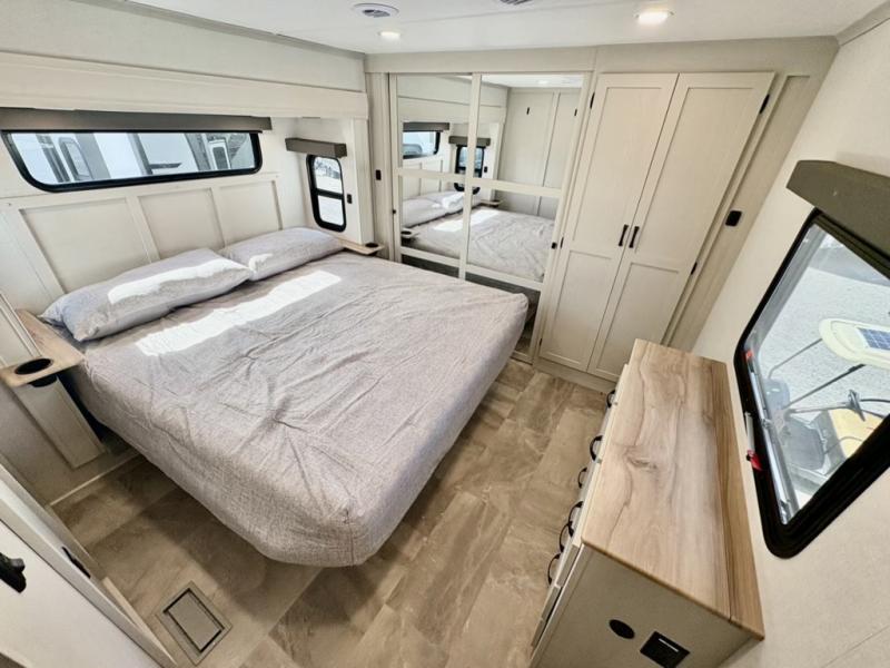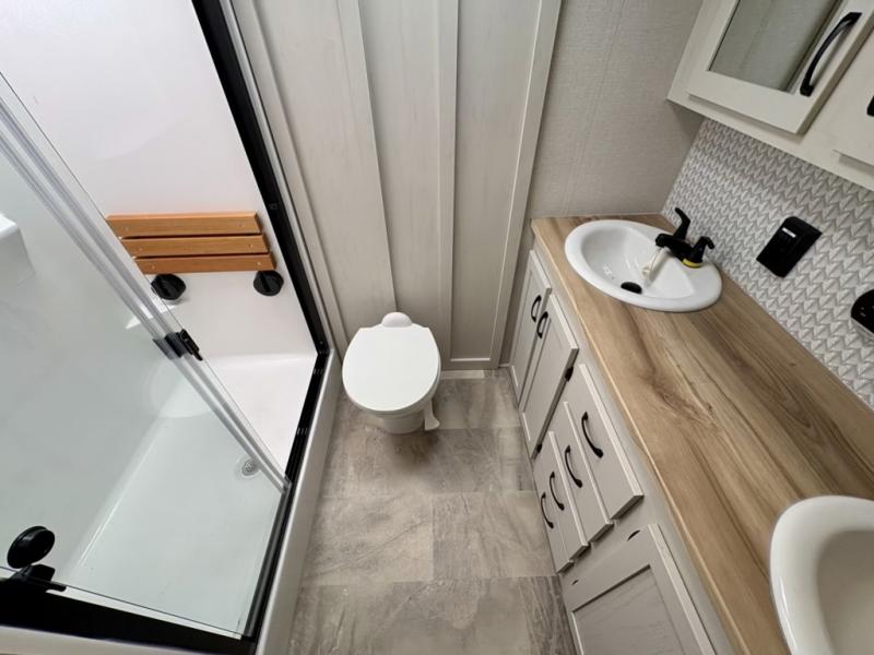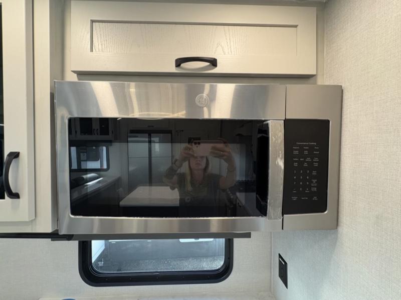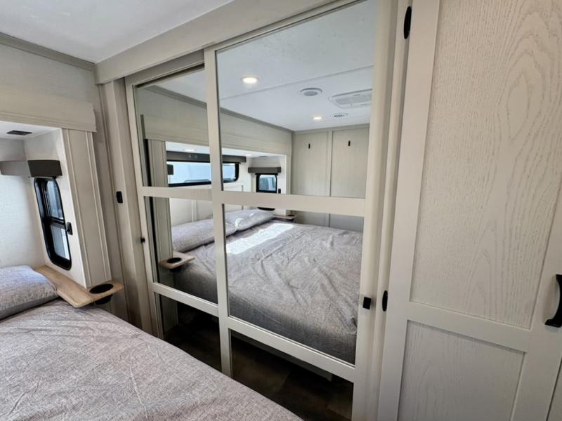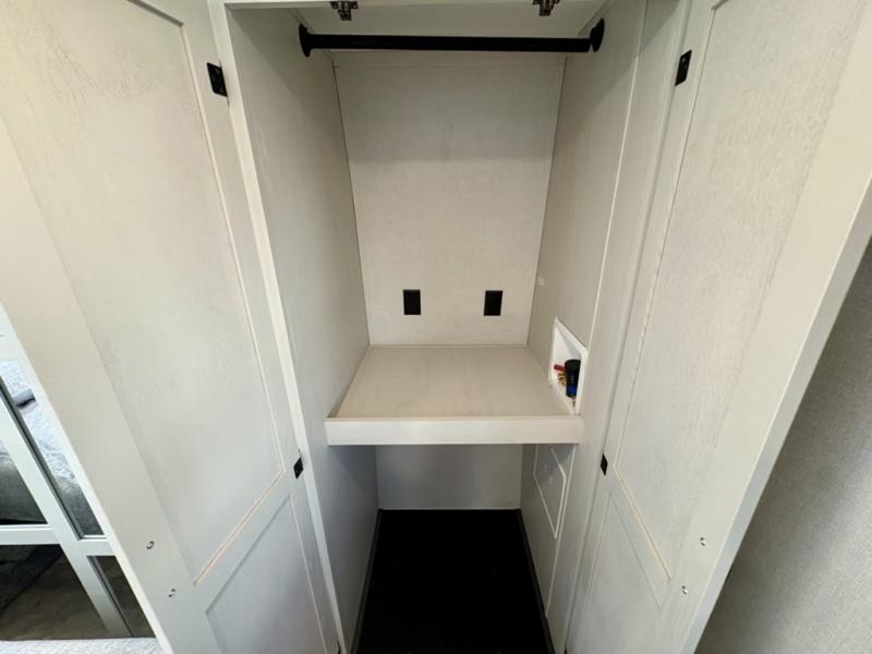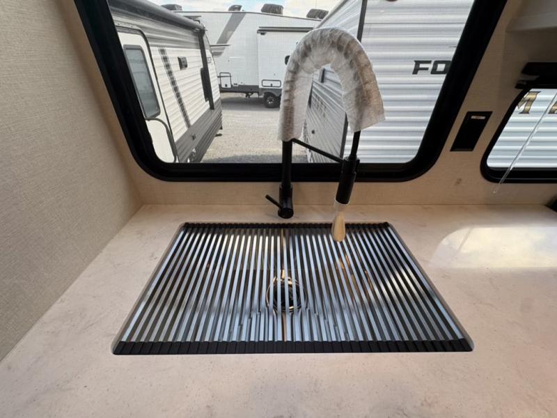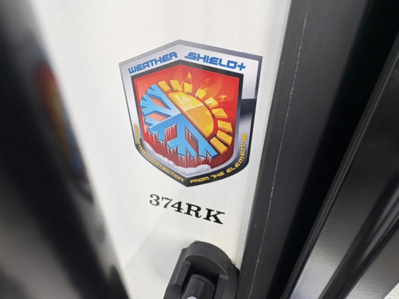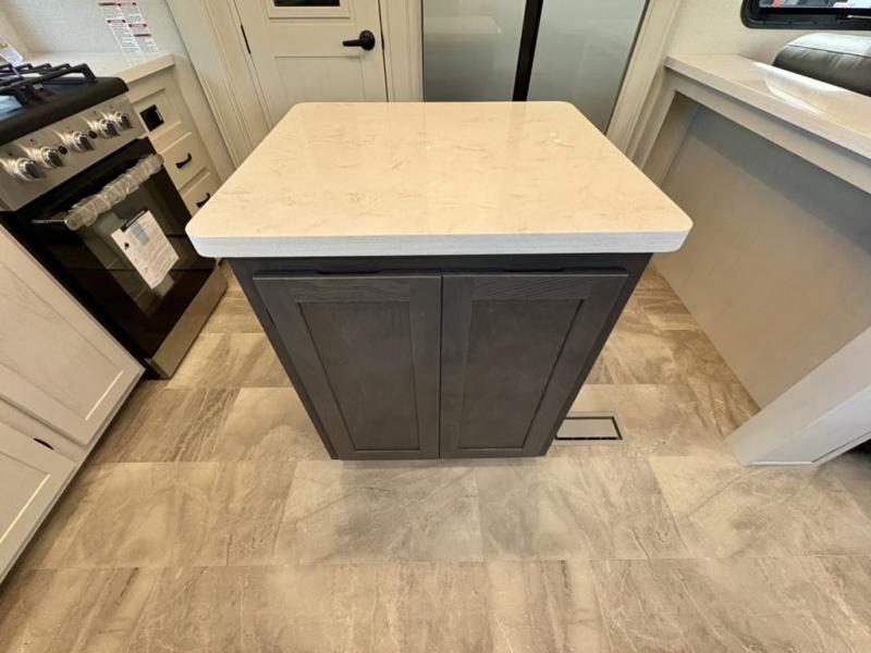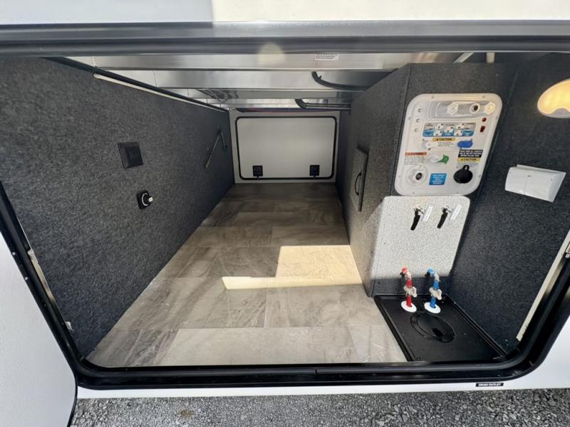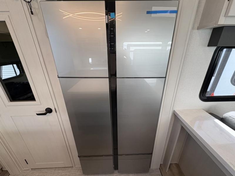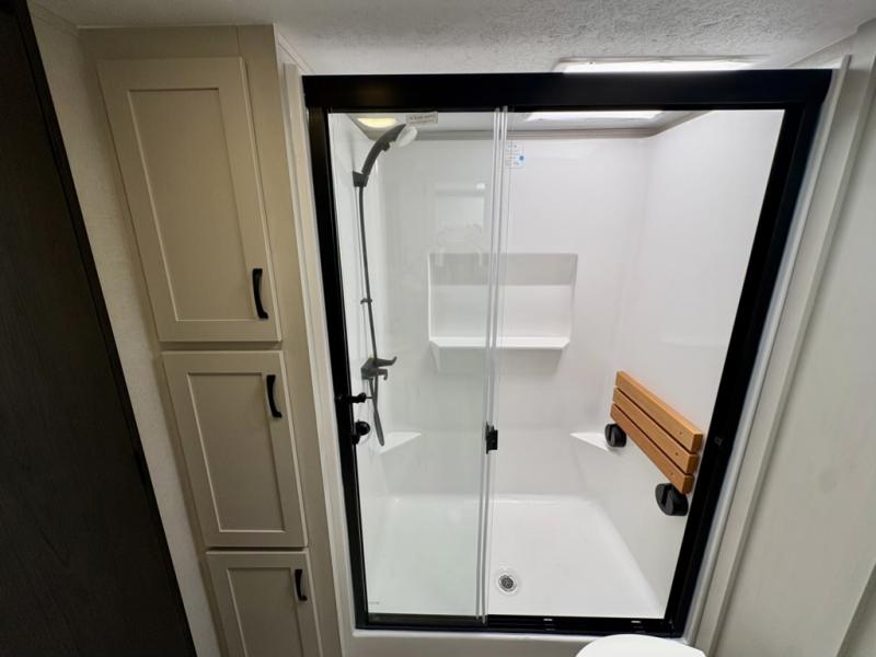 One look at this fifth wheel and you'll be sold. You'll find tons of counter space in the rear kitchen along with a kitchen island, a large pantry, and a hutch for even more storage. Visit in the main living area on the two theater seats and tri-fold sofa, or you may want to head outdoors under the two power awnings! There is even an outside refrigerator here to entertain guests. The spacious full bath will allow you to clean up after a day of adventuring, and here you'll find a full-size shower with sliding glass doors and a seat, plus a dual sink vanity. The front private bedroom will feel just like home with its king bed slide out, large wardrobe, and dresser to keep your clothes tidy.