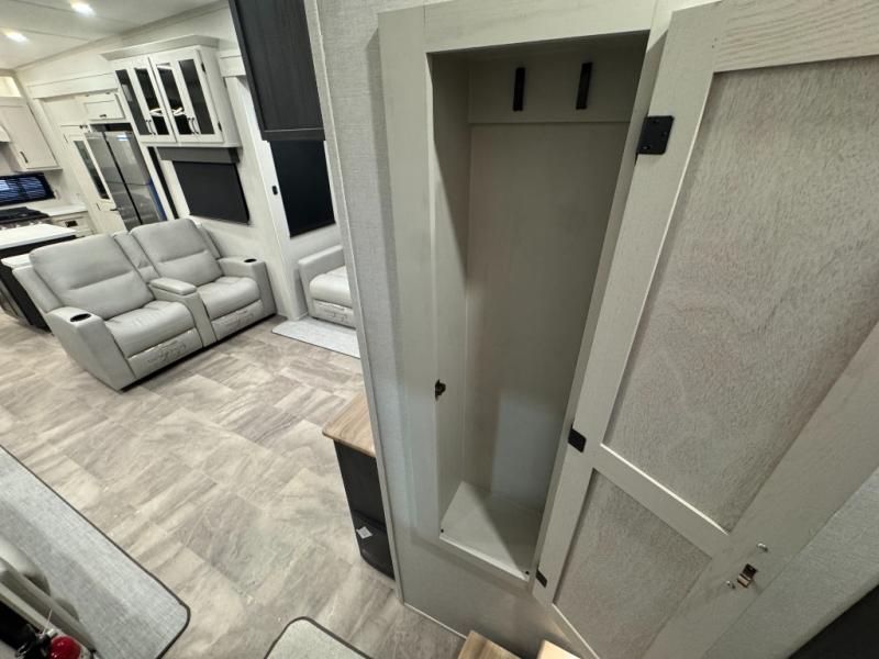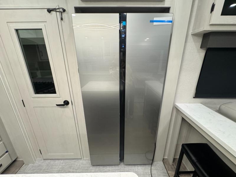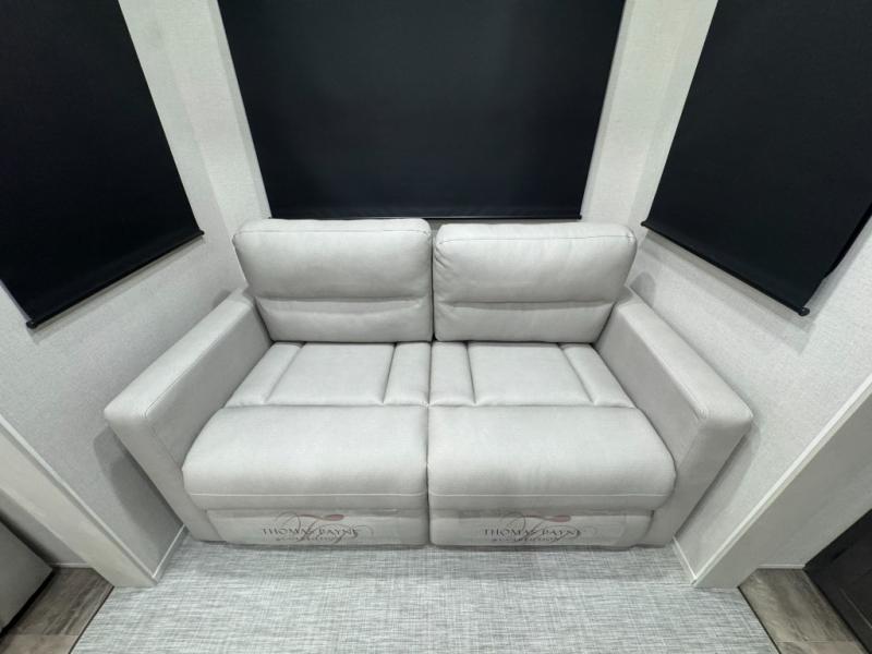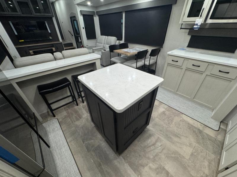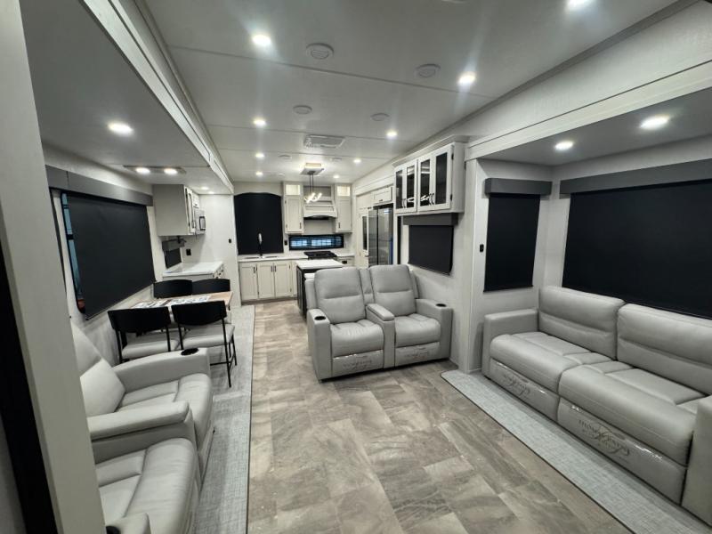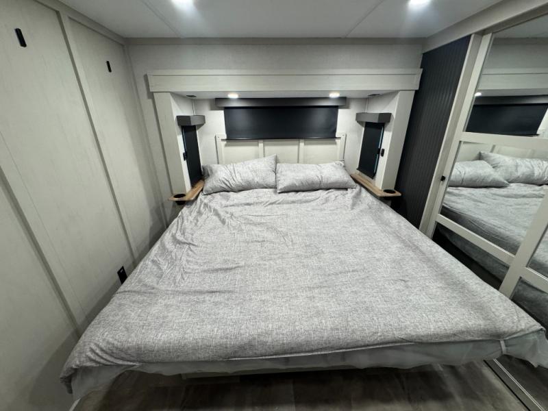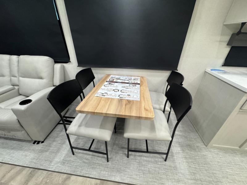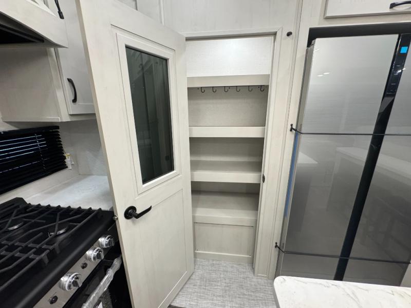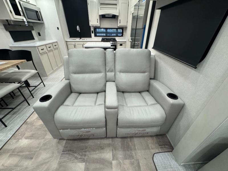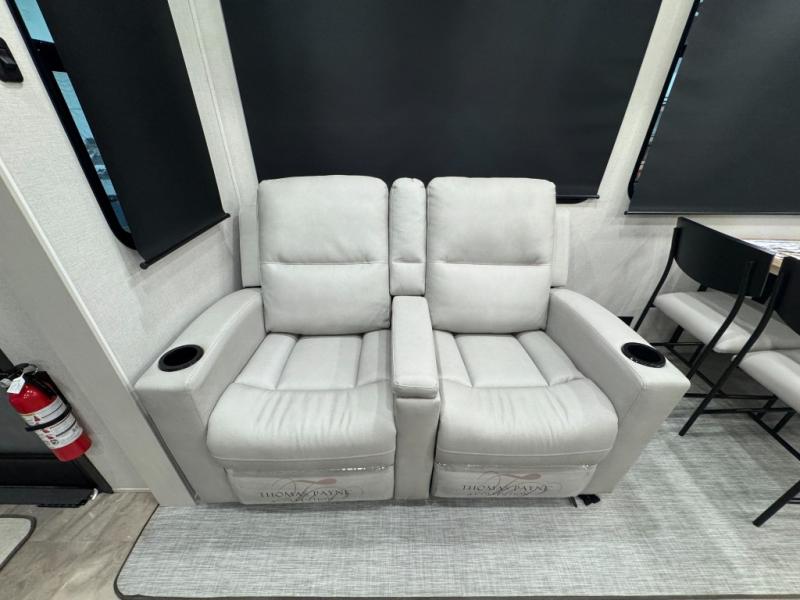 One look at this fifth wheel and you'll be sold. You'll find tons of counter space in the rear kitchen along with a kitchen island, a large pantry, and a hutch for even more storage. Visit in the main living area on the two theater seats and tri-fold sofa, or you may want to head outdoors under the two power awnings! There is even an outside refrigerator here to entertain guests. The spacious full bath will allow you to clean up after a day of adventuring, and here you'll find a full-size shower with sliding glass doors and a seat, plus a dual sink vanity. The front private bedroom will feel just like home with its king bed slide out, large wardrobe, and dresser to keep your clothes tidy.