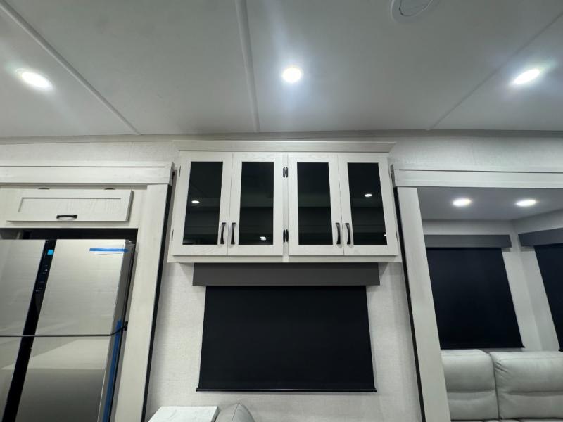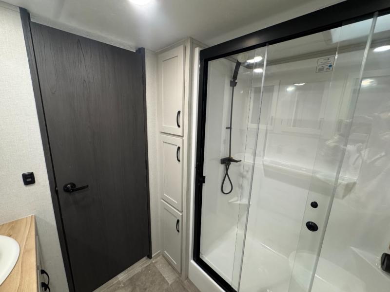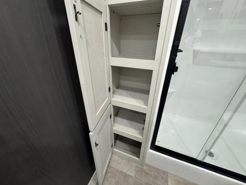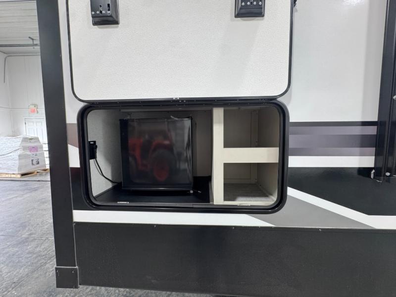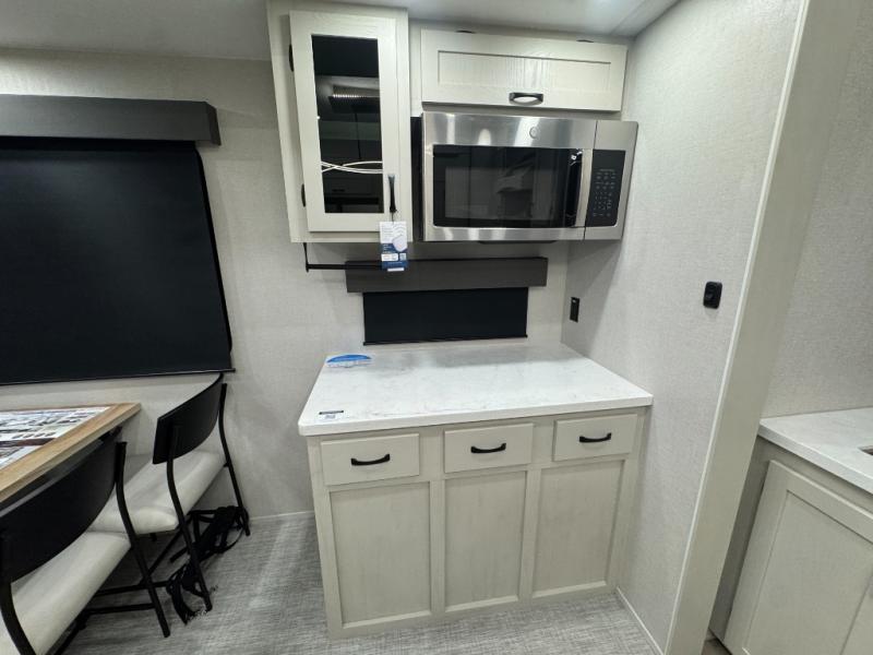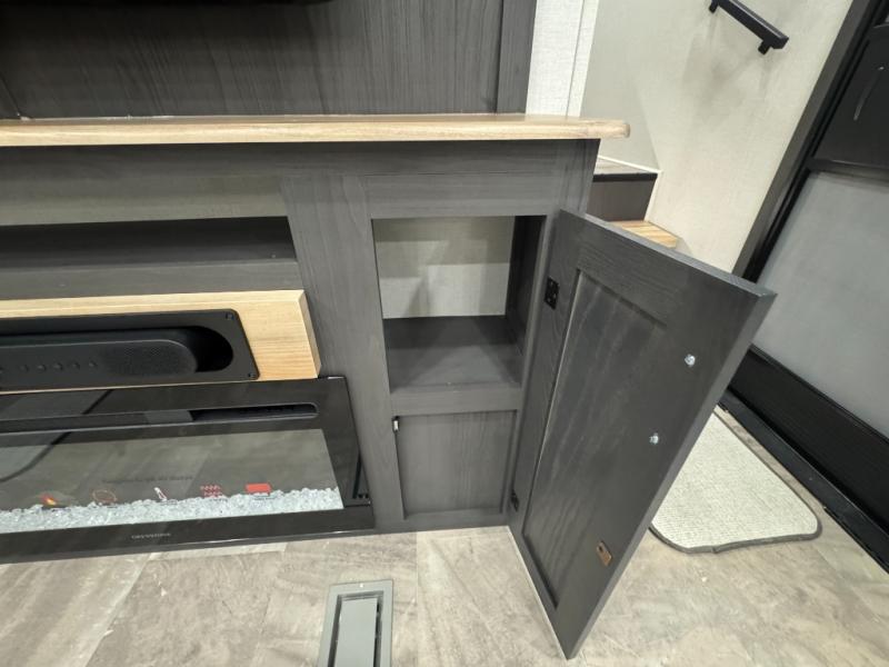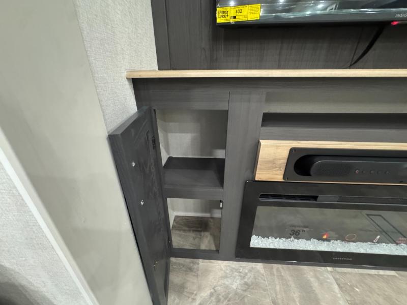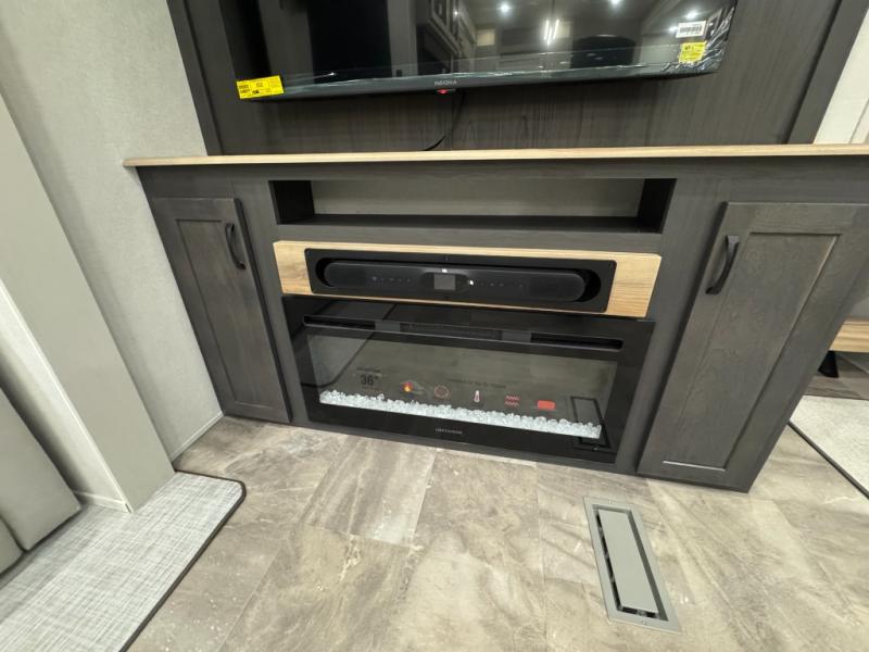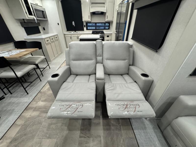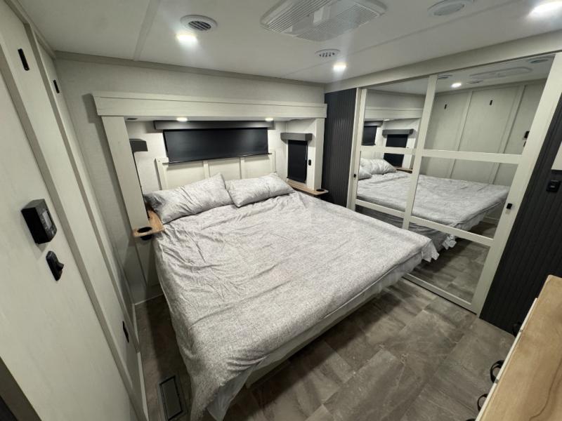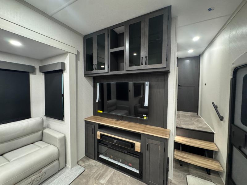 One look at this fifth wheel and you'll be sold. You'll find tons of counter space in the rear kitchen along with a kitchen island, a large pantry, and a hutch for even more storage. Visit in the main living area on the two theater seats and tri-fold sofa, or you may want to head outdoors under the two power awnings! There is even an outside refrigerator here to entertain guests. The spacious full bath will allow you to clean up after a day of adventuring, and here you'll find a full-size shower with sliding glass doors and a seat, plus a dual sink vanity. The front private bedroom will feel just like home with its king bed slide out, large wardrobe, and dresser to keep your clothes tidy.