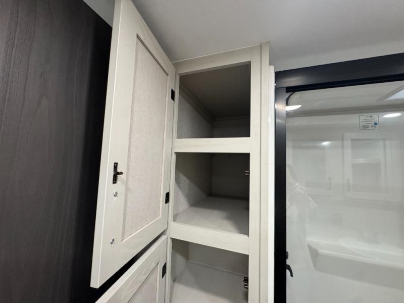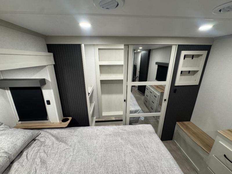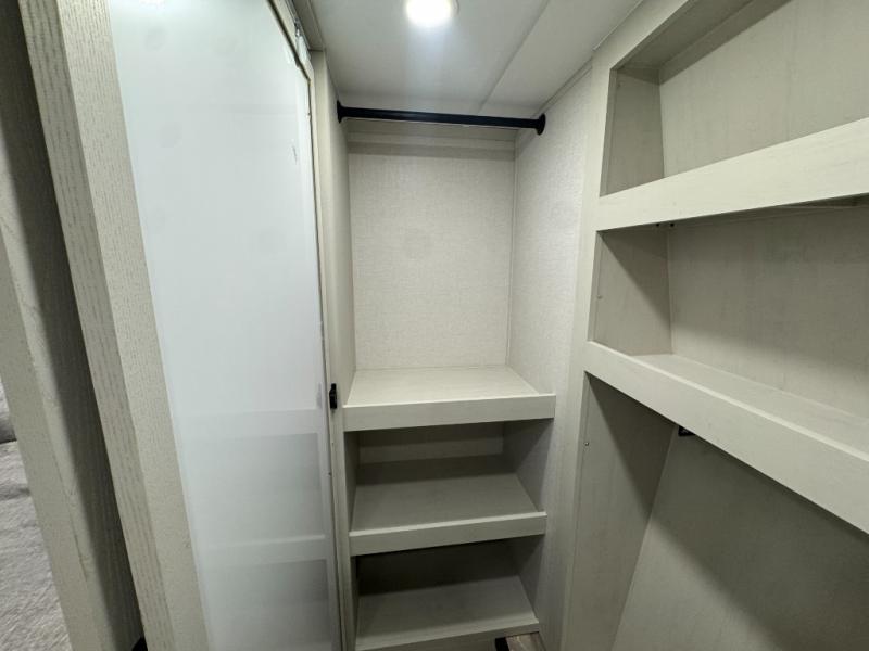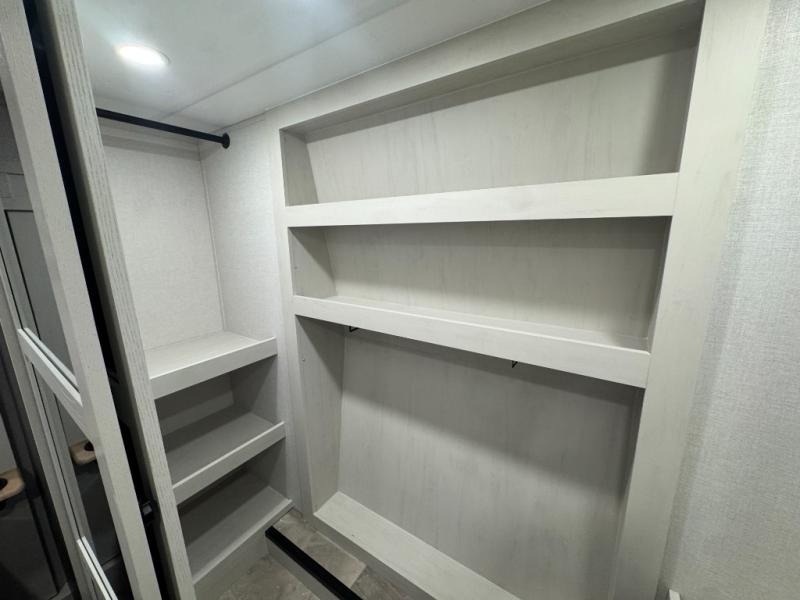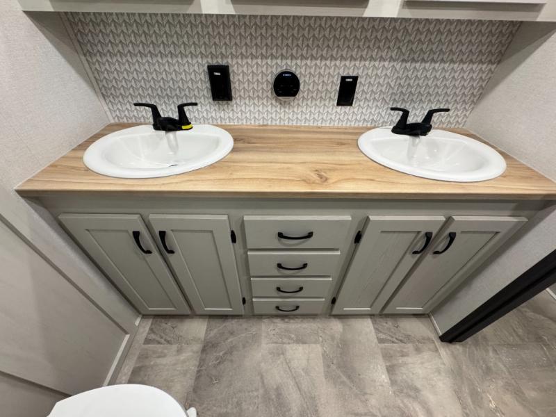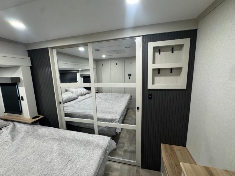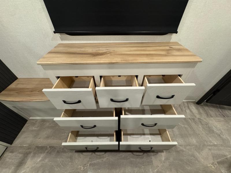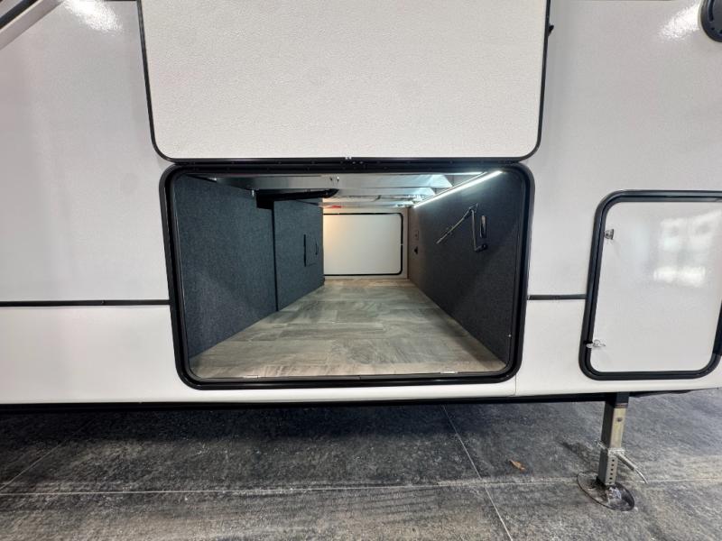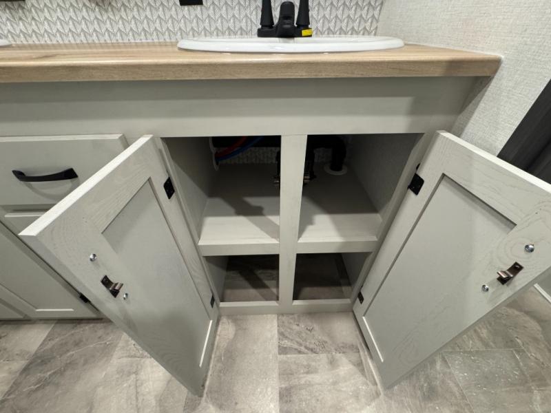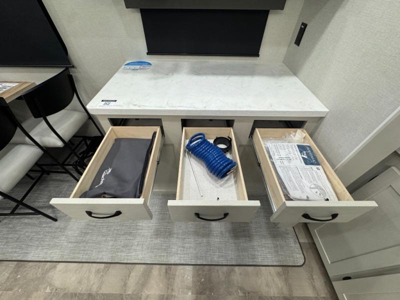One look at this fifth wheel and you'll be sold. You'll find tons of counter space in the rear kitchen along with a kitchen island, a large pantry, and a hutch for even more storage. Visit in the main living area on the two theater seats and tri-fold sofa, or you may want to head outdoors under the two power awnings! There is even an outside refrigerator here to entertain guests. The spacious full bath will allow you to clean up after a day of adventuring, and here you'll find a full-size shower with sliding glass doors and a seat, plus a dual sink vanity. The front private bedroom will feel just like home with its king bed slide out, large wardrobe, and dresser to keep your clothes tidy.