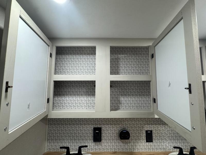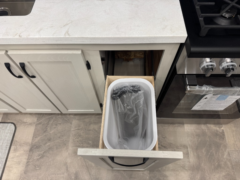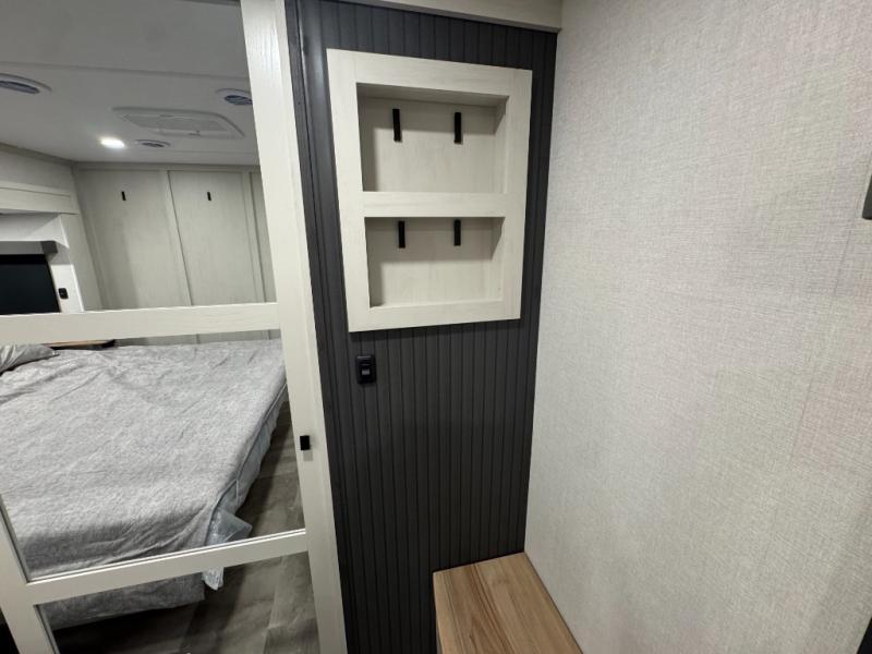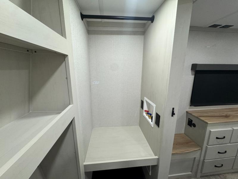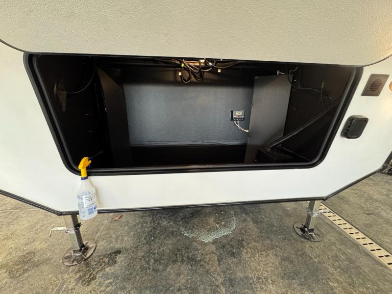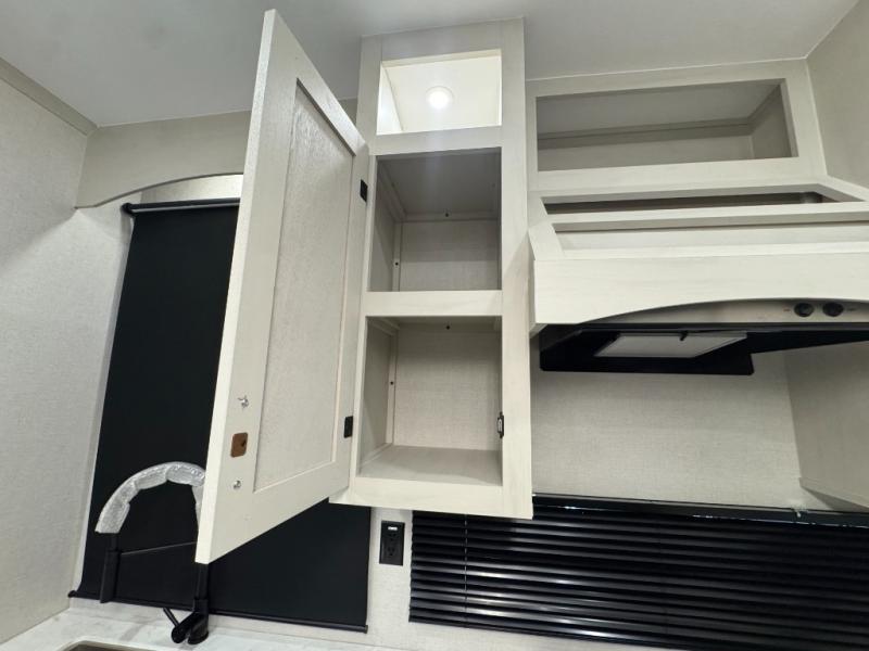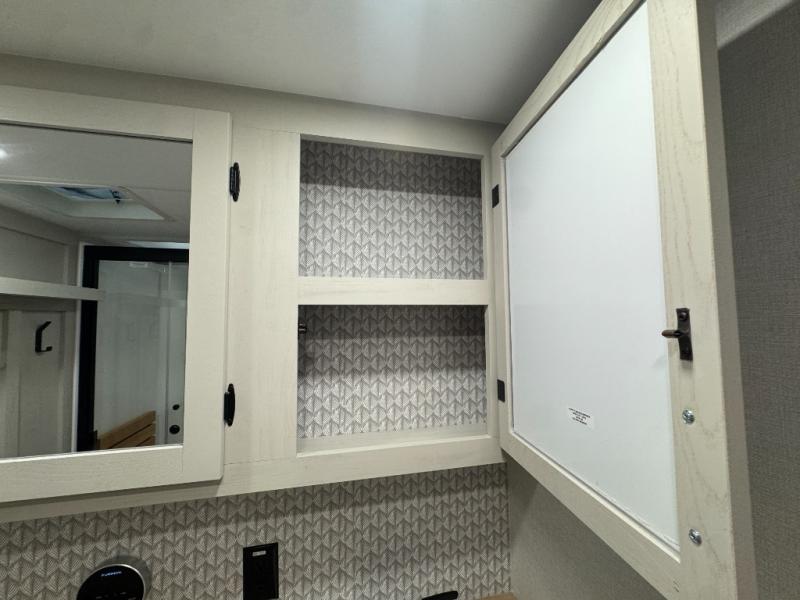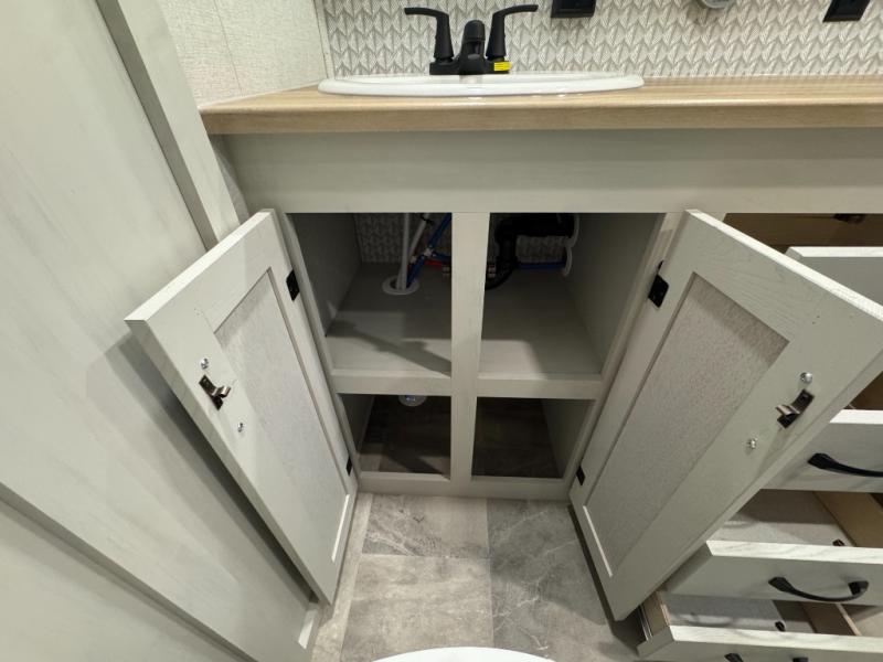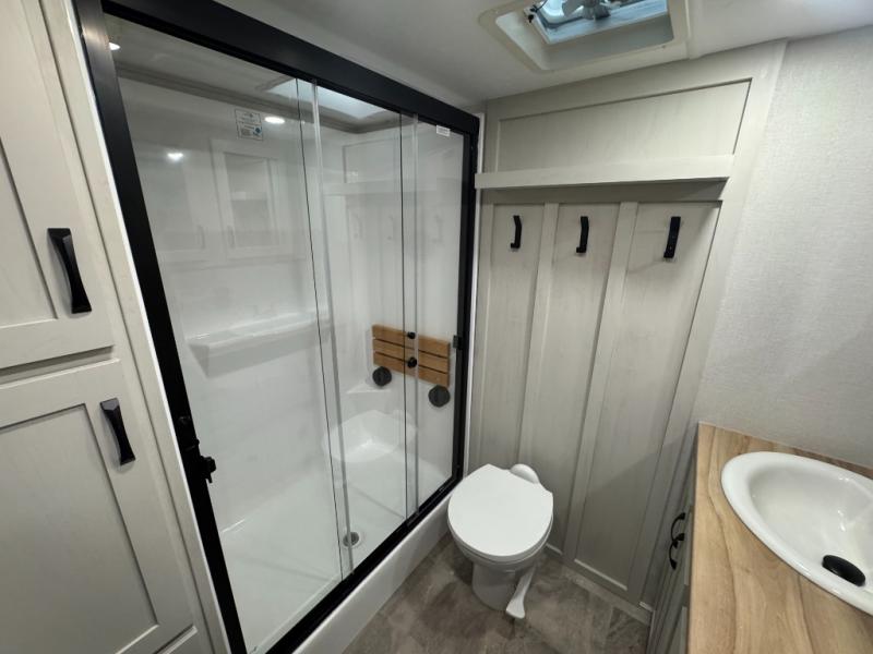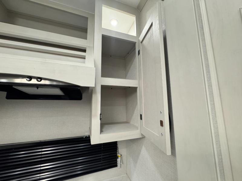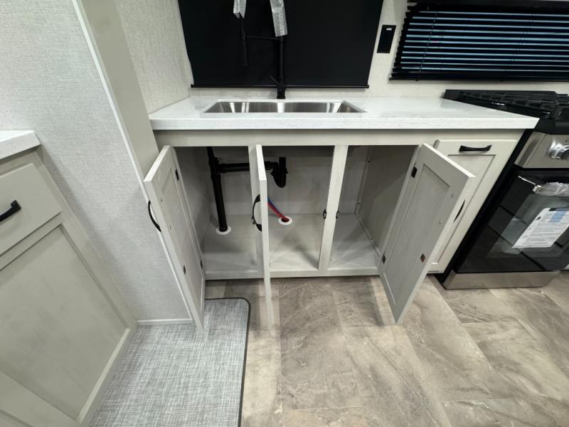 One look at this fifth wheel and you'll be sold. You'll find tons of counter space in the rear kitchen along with a kitchen island, a large pantry, and a hutch for even more storage. Visit in the main living area on the two theater seats and tri-fold sofa, or you may want to head outdoors under the two power awnings! There is even an outside refrigerator here to entertain guests. The spacious full bath will allow you to clean up after a day of adventuring, and here you'll find a full-size shower with sliding glass doors and a seat, plus a dual sink vanity. The front private bedroom will feel just like home with its king bed slide out, large wardrobe, and dresser to keep your clothes tidy.