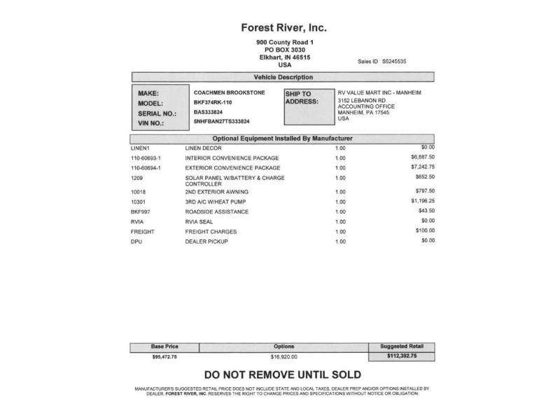 Coachmen Brookstone fifth wheel 374RK highlights: