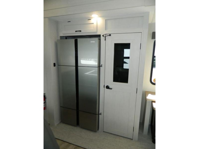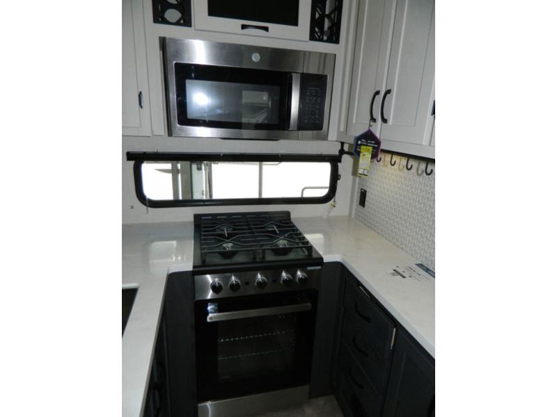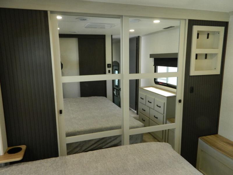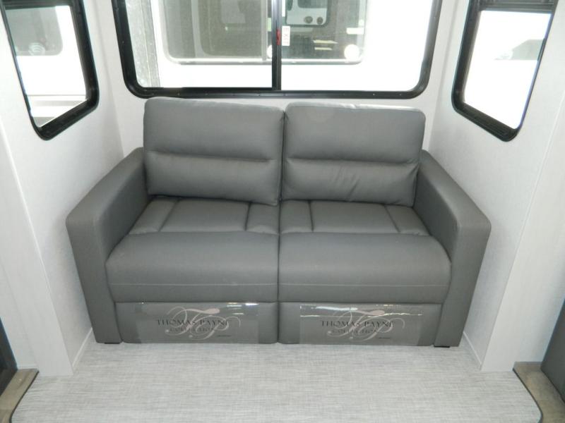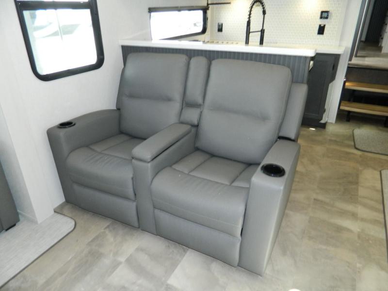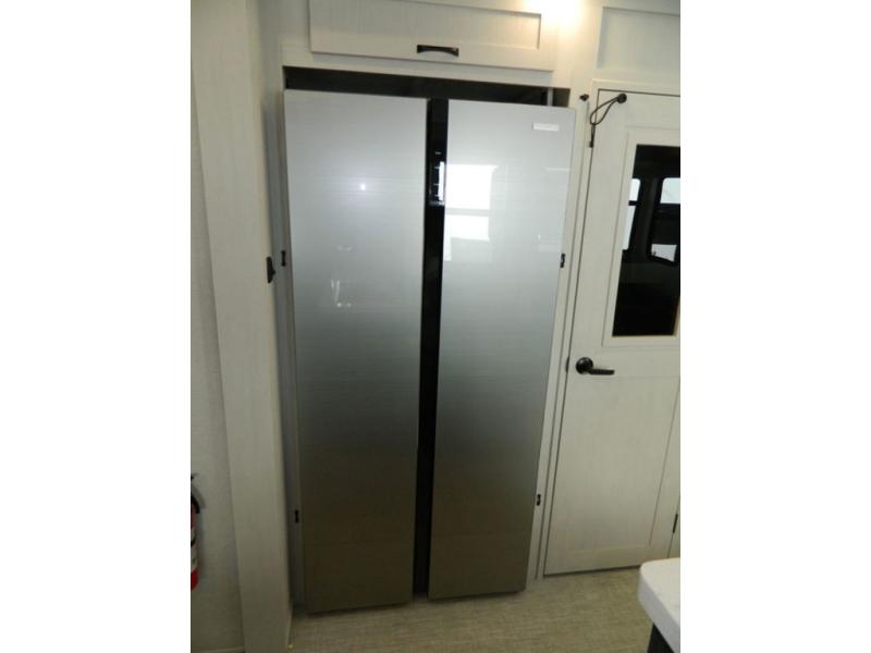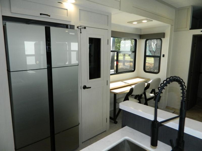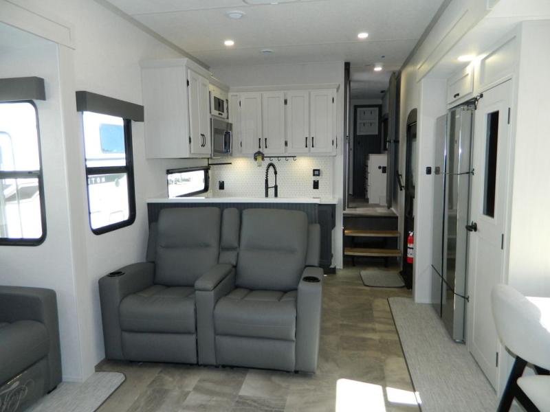 At the front of this fifth wheel, the main bedroom features a spacious king bed in a slide-out, paired with a walk-in closet, wardrobe, dresser, and bench to keep everything organized and make mornings effortless. The adjoining bathroom that is accessible from both the bedroom and hallway, includes a shower with a teak flip-down seat, sliding glass door, and a high-rise porcelain toilet with foot flush. Down the hall, the U-shaped kitchen offers solid-surface countertops, an aluminum roll-up drying rack/sink cover, an extra-deep single-basin sink, a 30" stainless microwave, a 24" four-burner range with oven, a large pantry, and a 16-cu. ft. stainless-glass 12V refrigerator in a slide-out. Nearby, the multi-functional slide/swivel table with a fixed bar creates a perfect spot for meals, games, or work. Across from it, the living area includes a tri-fold hide-a-bed sofa and theater seating facing the entertainment center. At the rear, the second bedroom provides a queen bed in a slide-out and ample storage with a dresser and dual wardrobes, while the second full bathroom, with its own exterior entry adds convenience and accessibility.