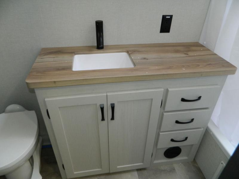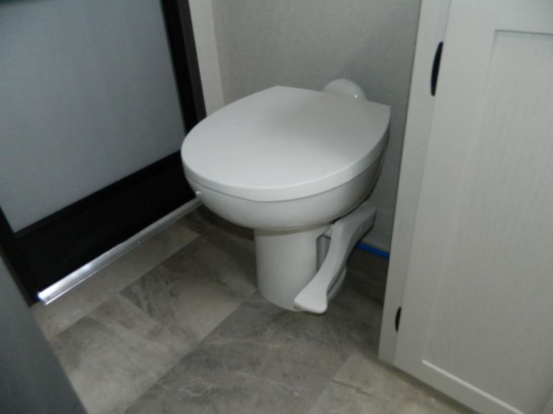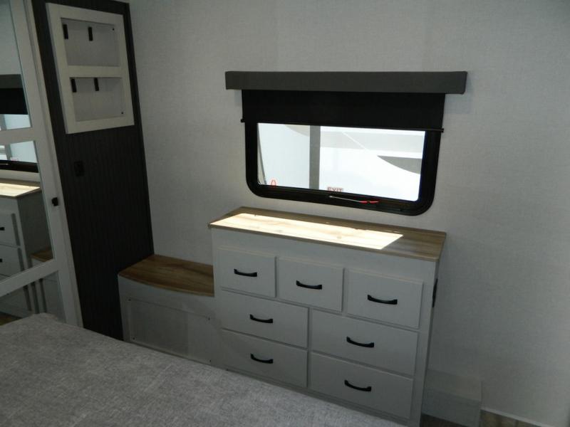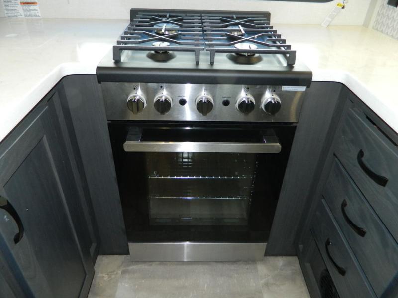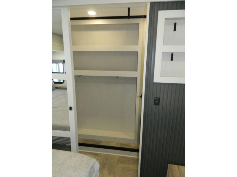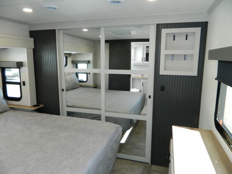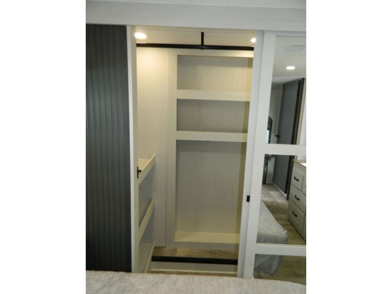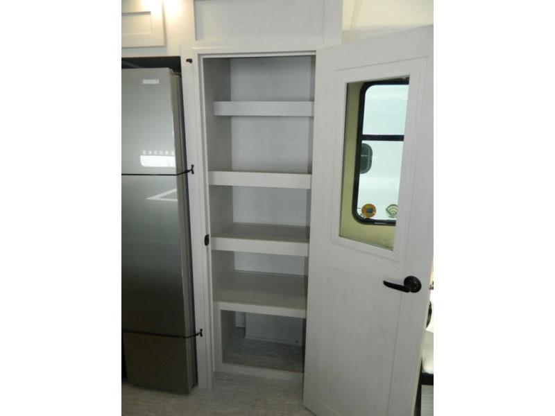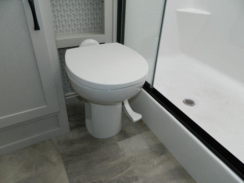 At the front of this fifth wheel, the main bedroom features a spacious king bed in a slide-out, paired with a walk-in closet, wardrobe, dresser, and bench to keep everything organized and make mornings effortless. The adjoining bathroom that is accessible from both the bedroom and hallway, includes a shower with a teak flip-down seat, sliding glass door, and a high-rise porcelain toilet with foot flush. Down the hall, the U-shaped kitchen offers solid-surface countertops, an aluminum roll-up drying rack/sink cover, an extra-deep single-basin sink, a 30" stainless microwave, a 24" four-burner range with oven, a large pantry, and a 16-cu. ft. stainless-glass 12V refrigerator in a slide-out. Nearby, the multi-functional slide/swivel table with a fixed bar creates a perfect spot for meals, games, or work. Across from it, the living area includes a tri-fold hide-a-bed sofa and theater seating facing the entertainment center. At the rear, the second bedroom provides a queen bed in a slide-out and ample storage with a dresser and dual wardrobes, while the second full bathroom, with its own exterior entry adds convenience and accessibility.