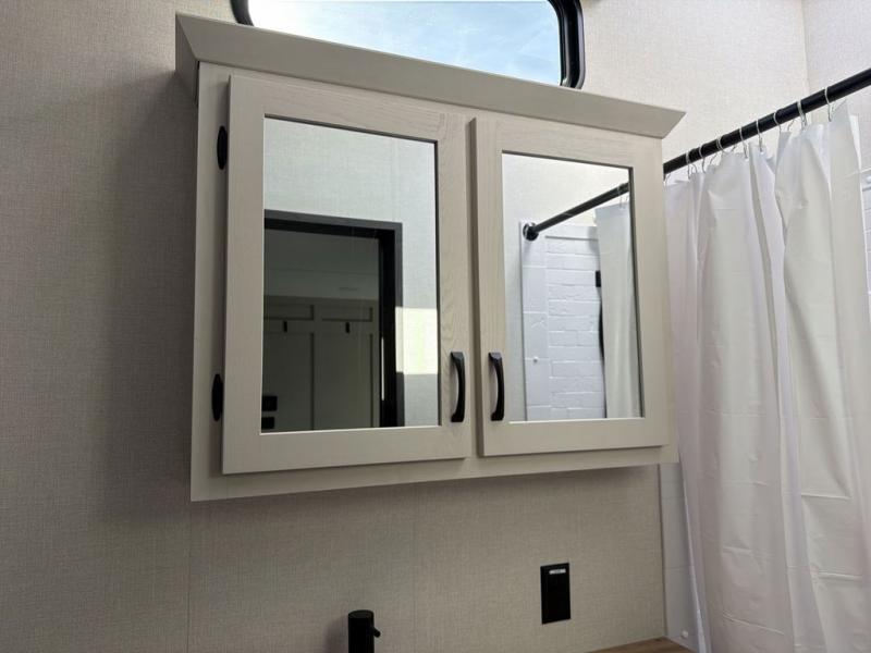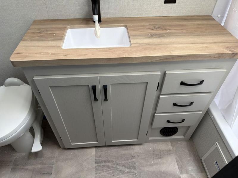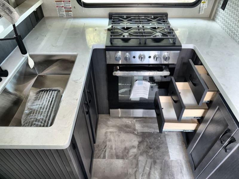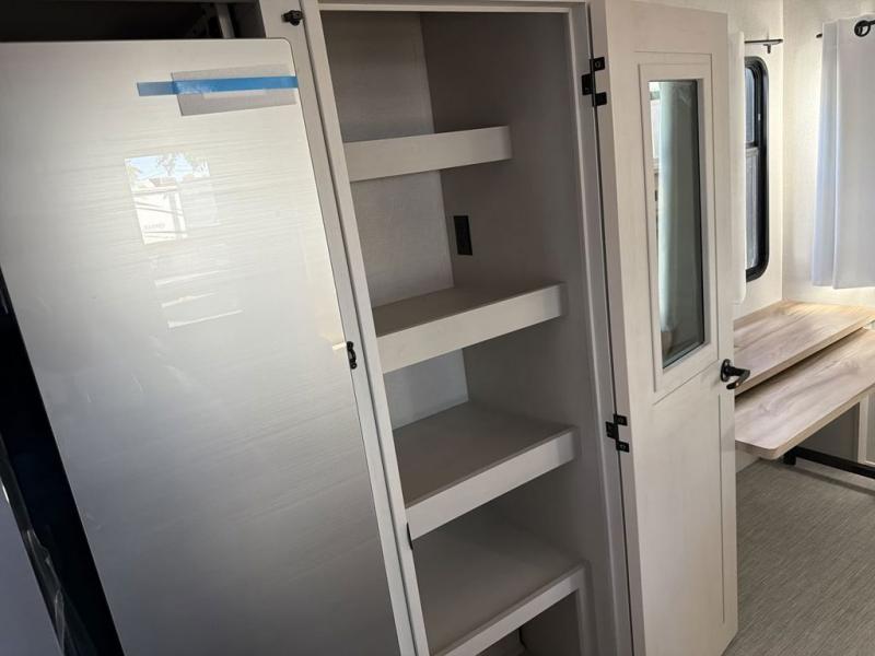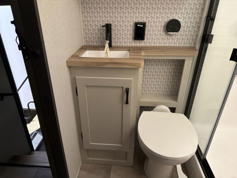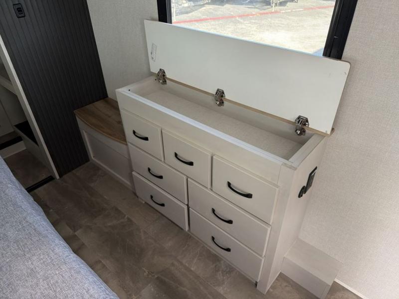 At the front of this fifth wheel, the main bedroom features a spacious king bed in a slide-out, paired with a walk-in closet, wardrobe, dresser, and bench to keep everything organized and make mornings effortless. The adjoining bathroom that is accessible from both the bedroom and hallway, includes a shower with a teak flip-down seat, sliding glass door, and a high-rise porcelain toilet with foot flush. Down the hall, the U-shaped kitchen offers solid-surface countertops, an aluminum roll-up drying rack/sink cover, an extra-deep single-basin sink, a 30" stainless microwave, a 24" four-burner range with oven, a large pantry, and a 16-cu. ft. stainless-glass 12V refrigerator in a slide-out. Nearby, the multi-functional slide/swivel table with a fixed bar creates a perfect spot for meals, games, or work. Across from it, the living area includes a tri-fold hide-a-bed sofa and theater seating facing the entertainment center. At the rear, the second bedroom provides a queen bed in a slide-out and ample storage with a dresser and dual wardrobes, while the second full bathroom, with its own exterior entry adds convenience and accessibility.