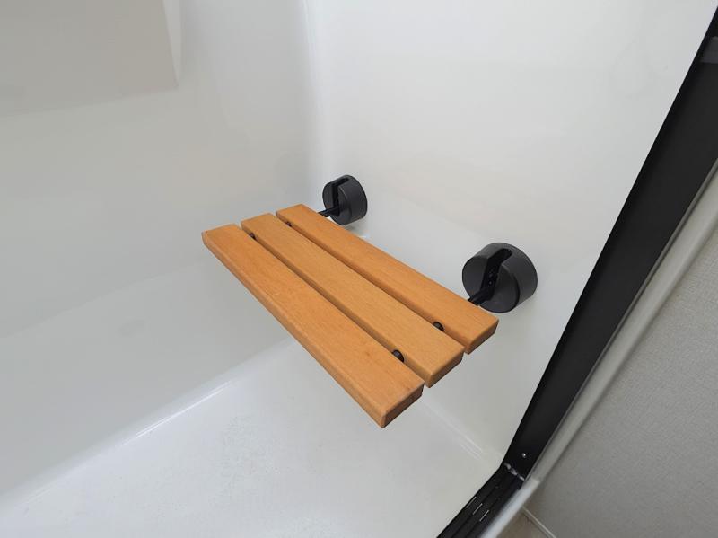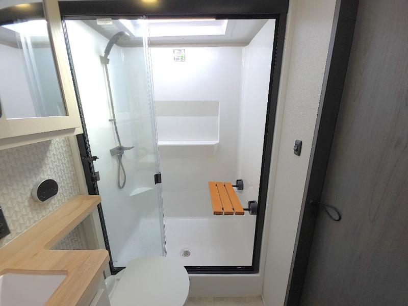 The front bedroom features a king bed in a roomy slide-out, a walk-in closet, dresser, bench seating, and a wardrobe for easy organization. The adjoining full bath includes a shower with teak flip-down seat, sliding glass door, and a porcelain foot flush toilet. Dual access from both the bedroom and hallway makes mornings simple.