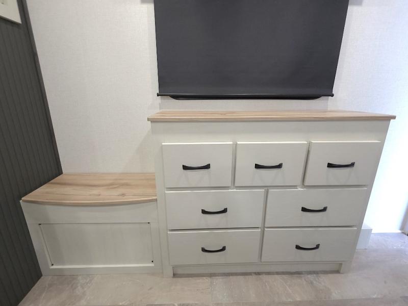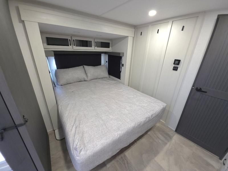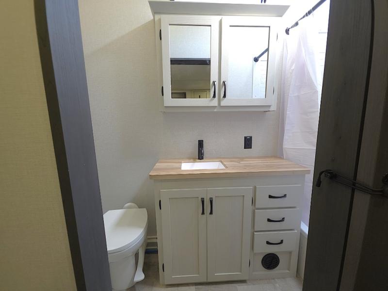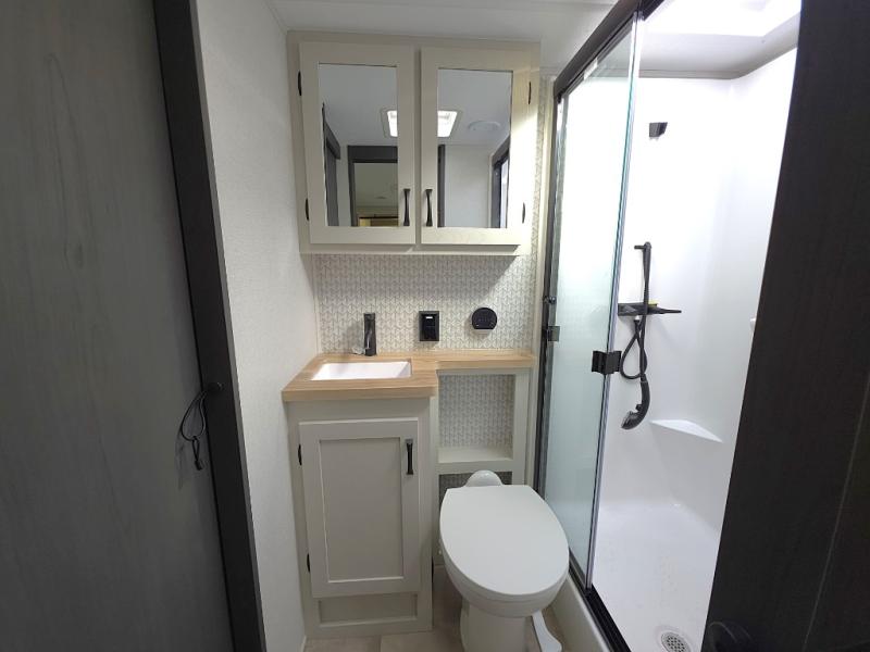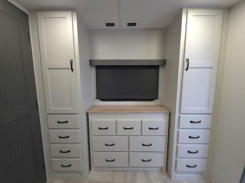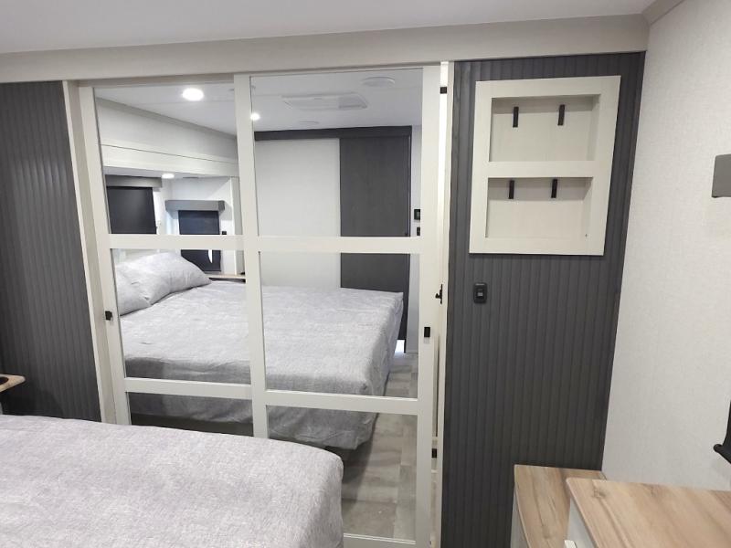 A second full bedroom at the rear offers a queen bed slide-out plus generous storage with a dresser and dual wardrobes. Just steps away, the second full bathroom includes its own exterior entry door, adding convenience for guests, kids, or anyone returning from outdoor activities.