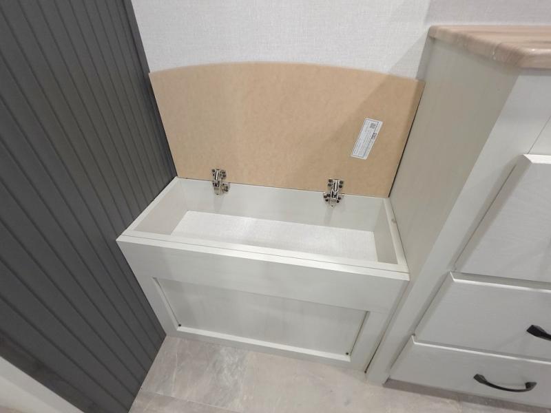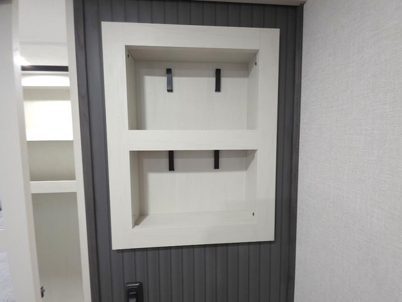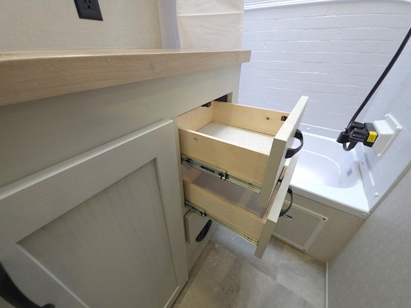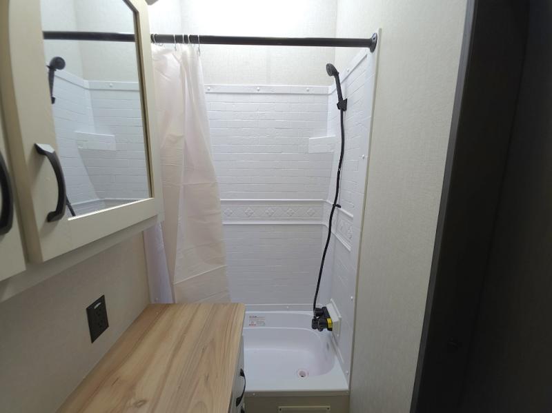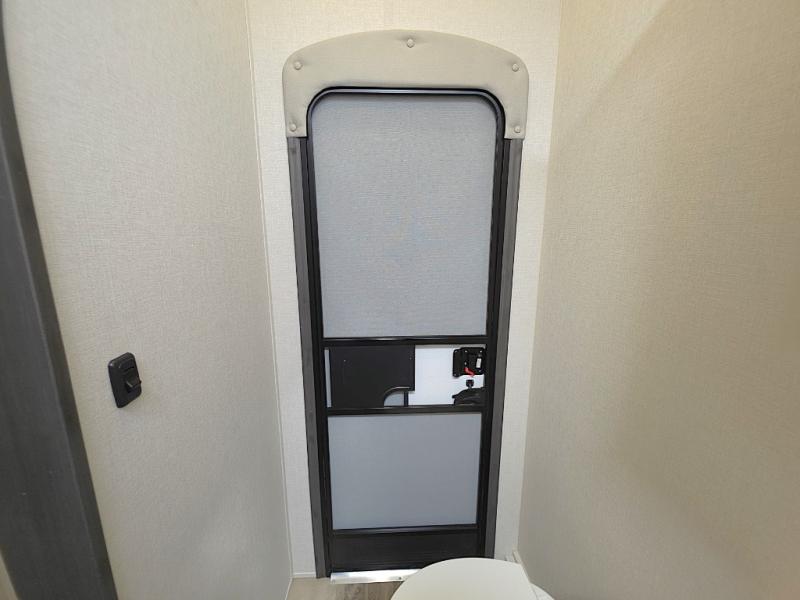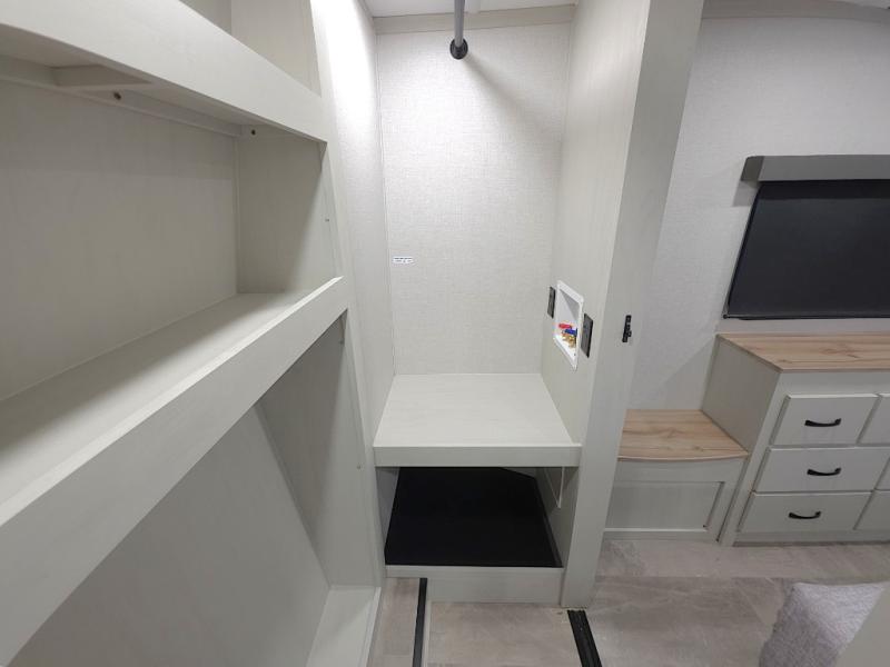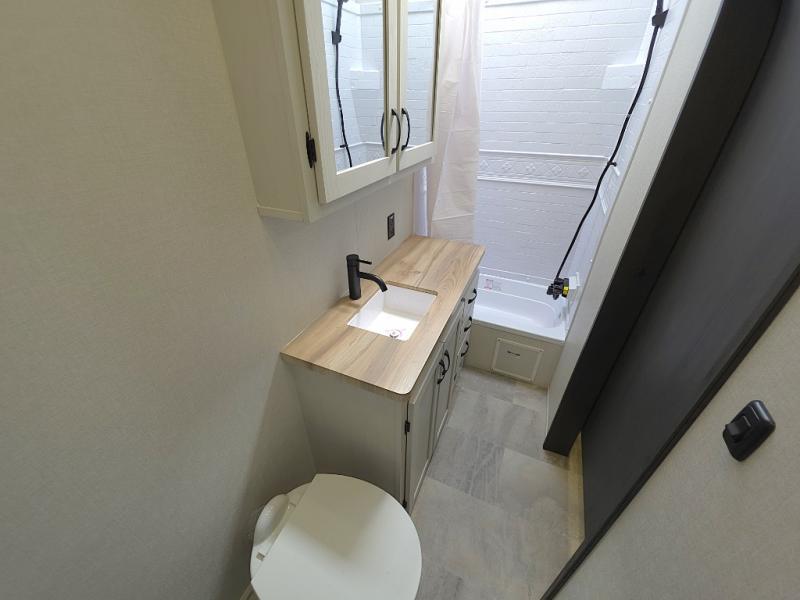 A second full bedroom at the rear offers a queen bed slide-out plus generous storage with a dresser and dual wardrobes. Just steps away, the second full bathroom includes its own exterior entry door, adding convenience for guests, kids, or anyone returning from outdoor activities.