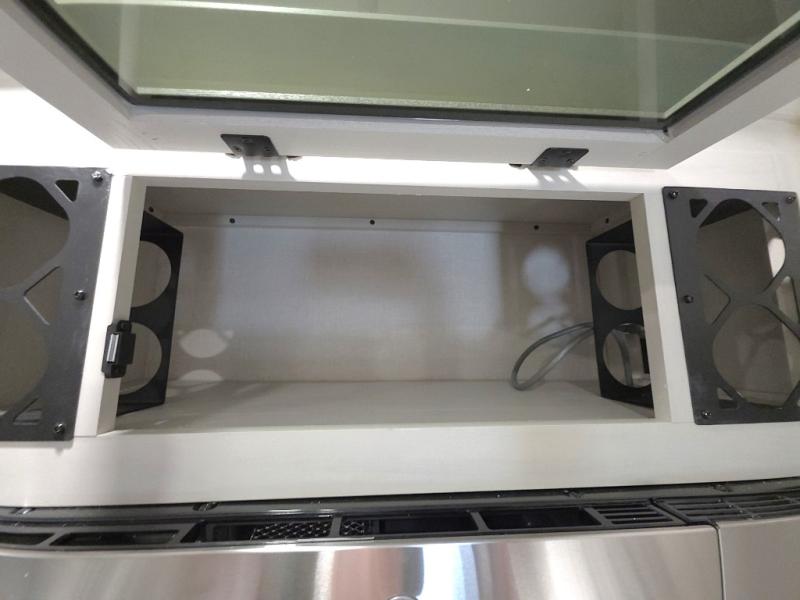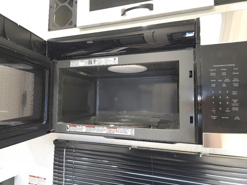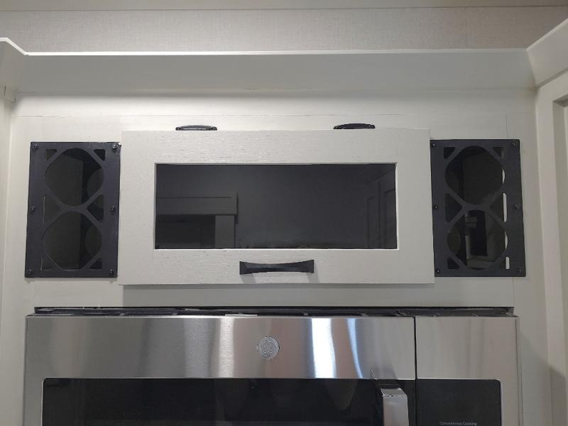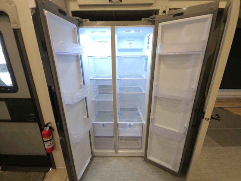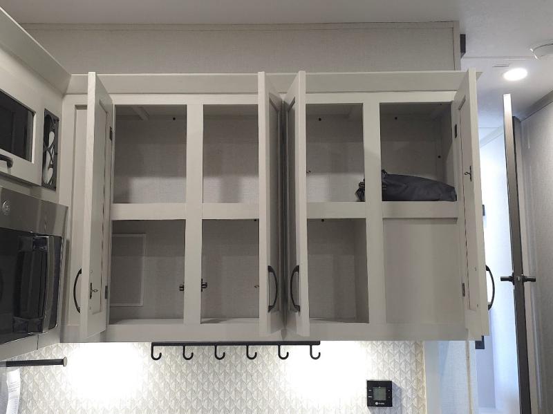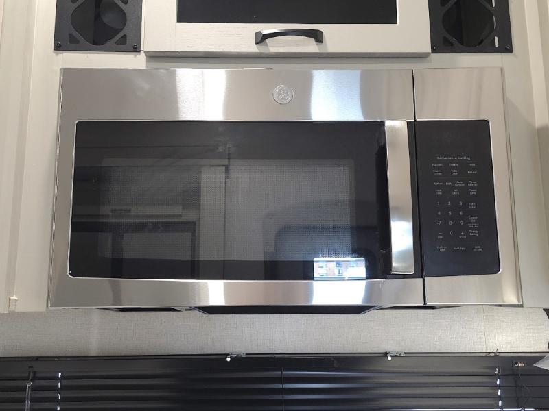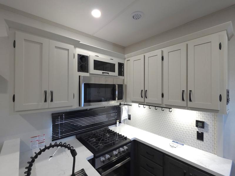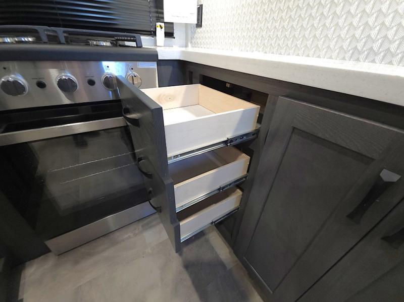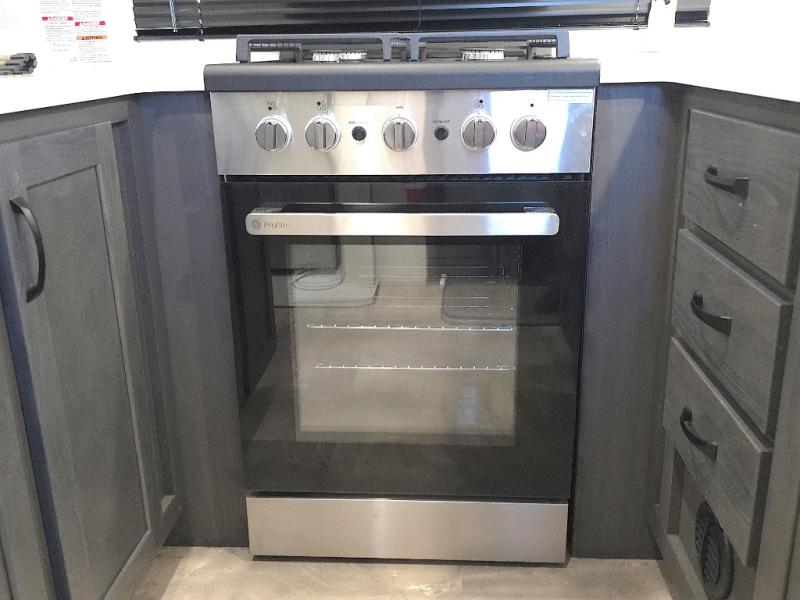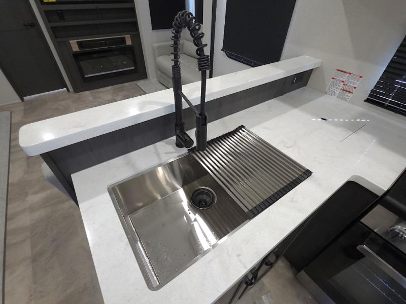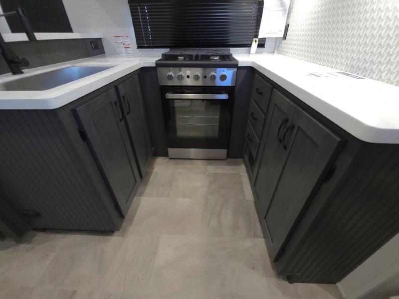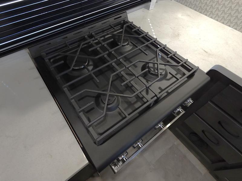 Cook with confidence in the U-shaped kitchen featuring solid surface countertops, an extra-deep single basin sink, aluminum roll-up drying rack, 30 inch microwave, 24 inch four burner range with oven, large pantry, and a 16 cu. ft. stainless-glass 12V refrigerator.