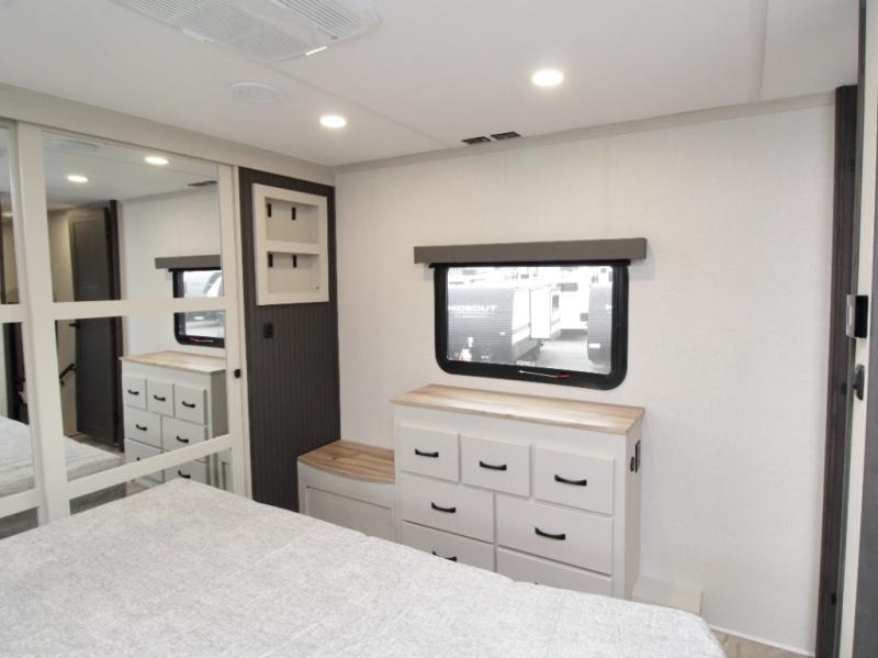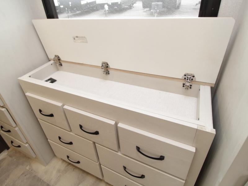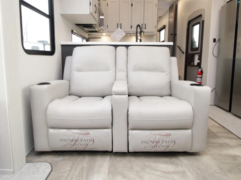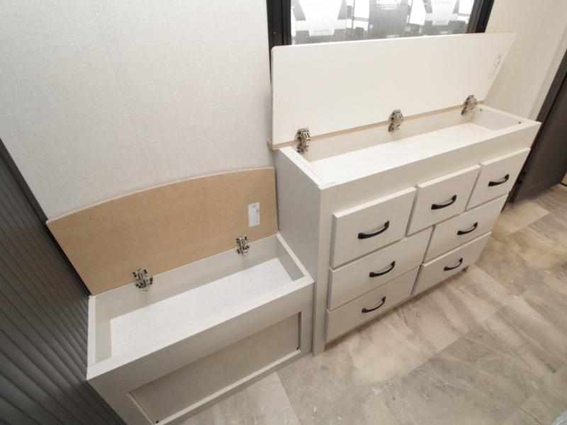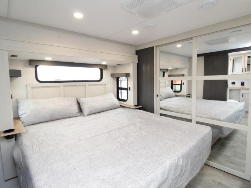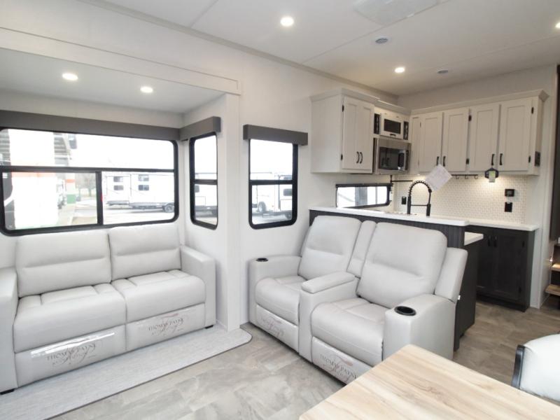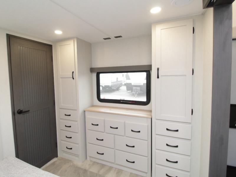 Experience true residential comfort in the Coachmen Brookstone 395DBL fifth wheel, a luxury floorplan designed for families, extended stays, and full-time RV living. At the front, the private master suite features a king-size bed in a slide-out, a spacious walk-in closet, wardrobe, dresser, and bench, providing exceptional storage and comfort for everyday living.