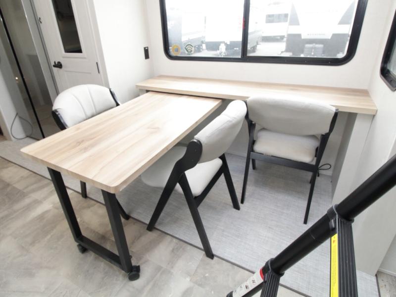 This Brookstone 395DBL 5th wheel has it all! Two bedrooms, two full bathrooms, walk-in closet, a loft, and a multi-functional slide/swivel table with a fixed bar to name a few!