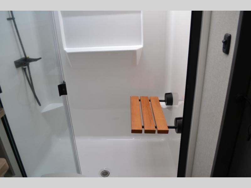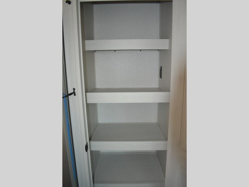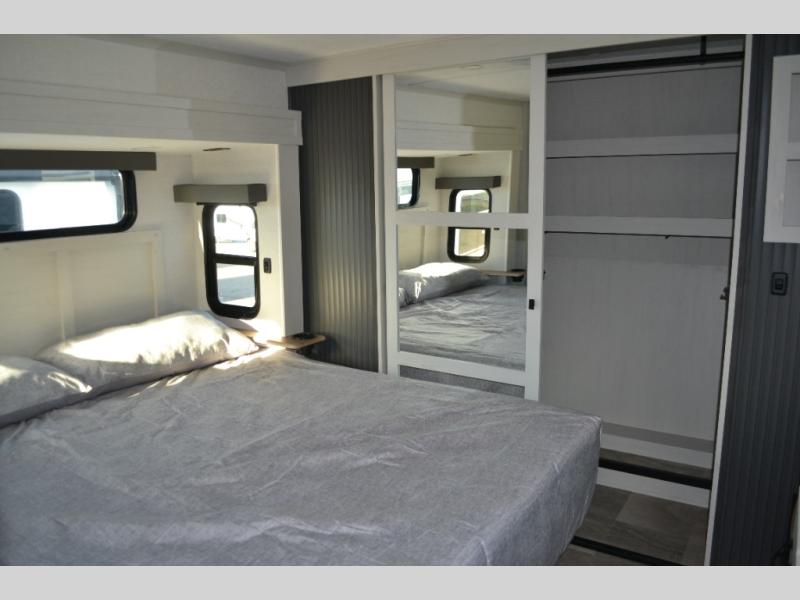 At the front of this fifth wheel, the main bedroom features a spacious king bed in a slide-out, paired with a walk-in closet, wardrobe, dresser, and bench to keep everything organized and make mornings effortless. The adjoining bathroom that is accessible from both the bedroom and hallway, includes a shower with a teak flip-down seat, sliding glass door, and a high-rise porcelain toilet with foot flush. Down the hall, the U-shaped kitchen offers solid-surface countertops, an aluminum roll-up drying rack/sink cover, an extra-deep single-basin sink, a 30" stainless microwave, a 24" four-burner range with oven, a large pantry, and a 16-cu. ft. stainless-glass 12V refrigerator in a slide-out. Nearby, the multi-functional slide/swivel table with a fixed bar creates a perfect spot for meals, games, or work. Across from it, the living area includes a tri-fold hide-a-bed sofa and theater seating facing the entertainment center. At the rear, the second bedroom provides a queen bed in a slide-out and ample storage with a dresser and dual wardrobes, while the second full bathroom, with its own exterior entry adds convenience and accessibility.