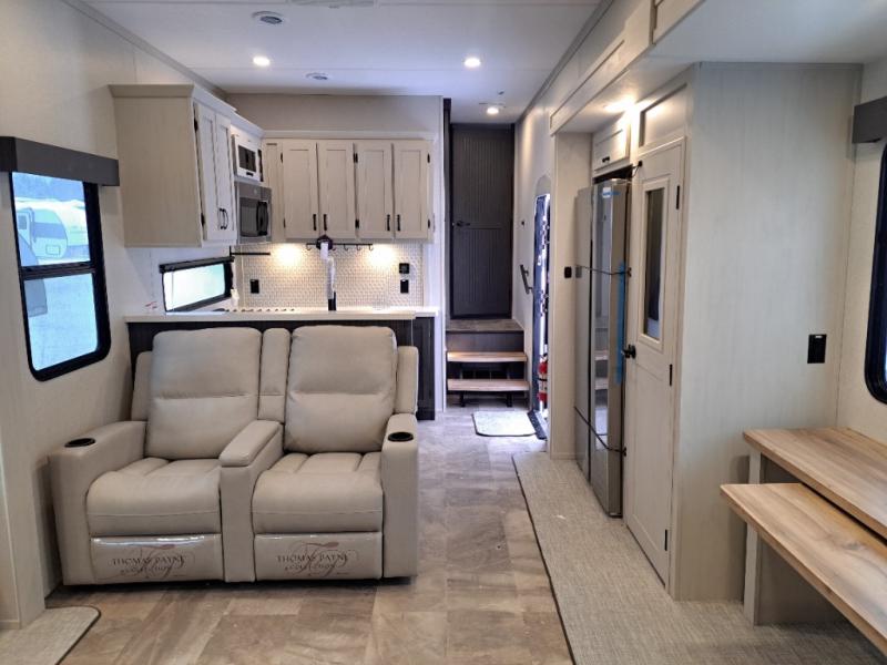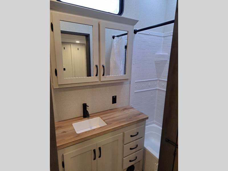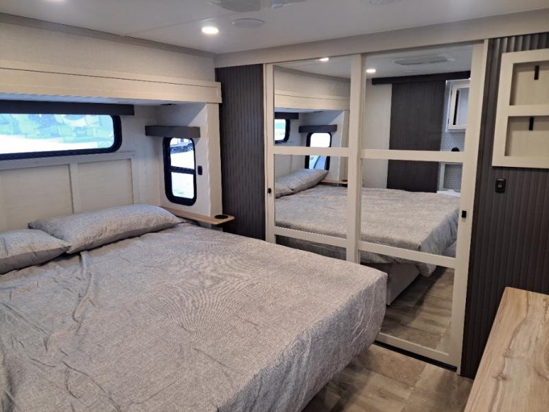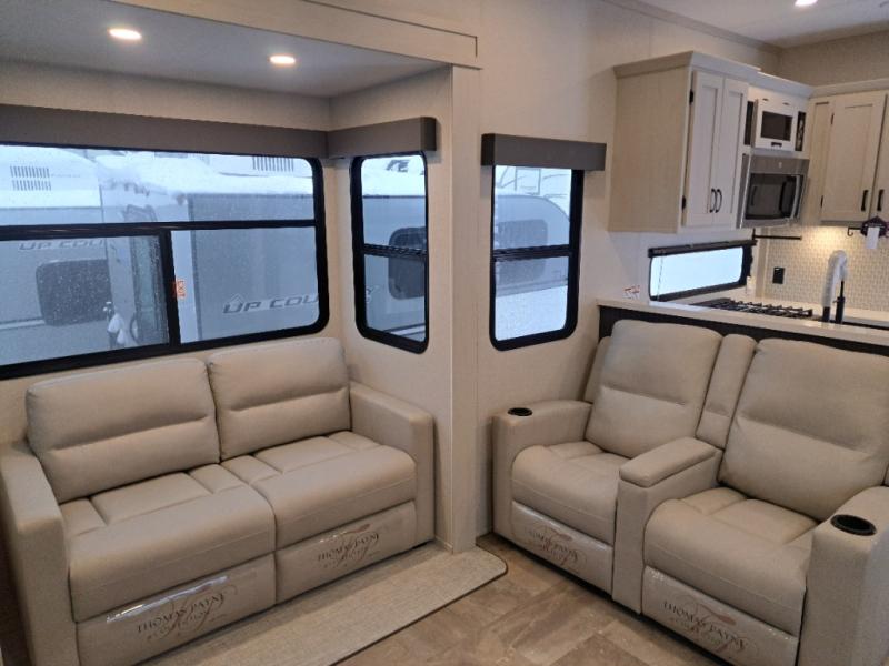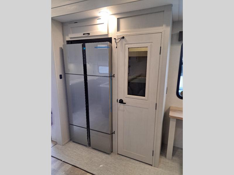 At the front of this fifth wheel, the main bedroom features a spacious king bed in a slide-out, paired with a walk-in closet, wardrobe, dresser, and bench to keep everything organized and make mornings effortless. The adjoining bathroom that is accessible from both the bedroom and hallway, includes a shower with a teak flip-down seat, sliding glass door, and a high-rise porcelain toilet with foot flush. Down the hall, the U-shaped kitchen offers solid-surface countertops, an aluminum roll-up drying rack/sink cover, an extra-deep single-basin sink, a 30" stainless microwave, a 24" four-burner range with oven, a large pantry, and a 16-cu. ft. stainless-glass 12V refrigerator in a slide-out. Nearby, the multi-functional slide/swivel table with a fixed bar creates a perfect spot for meals, games, or work. Across from it, the living area includes a tri-fold hide-a-bed sofa and theater seating facing the entertainment center. At the rear, the second bedroom provides a queen bed in a slide-out and ample storage with a dresser and dual wardrobes, while the second full bathroom, with its own exterior entry adds convenience and accessibility.