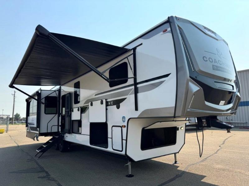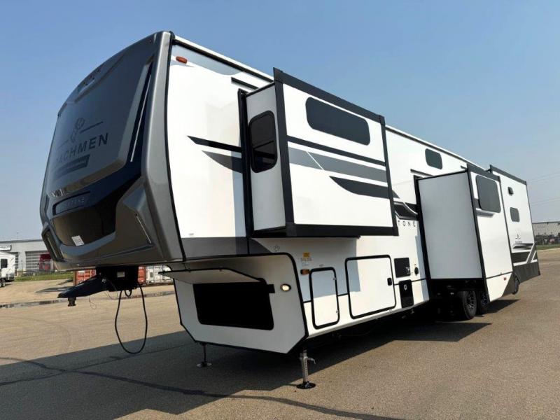 The Brookstone fifth wheels by Coachmen are coming to you with wide-body comfort, home-like amenities, and unique designs for a truly luxurious RV. The Weather Shield+ consists of a 6X double Azdel aluminum cage sidewall system, a Radiant Pro weather barrier system, and more that will help you extend your camping season or go full-time. Head inside to find solid surface countertops in the kitchen, an 4K Smart LED TV in the living room, slow rise roller night shades, and the list of comforts goes on! The Brookstone also includes 6-point electric auto-leveling, four Solid Step entry steps, an electric awning with LED lights, and many more exterior conveniences!