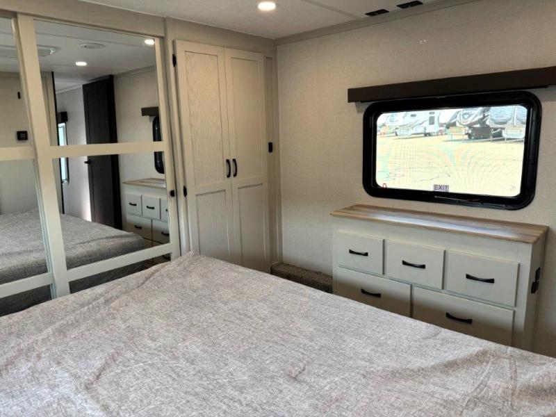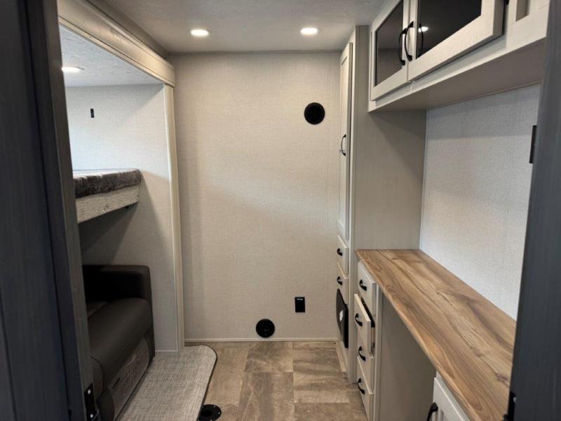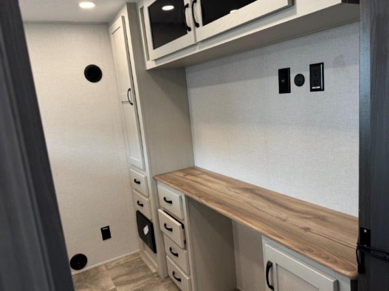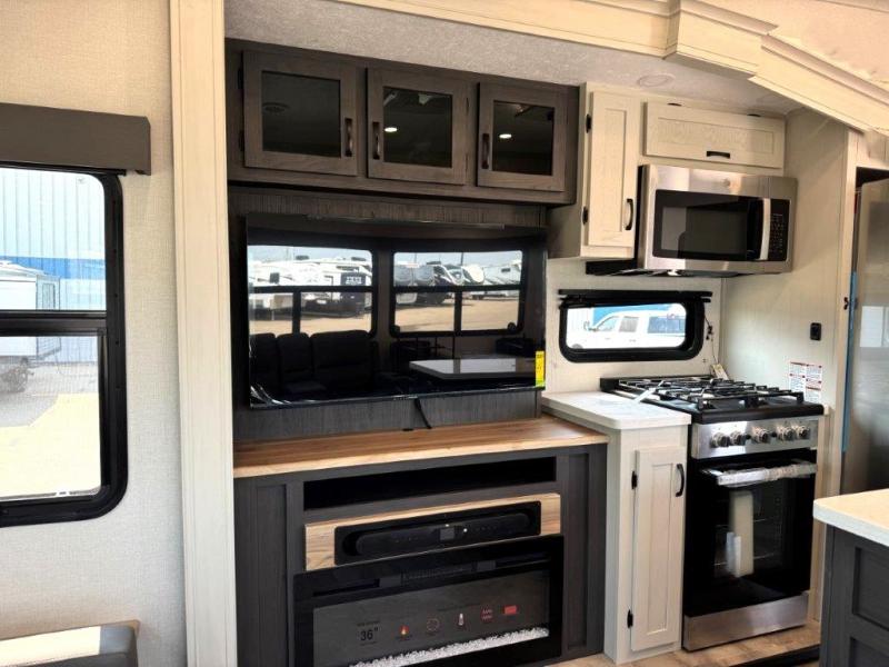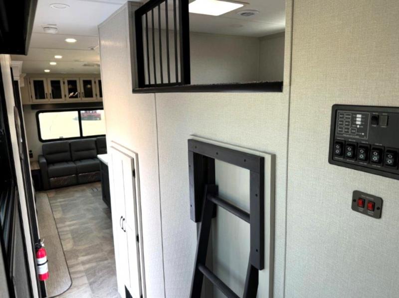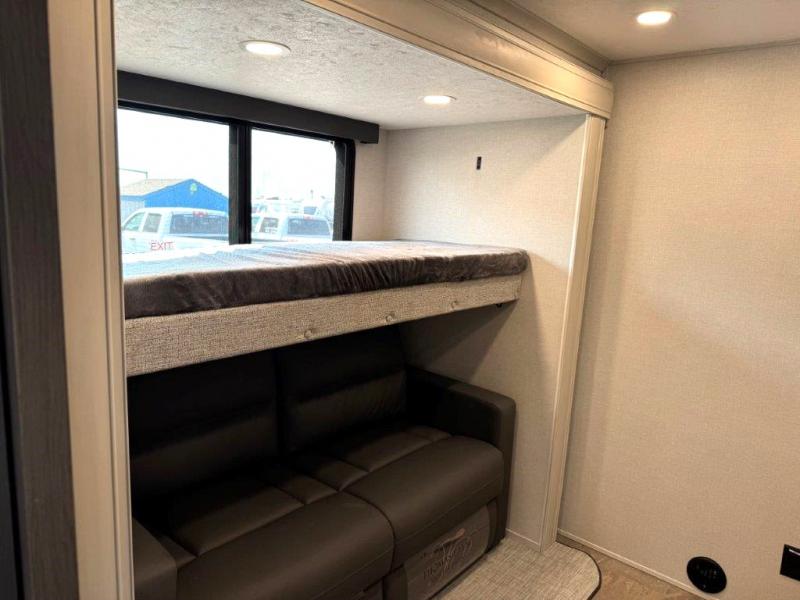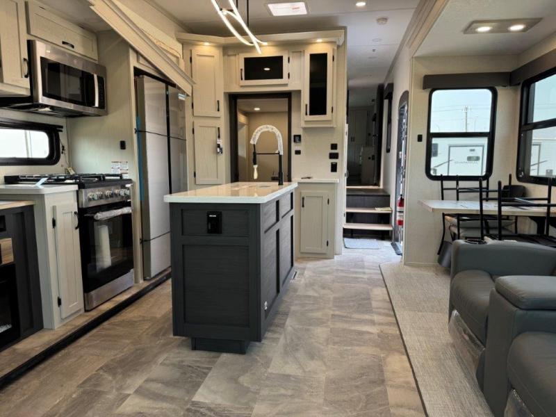 This family-friendly fifth wheel can sleep six to eight comfortably between the king bed, the tri-fold sofa, and the middle bunkhouse with a loft above! There is plenty of counter space in the bunkhouse, plus a sofa with a removable table and a wardrobe for clothes. The kitchen is any chef's dream with its residential cooktop, 15.6 cu. ft. 12V refrigerator, and kitchen island for more counter space. While dinner is being made, you can play a game of cards at the free-standing table, relax on the tri-fold sofa, or visit outdoors under the 20' power awning with LED lights. You won't be left wanting for storage space in this model thanks to the overhead cabinets, plus the bedroom dresser and large wardrobe. There is even a wardrobe with washer and dryer prep if you choose to go full-time!