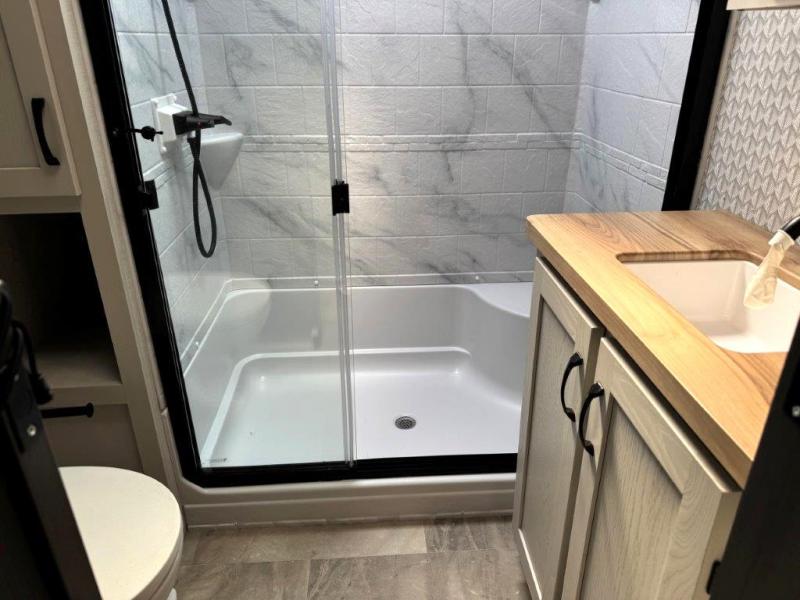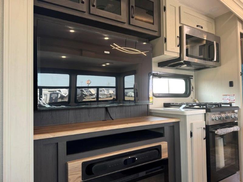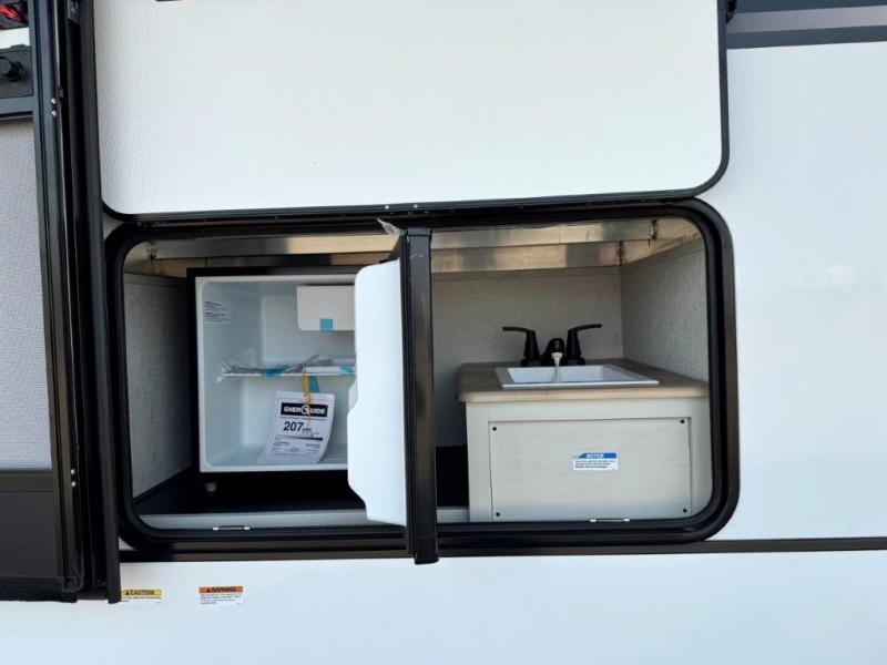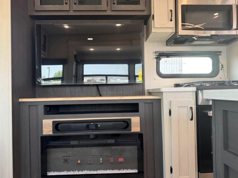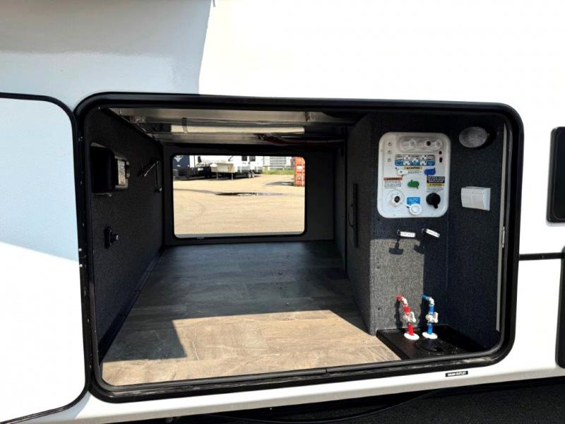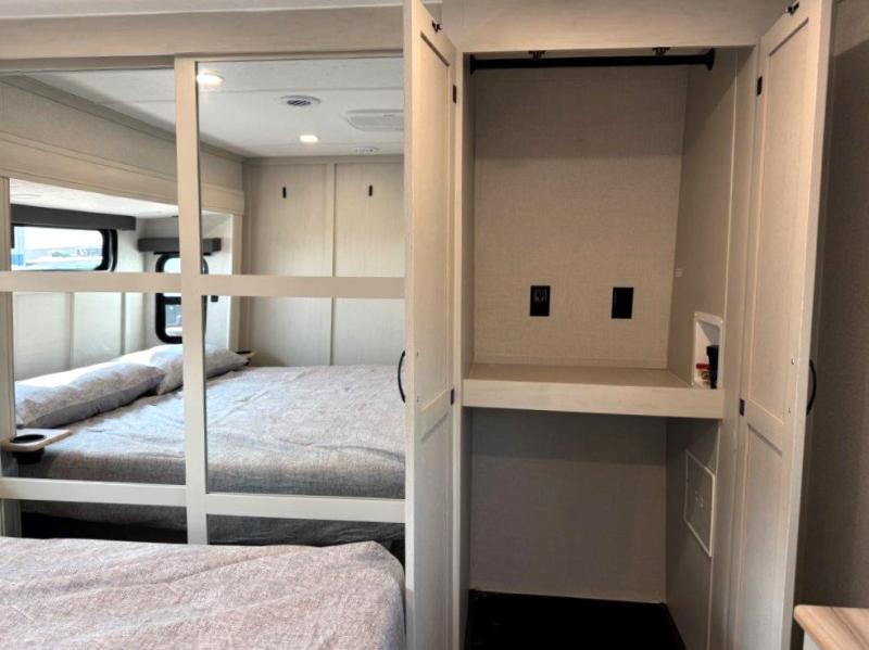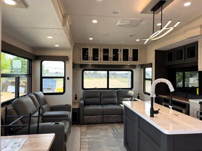 This family-friendly fifth wheel can sleep six to eight comfortably between the king bed, the tri-fold sofa, and the middle bunkhouse with a loft above! There is plenty of counter space in the bunkhouse, plus a sofa with a removable table and a wardrobe for clothes. The kitchen is any chef's dream with its residential cooktop, 15.6 cu. ft. 12V refrigerator, and kitchen island for more counter space. While dinner is being made, you can play a game of cards at the free-standing table, relax on the tri-fold sofa, or visit outdoors under the 20' power awning with LED lights. You won't be left wanting for storage space in this model thanks to the overhead cabinets, plus the bedroom dresser and large wardrobe. There is even a wardrobe with washer and dryer prep if you choose to go full-time!