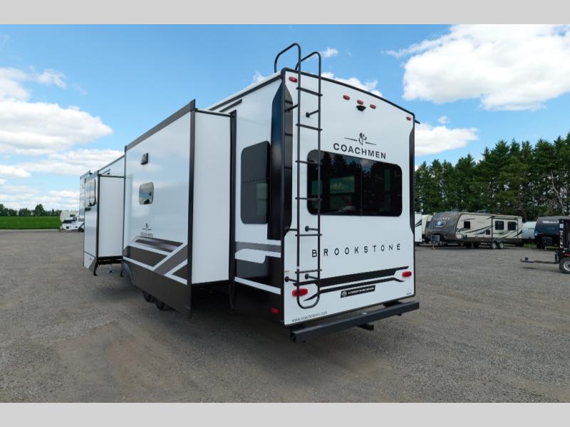 The Brookstone fifth wheels by Coachmen are coming to you with wide-body comfort, home-like amenities, and unique designs for a truly luxurious RV. The Weather Shield+ consists of a 6X double Azdel aluminum cage sidewall system, a Radiant Pro weather barrier system, and more that will help you extend your camping season or go full-time. Head inside to find solid surface countertops in the kitchen, an 4K Smart LED TV in the living room, slow rise roller night shades, and the list of comforts goes on! The Brookstone also includes 6-point electric auto-leveling, four Solid Step entry steps, an electric awning with LED lights, and many more exterior conveniences!