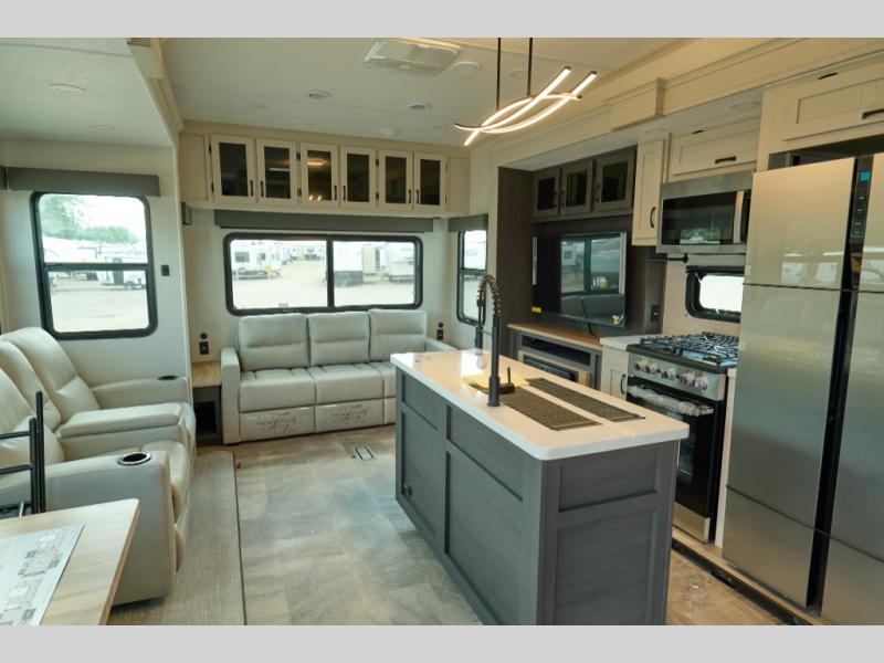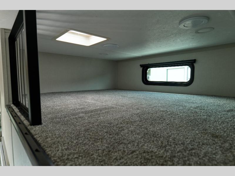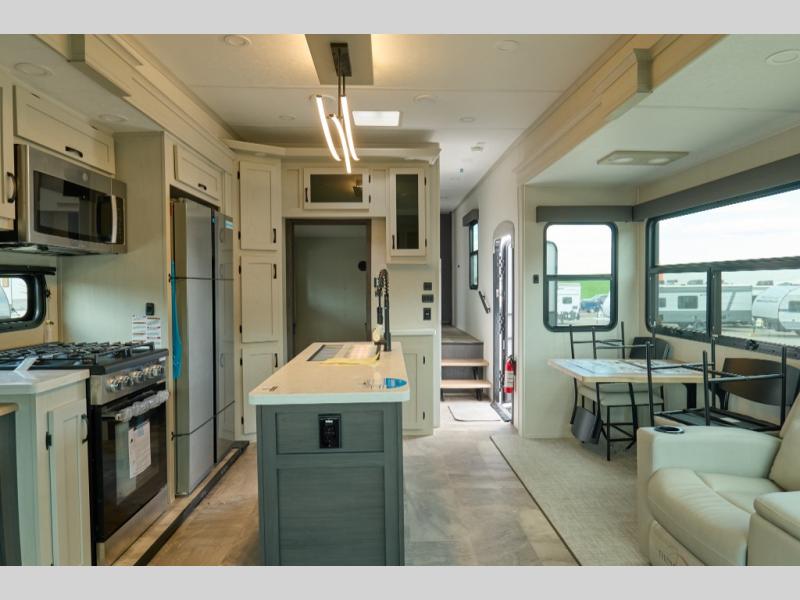 This family-friendly fifth wheel can sleep six to eight comfortably between the king bed, the tri-fold sofa, and the middle bunkhouse with a loft above! There is plenty of counter space in the bunkhouse, plus a sofa with a removable table and a wardrobe for clothes. The kitchen is any chef's dream with its residential cooktop, 12V refrigerator, and kitchen island for more counter space. While dinner is being made, you can play a game of cards at the free-standing table, relax on the tri-fold sofa, or visit outdoors under the 20' power awning with LED lights. You won't be left wanting for storage space in this model thanks to the overhead cabinets, plus the bedroom dresser and large wardrobe. There is even a wardrobe with washer and dryer prep if you choose to go full-time!