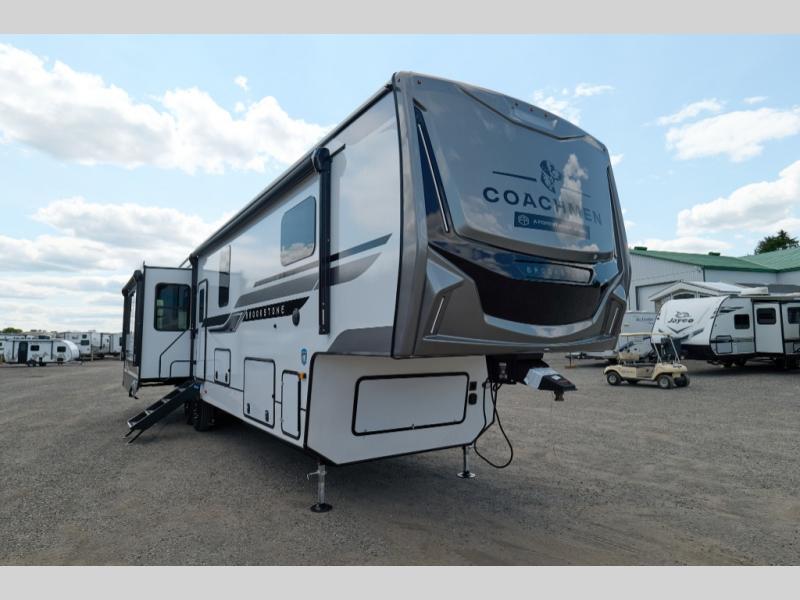 The Brookstone fifth wheels by Coachmen are coming to you with wide-body comfort, home-like amenities, and unique designs for a truly luxurious RV. The Weather Shield+ consists of a 6X double Azdel aluminum cage sidewall system, a Radiant Pro weather barrier system, and more that will help you extend your camping season or go full-time. Head inside to find solid surface countertops in the kitchen, an 4K Smart LED TV in the living room, slow rise roller night shades, and the list of comforts goes on! The Brookstone also includes 6-point electric auto-leveling, four Solid Step entry steps, an electric awning with LED lights, and many more exterior conveniences!