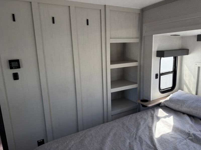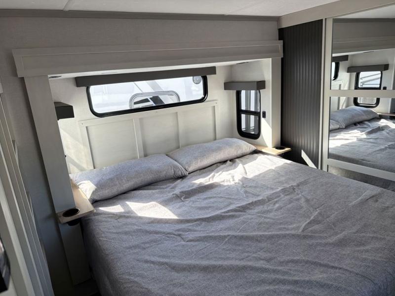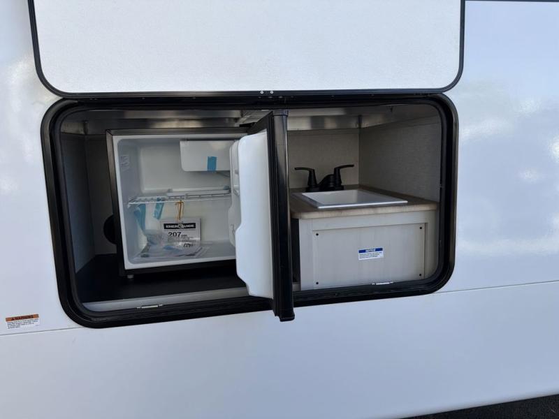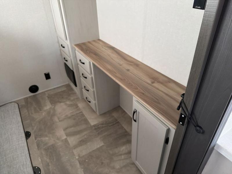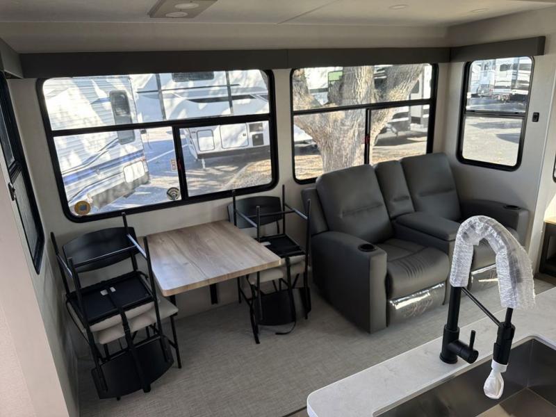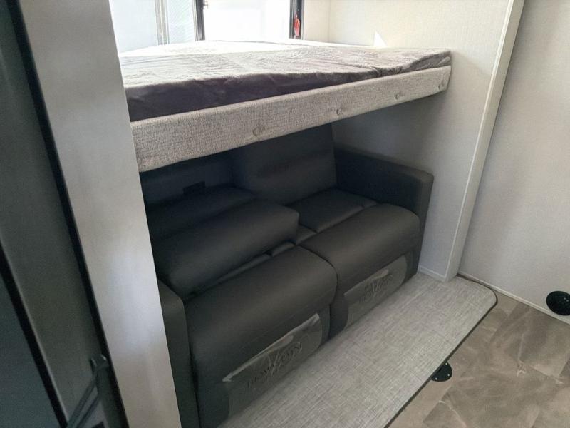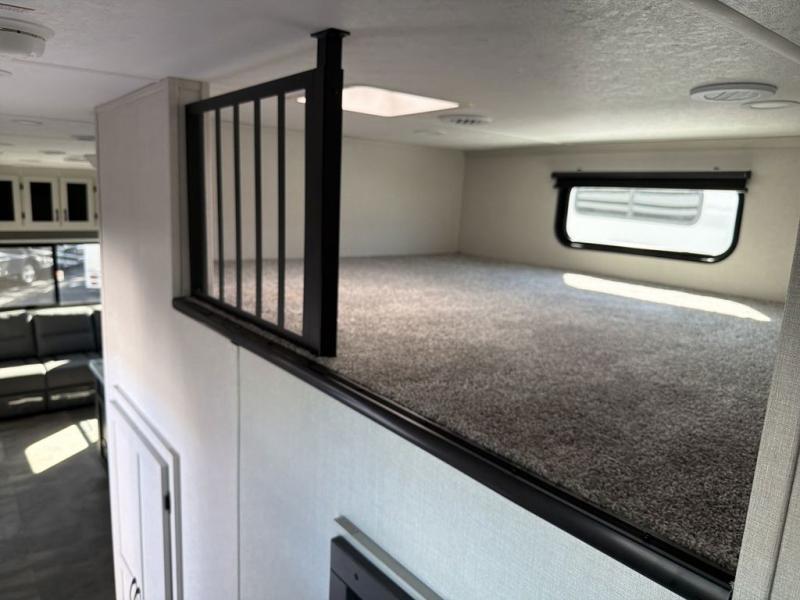 This family-friendly fifth wheel can sleep the whole gang comfortably between the king bed, the tri-fold sofa, and the middle bunkhouse with a loft above! There is plenty of counter space in the bunkhouse, plus a sofa with a removable table and a wardrobe for clothes. The kitchen is any chef's dream with its residential cooktop, 12V refrigerator, and kitchen island for more counter space. While dinner is being made, you can play a game of cards at the free-standing table, relax on the tri-fold sofa, or visit outdoors under the 20' electric awning with LED light strip. You won't be left wanting for storage space in this model thanks to the overhead cabinets, plus the bedroom dresser and large wardrobe. There is even a wardrobe with washer and dryer prep if you want to add those appliances.