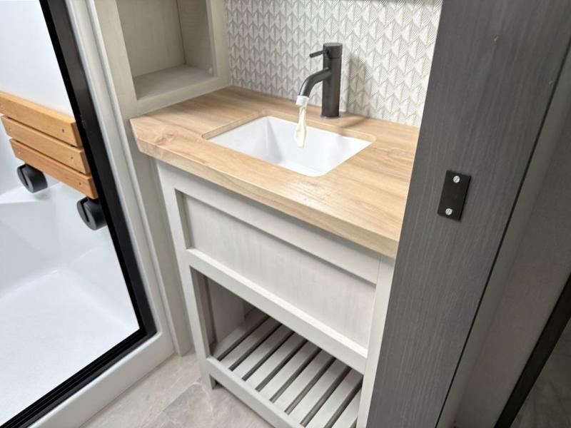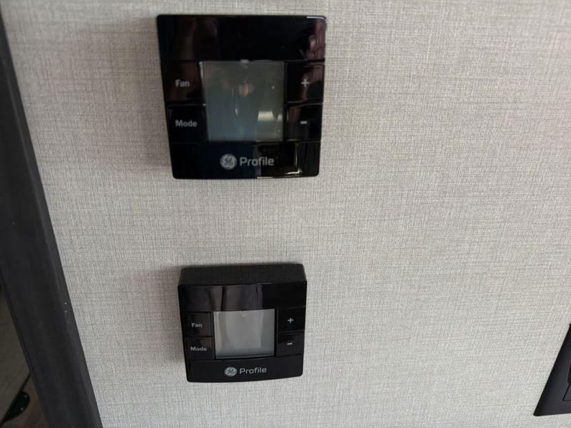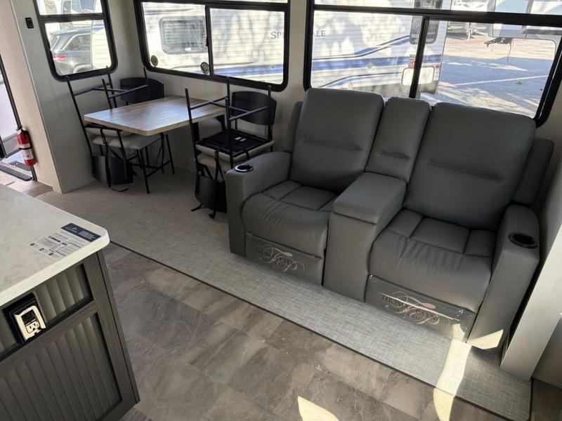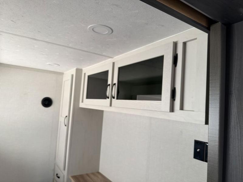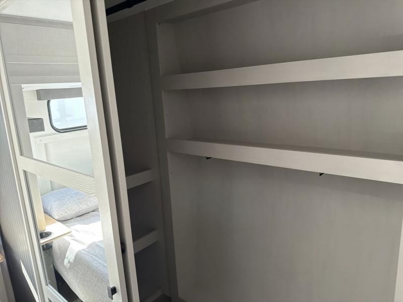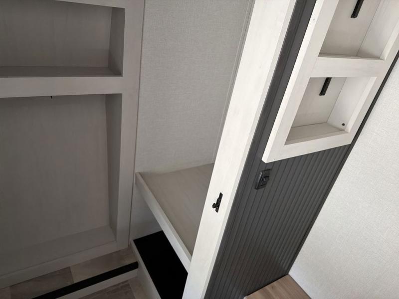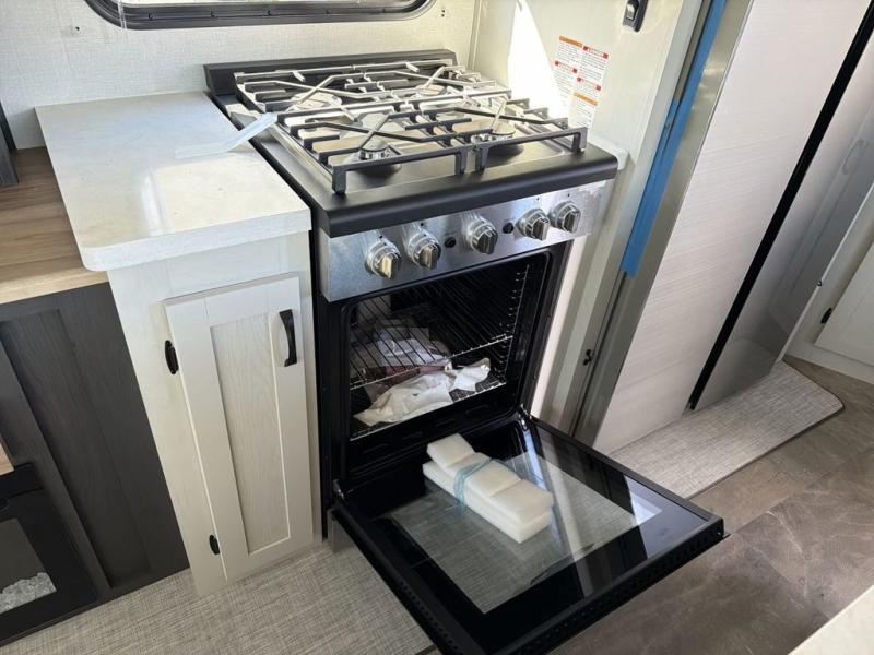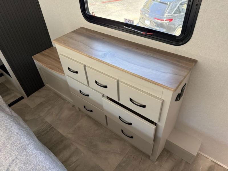 This family-friendly fifth wheel can sleep the whole gang comfortably between the king bed, the tri-fold sofa, and the middle bunkhouse with a loft above! There is plenty of counter space in the bunkhouse, plus a sofa with a removable table and a wardrobe for clothes. The kitchen is any chef's dream with its residential cooktop, 12V refrigerator, and kitchen island for more counter space. While dinner is being made, you can play a game of cards at the free-standing table, relax on the tri-fold sofa, or visit outdoors under the 20' electric awning with LED light strip. You won't be left wanting for storage space in this model thanks to the overhead cabinets, plus the bedroom dresser and large wardrobe. There is even a wardrobe with washer and dryer prep if you want to add those appliances.