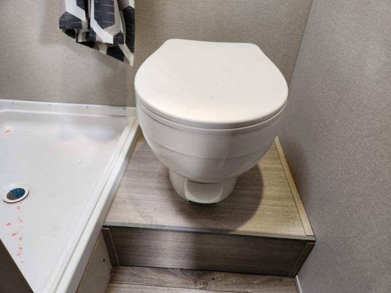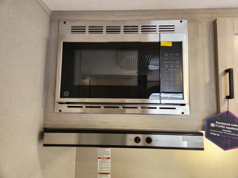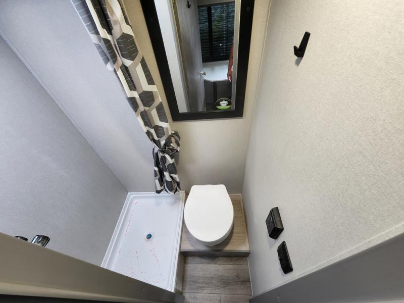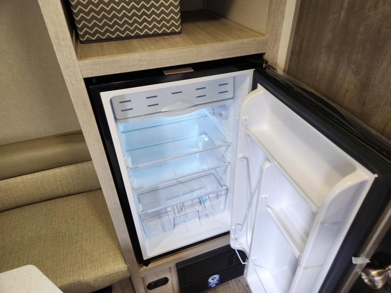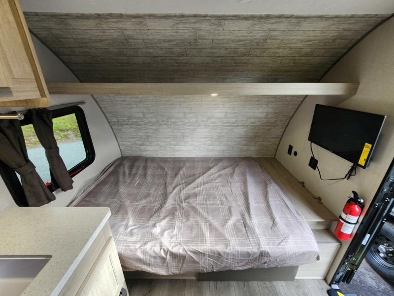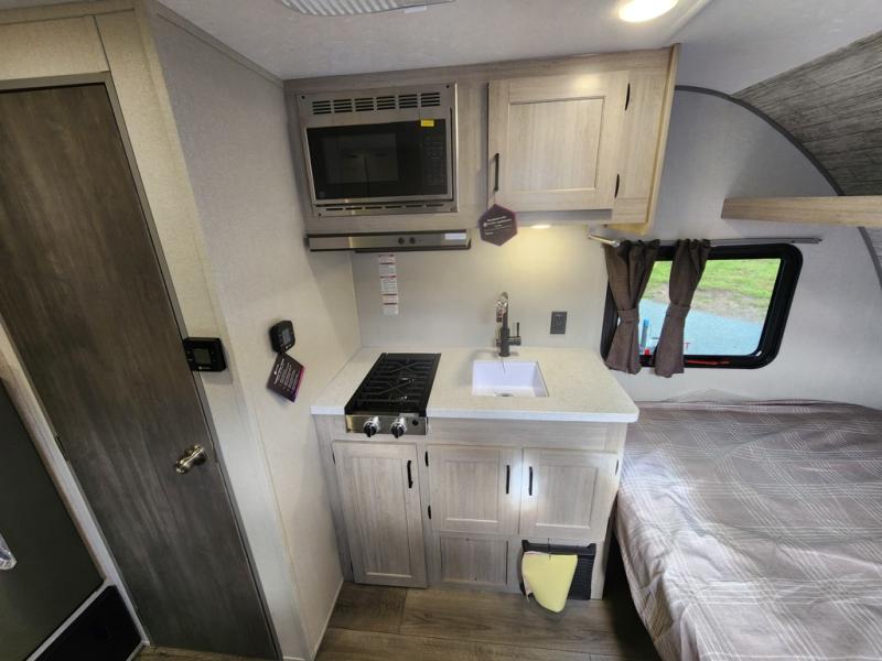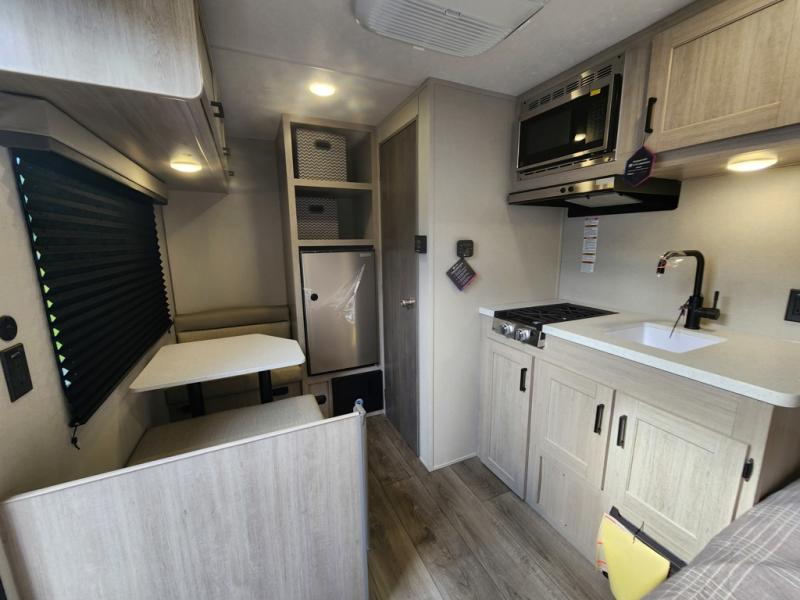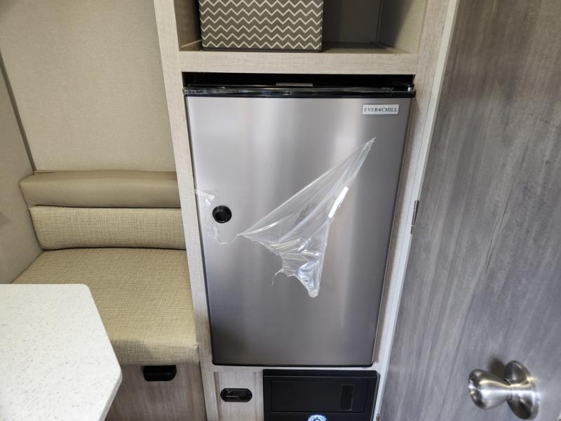 Lightweight camping is easier than you think with this travel trailer in tow! The front 54" x 74" queen bed will provide a great night's rest each night, while your overnight guest takes the booth dinette. There is a handy shelf above the front bed for your belongings plus additional bedroom storage. A private bath includes a 24" x 32" shower and a toilet with a mirror behind it so you can freshen up each day. You'll also find a two burner cooktop and microwave oven to make meals each day plus a 3.3 cu. ft. 12V refrigerator for food storage!