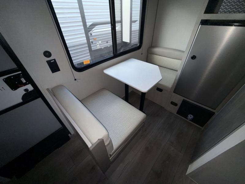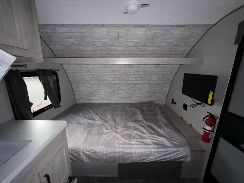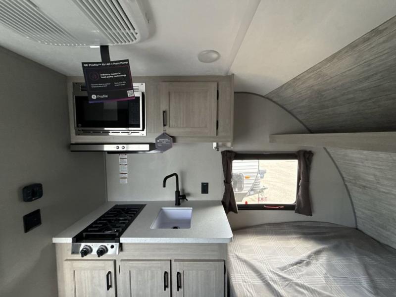 Lightweight camping is easier than you think with this travel trailer in tow! The front 54" x 74" queen bed will provide a great night's rest each night, while your overnight guest takes the booth dinette. There is a handy shelf above the front bed for your belongings plus additional bedroom storage. A private bath includes a 24" x 32" shower and a toilet with a mirror behind it so you can freshen up each day. You'll also find a two burner cooktop and microwave oven to make meals each day plus a 3.3 cu. ft. 12V refrigerator for food storage!