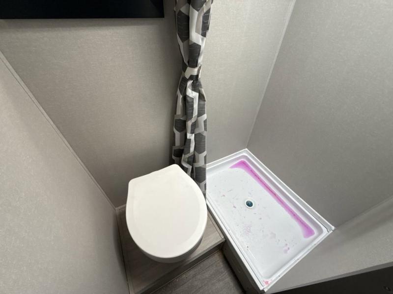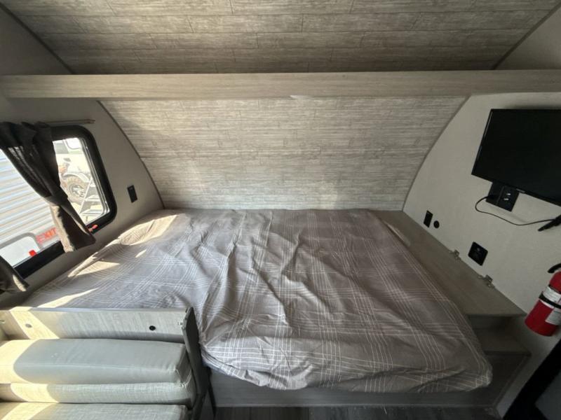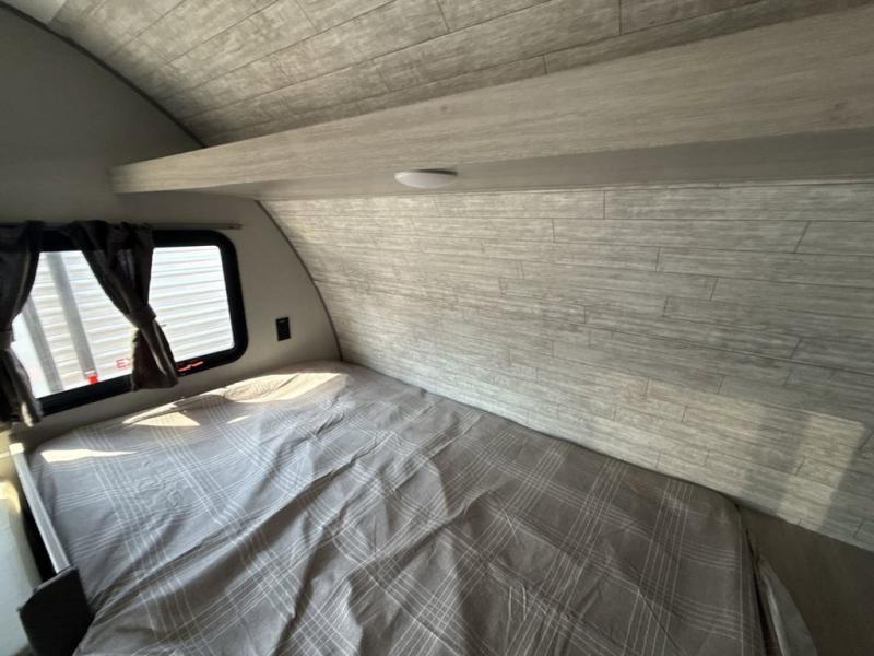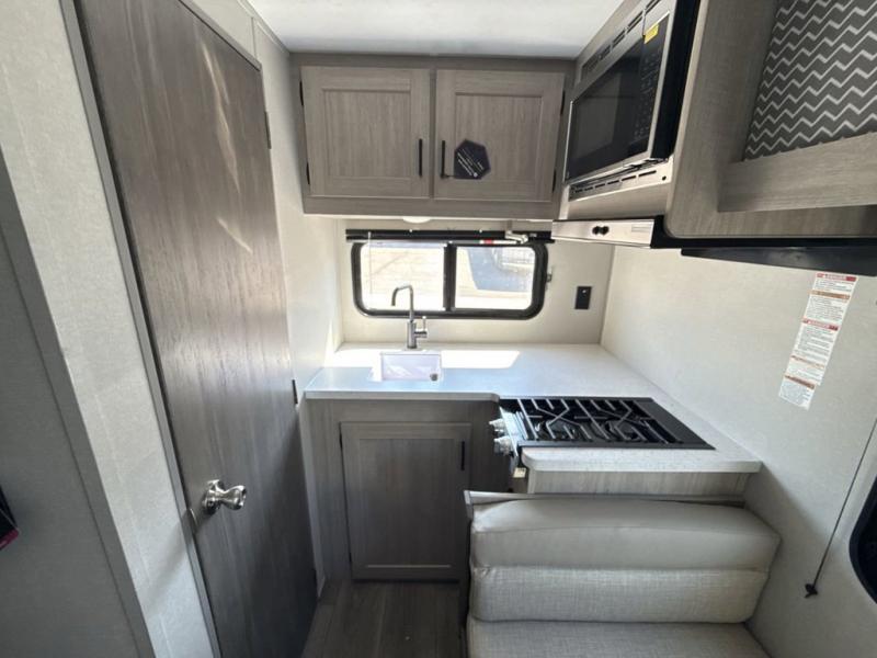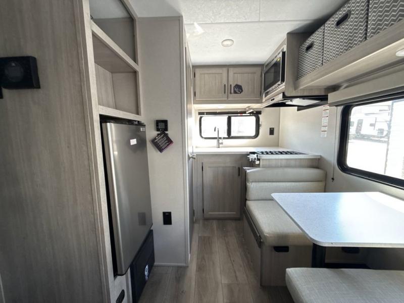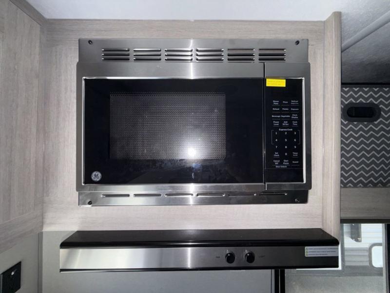 Lightweight camping is easier than you think with this travel trailer in tow! The front 54" x 74" queen bed will provide a great night's rest each night, while your overnight guest takes the 60" Jack knife sofa. There is a handy shelf above the front bed for your belongings plus a shelf with bins over the sofa. A private bath includes a 24" x 32" shower and a toilet with a mirror behind it so you can freshen up each day. You'll also find a two burner cooktop and microwave oven to make meals each day plus a 3.3 cu. ft. 12V refrigerator for food storage!