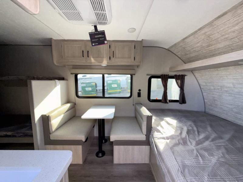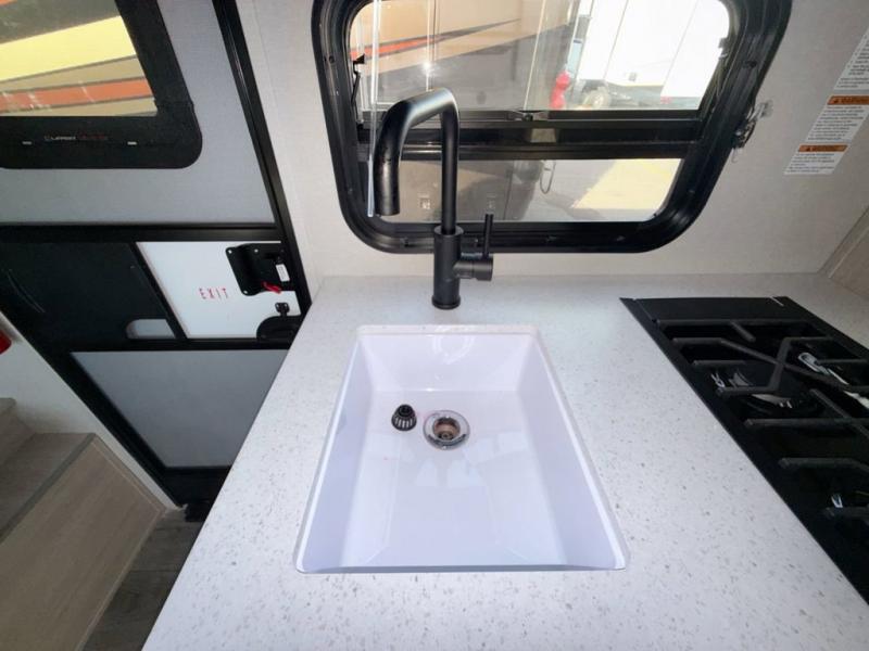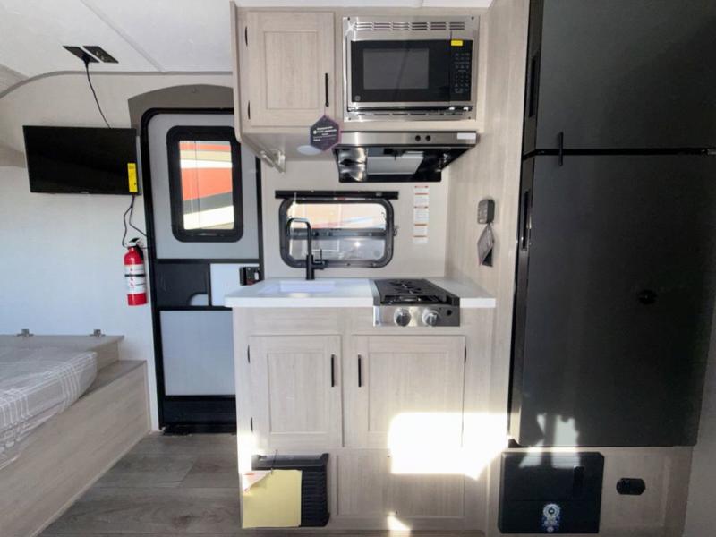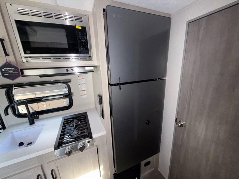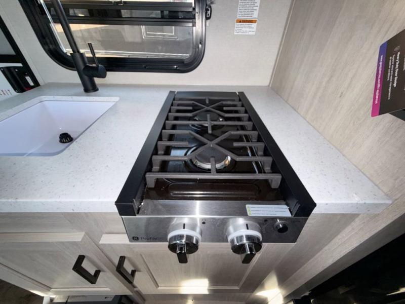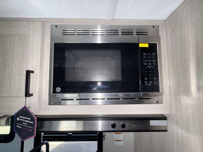 This travel trailers is perfect for a young family or smaller group. You can easily sleep four or more with the rear set of bunk beds and queen bed up front. There is also a booth dinette for inside down-time, as well as complete kitchen and bath amenities so you can cook and stay clean while traveling. The rear corner bath features a toilet and 36" x 30" shower, and it's conveniently located next to the bunk beds which is great for little ones at night. Cooking inside will be easy with a GE stainless two-burner cooktop and single sink, plus there is also a GE microwave oven for snacks and things that you can easily warm up. If you plan to spend most of your time outdoors, you will find plenty of storage space in the front exterior storage compartment, and there is also plenty of storage inside as well.