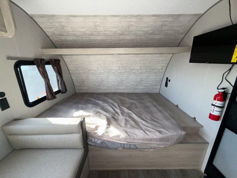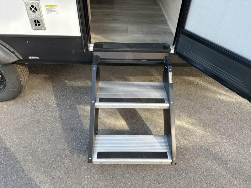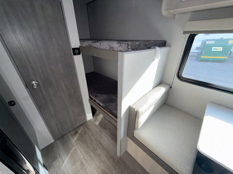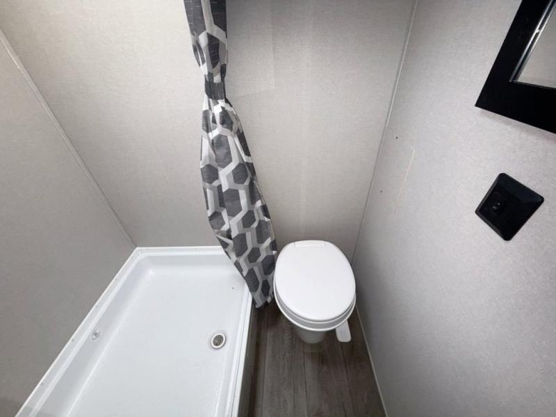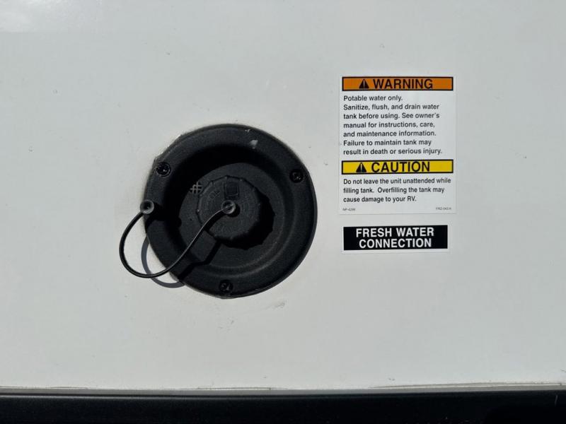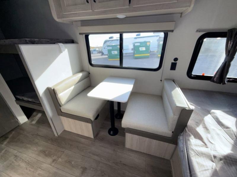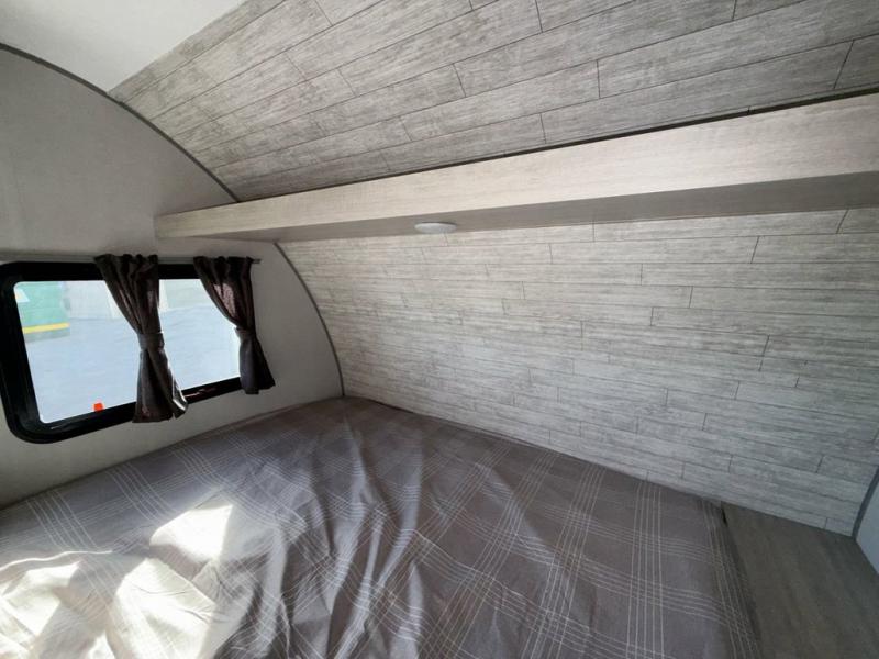 This travel trailers is perfect for a young family or smaller group. You can easily sleep four or more with the rear set of bunk beds and queen bed up front. There is also a booth dinette for inside down-time, as well as complete kitchen and bath amenities so you can cook and stay clean while traveling. The rear corner bath features a toilet and 36" x 30" shower, and it's conveniently located next to the bunk beds which is great for little ones at night. Cooking inside will be easy with a GE stainless two-burner cooktop and single sink, plus there is also a GE microwave oven for snacks and things that you can easily warm up. If you plan to spend most of your time outdoors, you will find plenty of storage space in the front exterior storage compartment, and there is also plenty of storage inside as well.