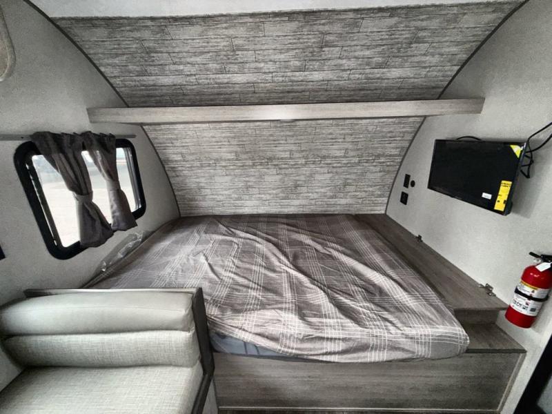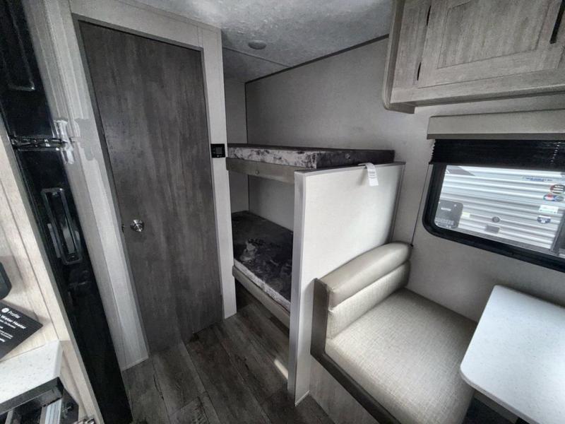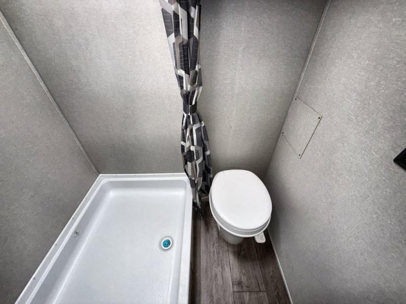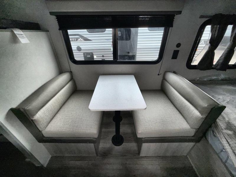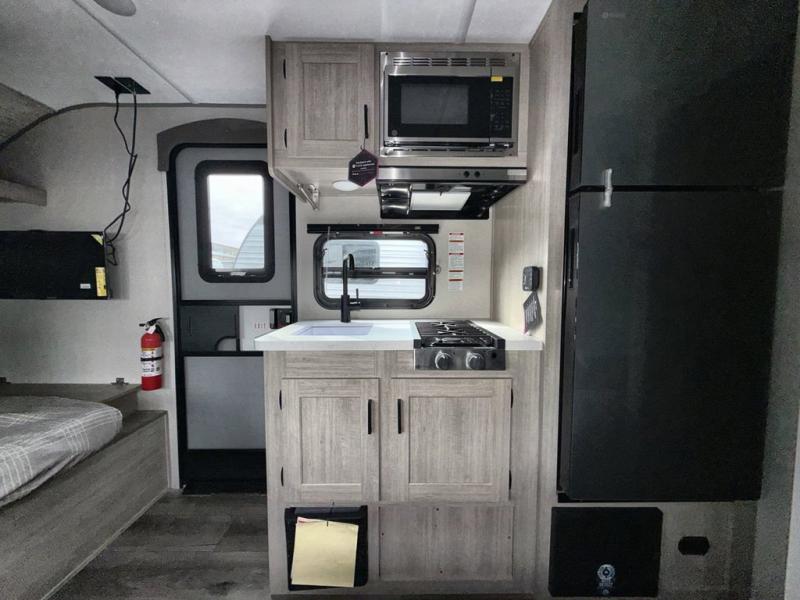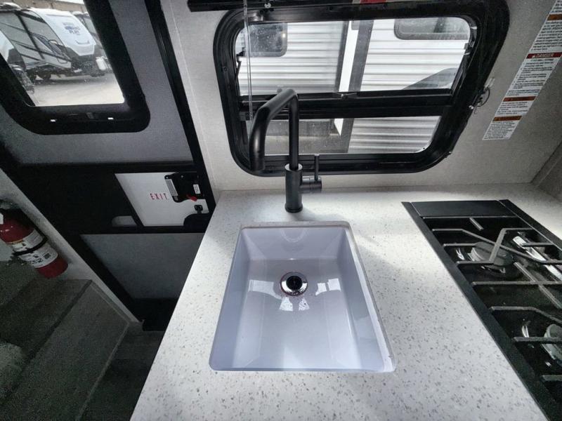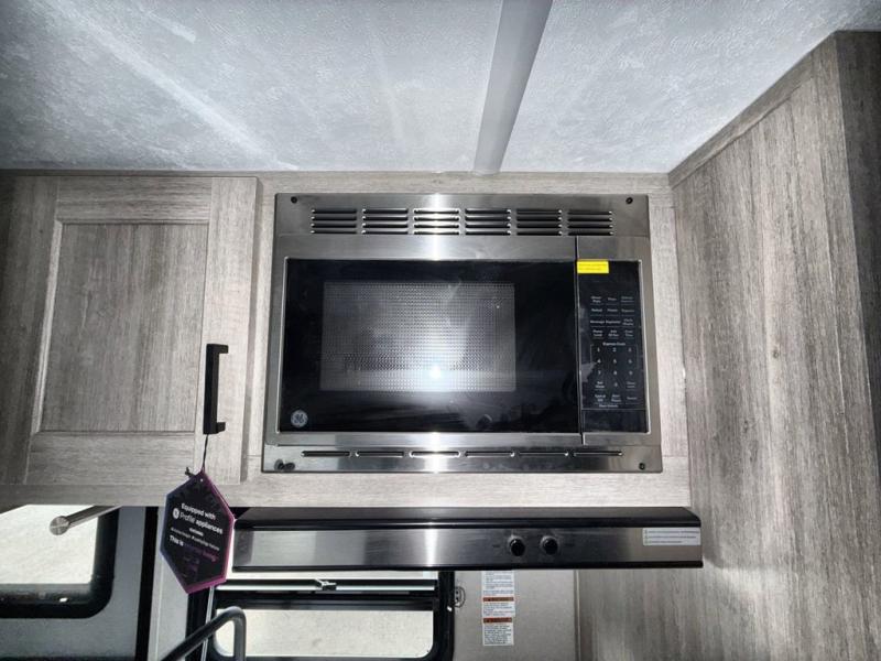 This travel trailers is perfect for a young family or smaller group. You can easily sleep four or more with the rear set of bunk beds and queen bed up front. There is also a booth dinette for inside down-time, as well as complete kitchen and bath amenities so you can cook and stay clean while traveling. The rear corner bath features a toilet and 36" x 30" shower, and it's conveniently located next to the bunk beds which is great for little ones at night. Cooking inside will be easy with a GE stainless two-burner cooktop and single sink, plus there is also a GE microwave oven for snacks and things that you can easily warm up. If you plan to spend most of your time outdoors, you will find plenty of storage space in the front exterior storage compartment, and there is also plenty of storage inside as well.