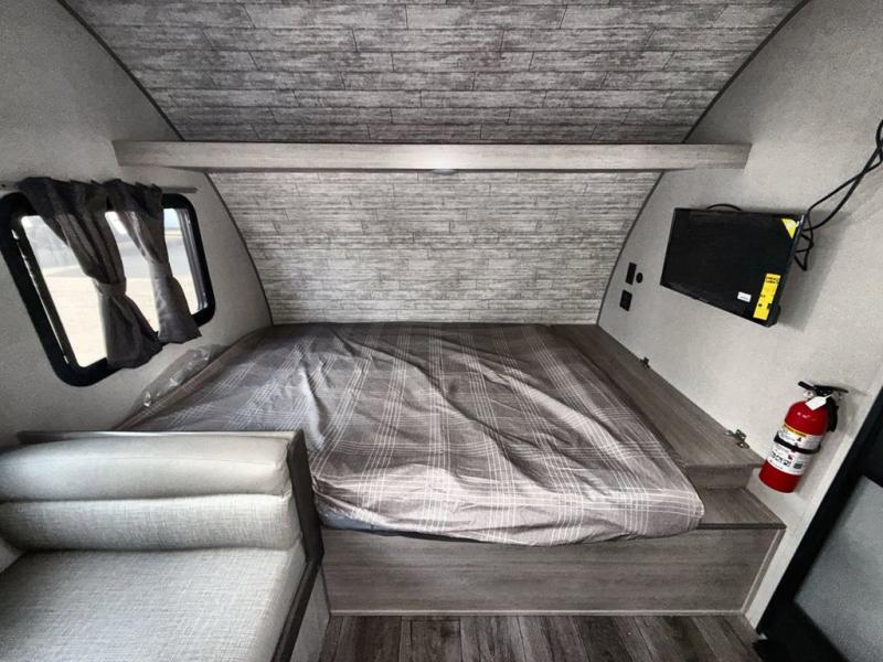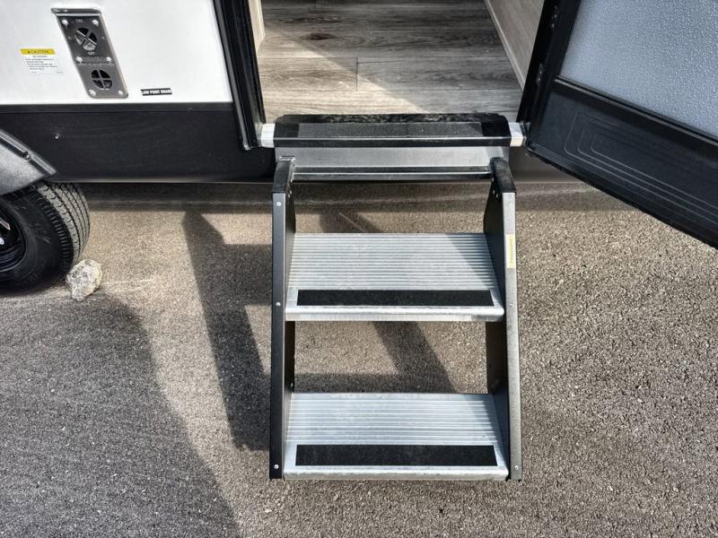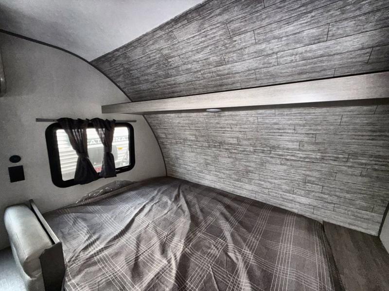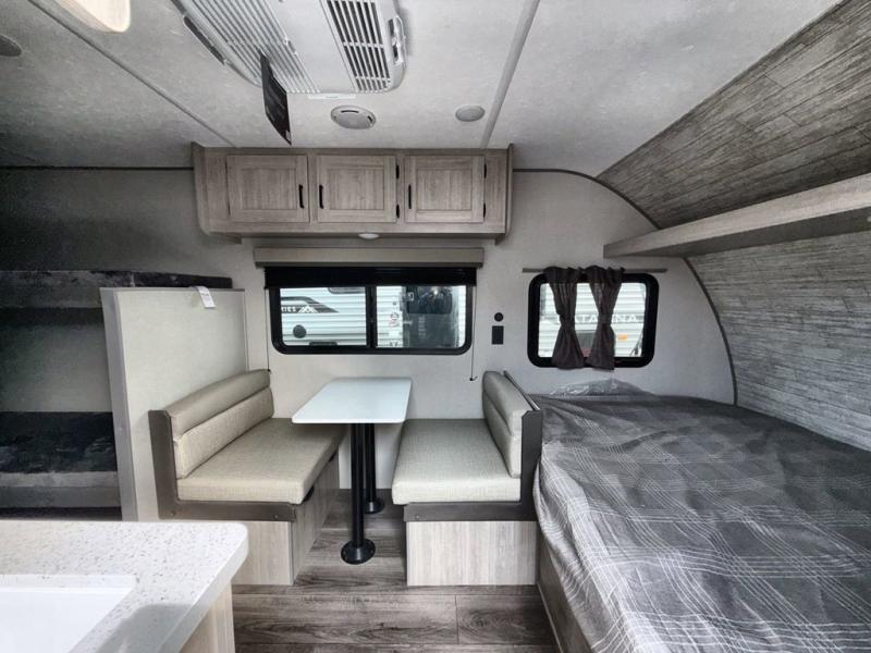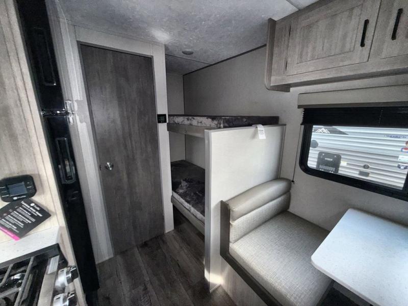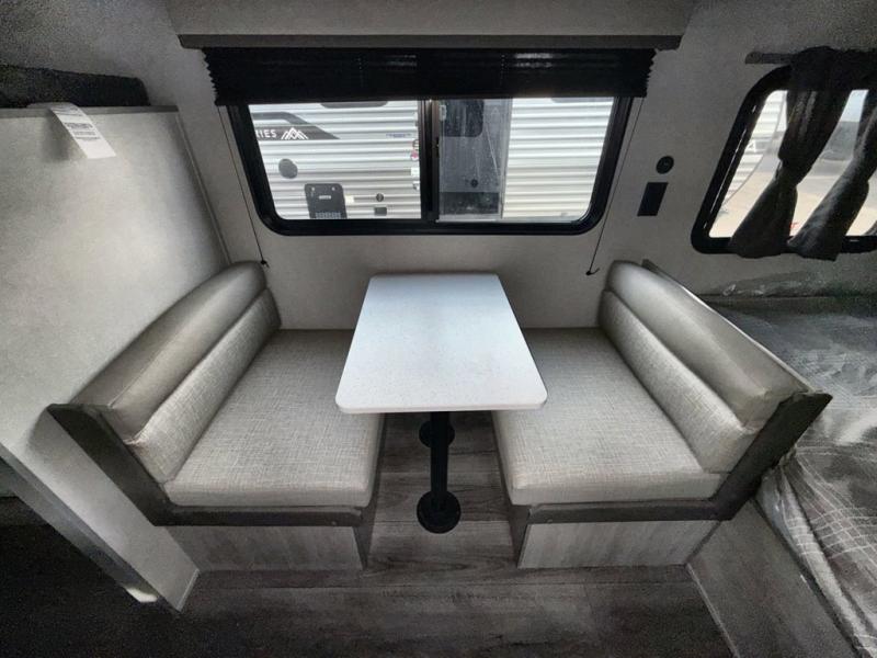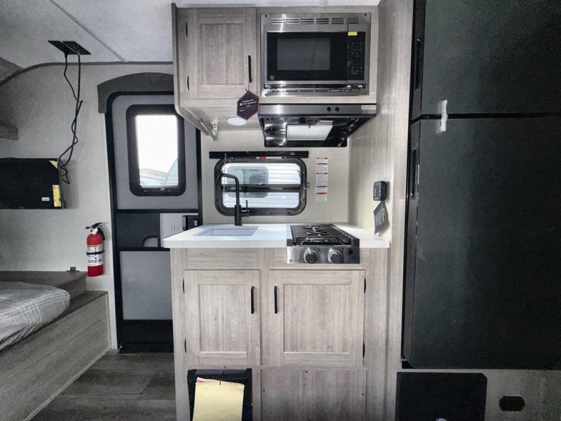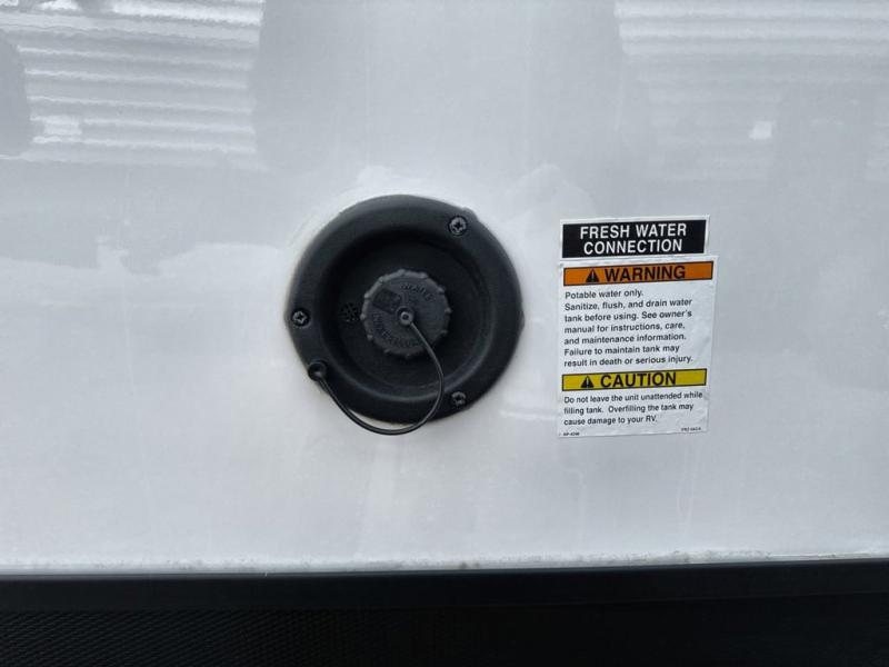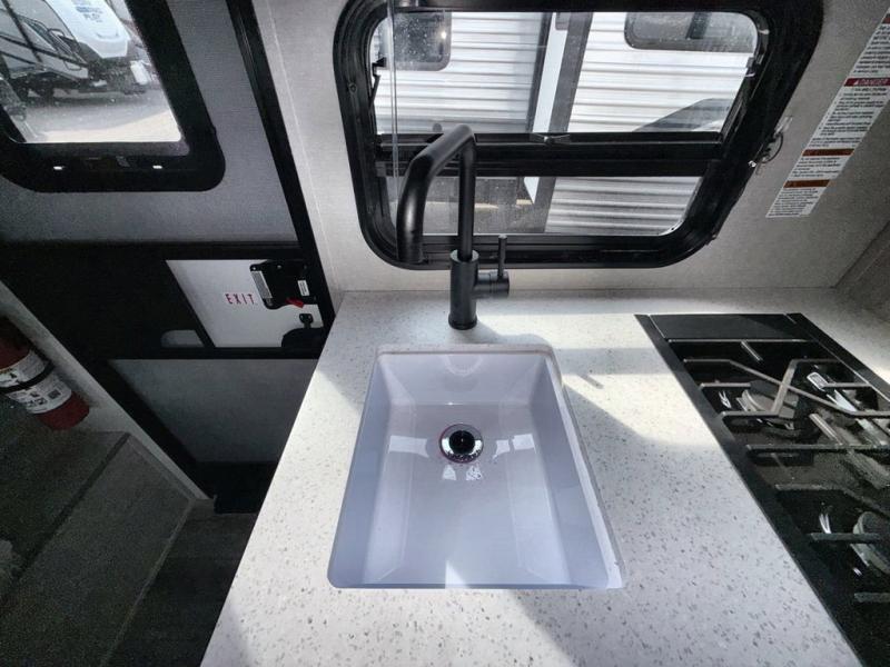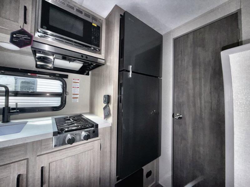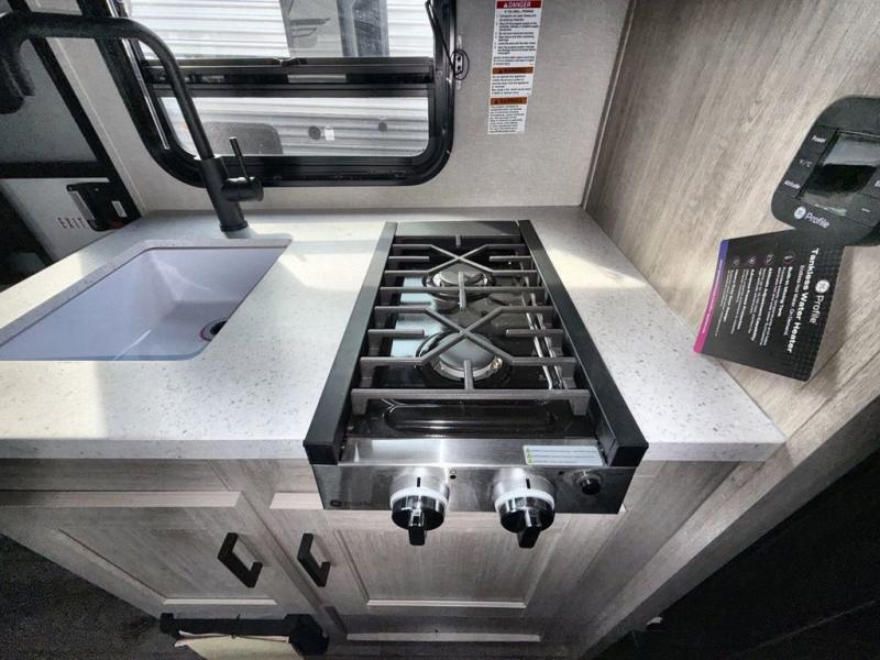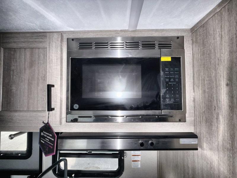 This travel trailers is perfect for a young family or smaller group. You can easily sleep four or more with the rear set of bunk beds and queen bed up front. There is also a booth dinette for inside down-time, as well as complete kitchen and bath amenities so you can cook and stay clean while traveling. The rear corner bath features a toilet and 36" x 30" shower, and it's conveniently located next to the bunk beds which is great for little ones at night. Cooking inside will be easy with a GE stainless two-burner cooktop and single sink, plus there is also a GE microwave oven for snacks and things that you can easily warm up. If you plan to spend most of your time outdoors, you will find plenty of storage space in the front exterior storage compartment, and there is also plenty of storage inside as well.