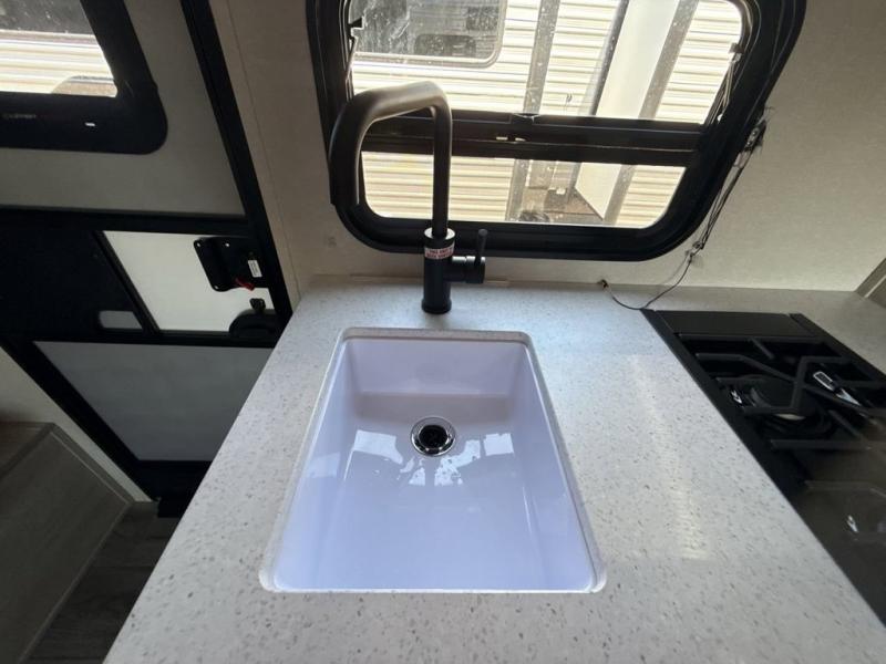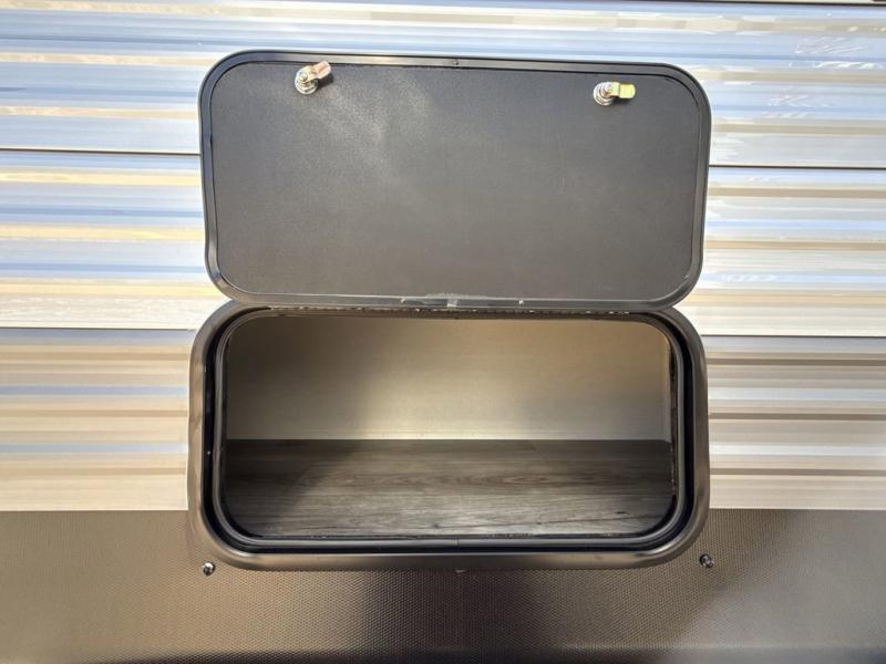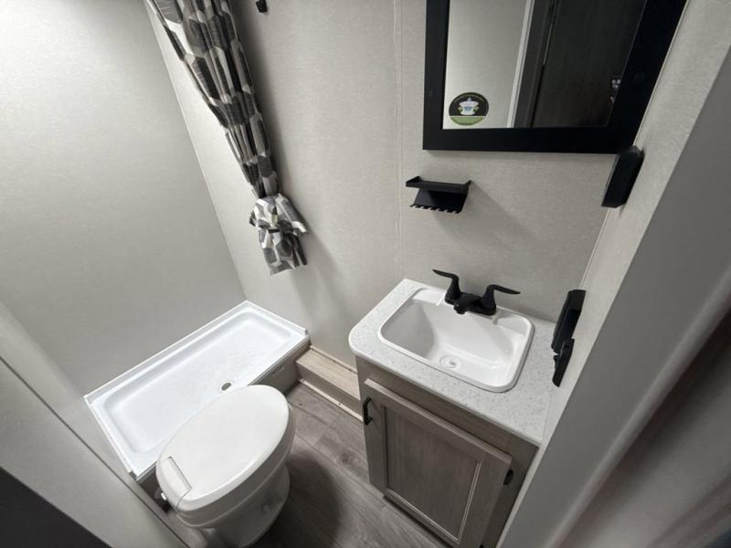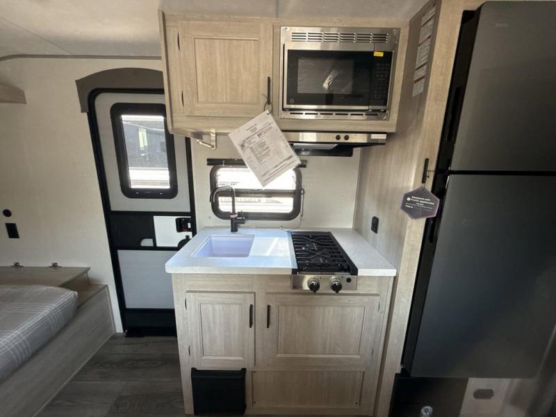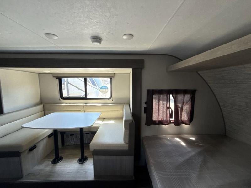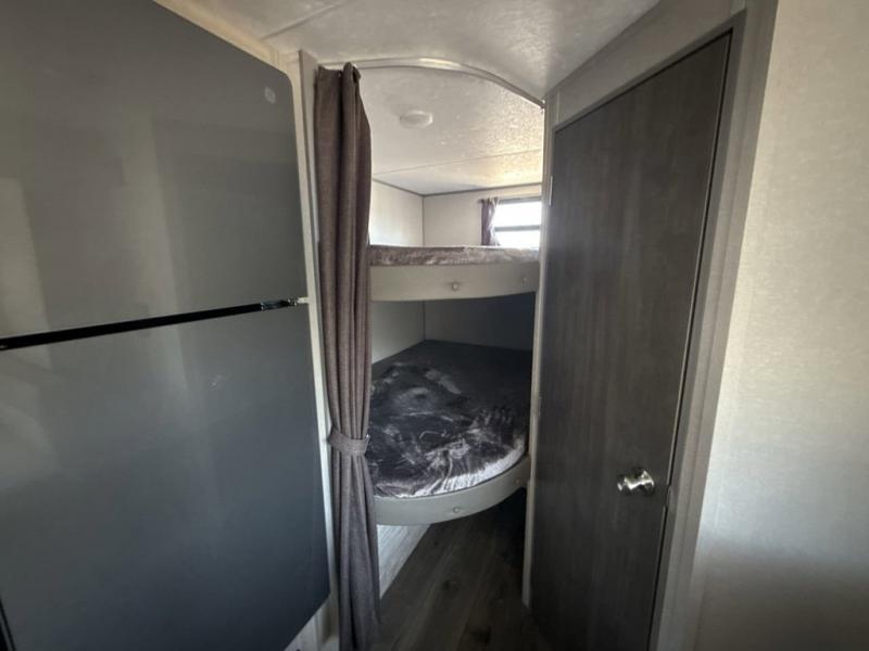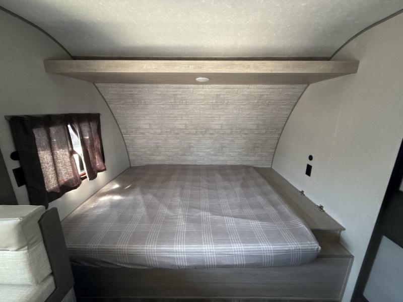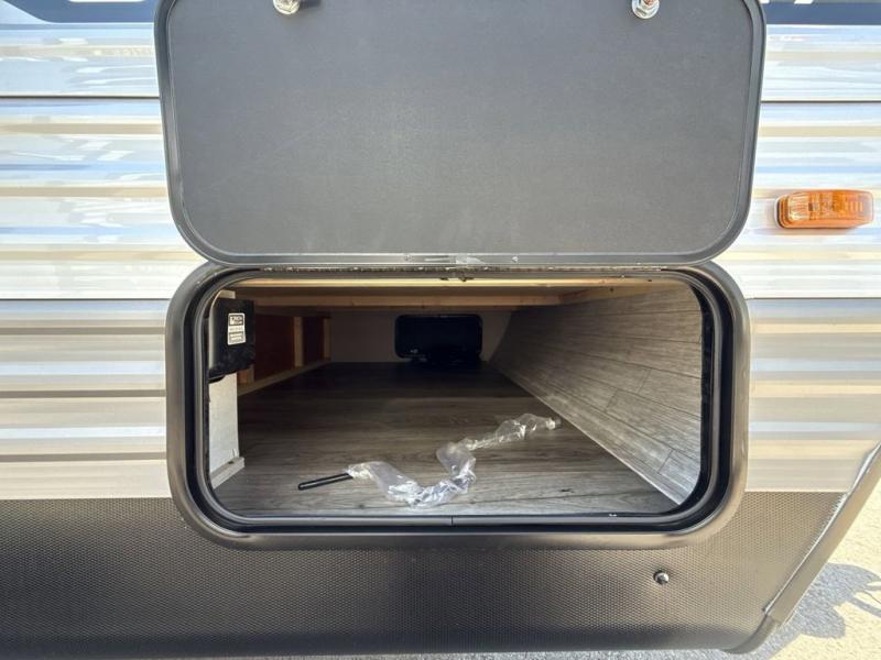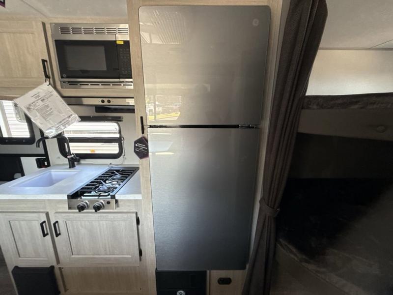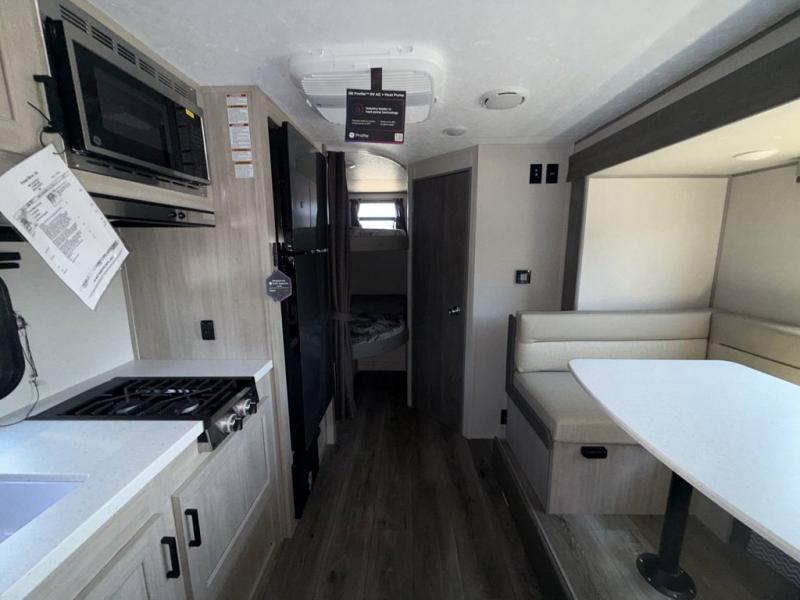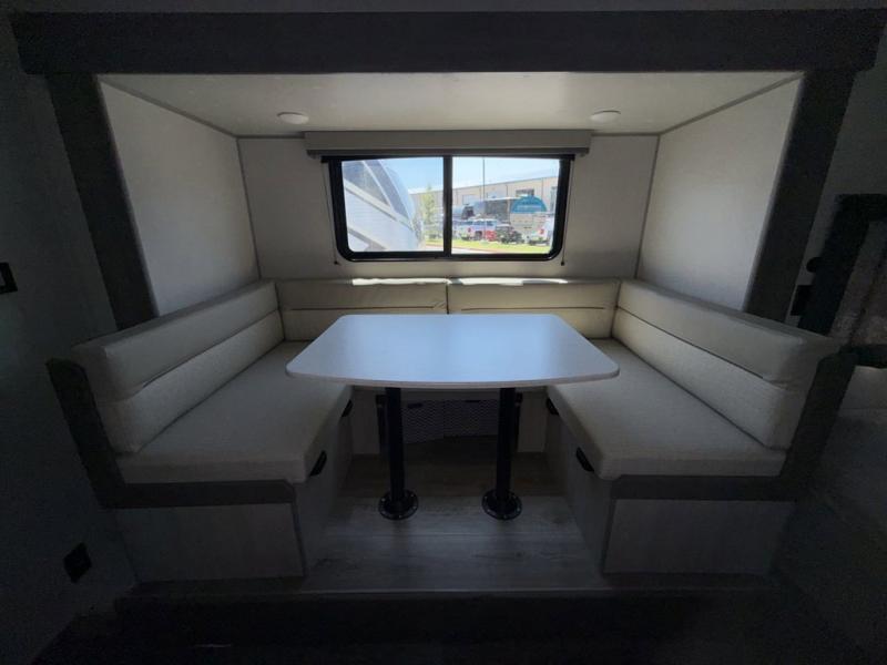 This spacious travel trailer can sleep eight campers each night thanks to the double-size bunks in the back, the U-shaped dinette within the slide out, and the queen bed up front! You can easily make meals for your crew with the two burner cooktop and microwave oven, and leftovers can go in the 10.7 cu. ft. 12V refrigerator! After you've cleaned up in the full bath, head outdoors to relax under the 15' power awning with multicolor LED lights and a remote!