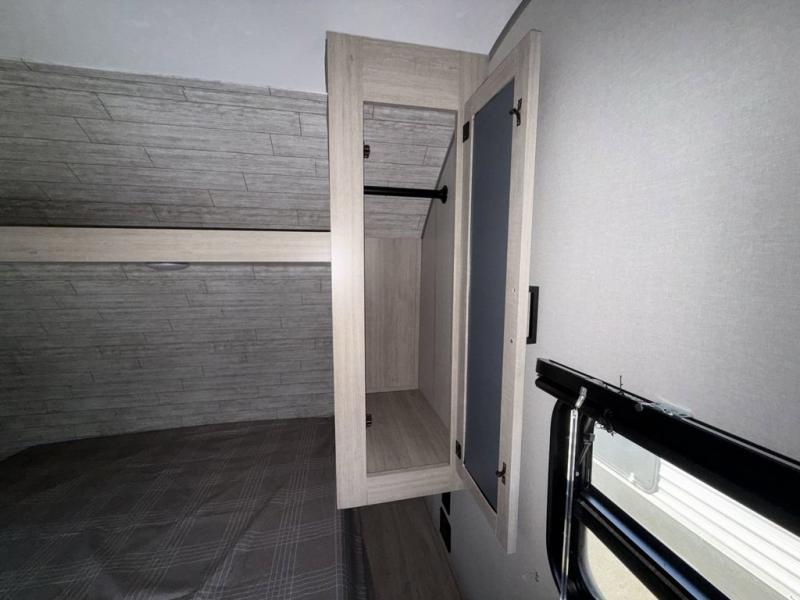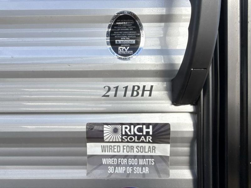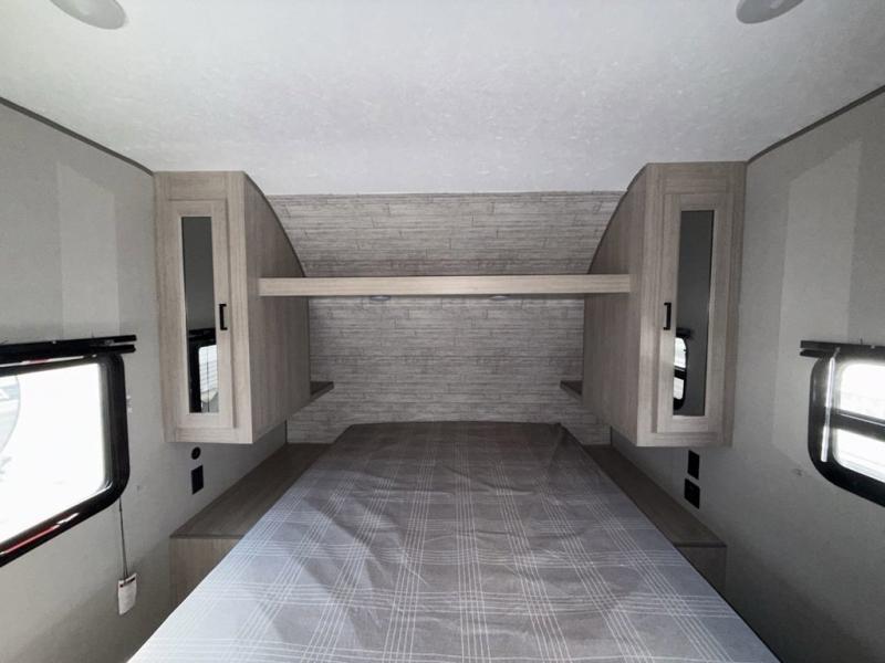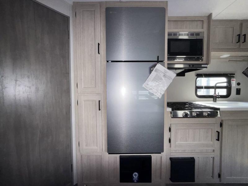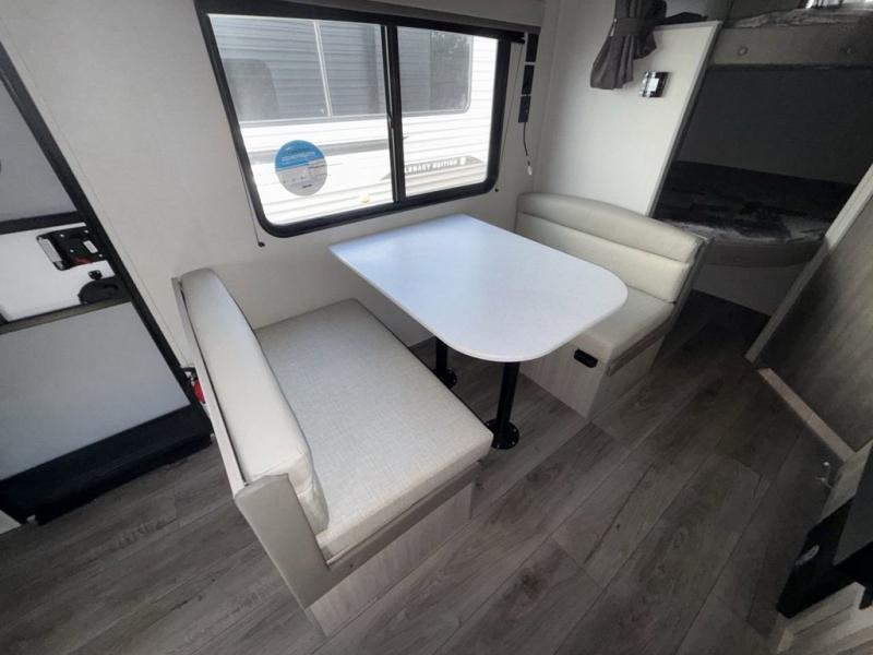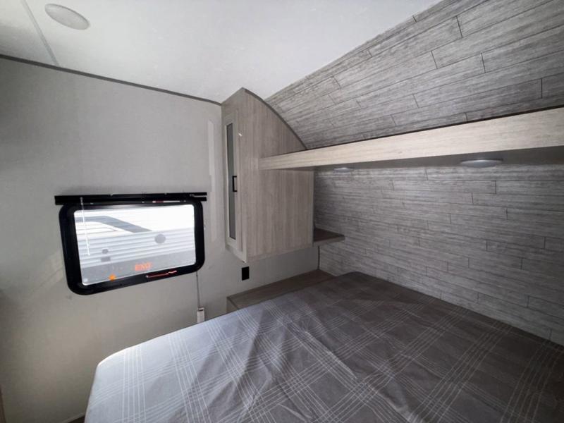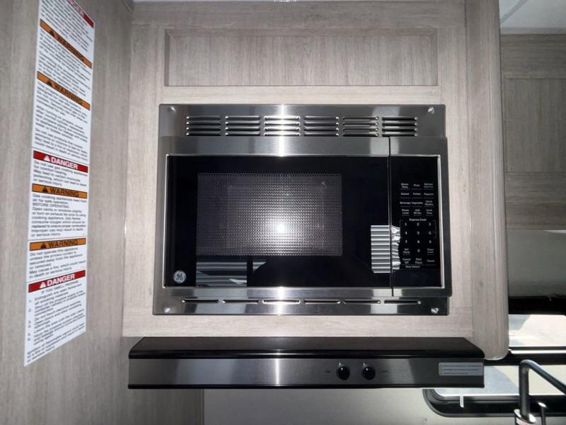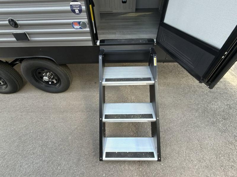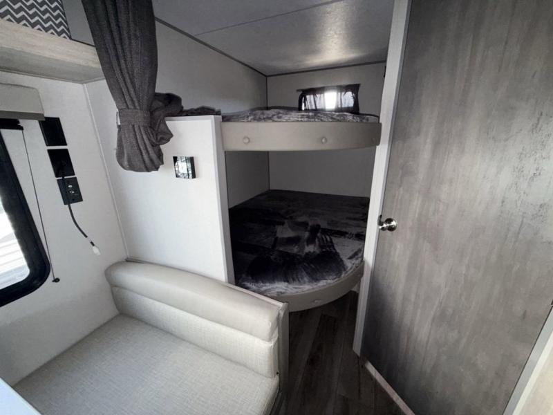 You'll love camping and spending time together in this travel trailer for seven! The bunk beds include under-bunk storage to keep bags out of the way, and the full bath is right next to the bunks for easy nighttime use. A semi-private bedroom up front includes a privacy curtain so you can get dressed each morning, and there are dual wardrobes to keep your things tidy. The chef of your group can whip up breakfast each morning on the three burner cooktop or in the GE stainless microwave, and there is a GE 10.7 cu. ft. 12V refrigerator to keep perishables fresh! A booth dinette provides a place to dine, or you can take your plate outdoors to sit under the 15' power awning with multicolored lights!