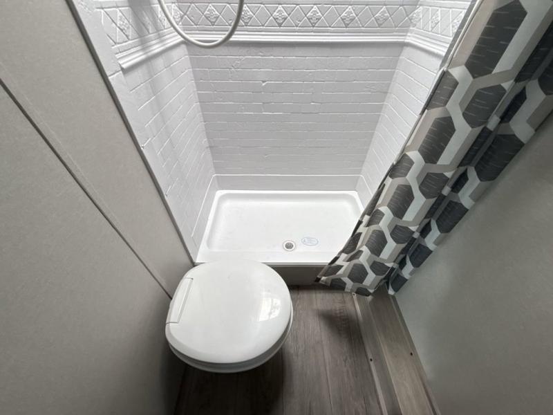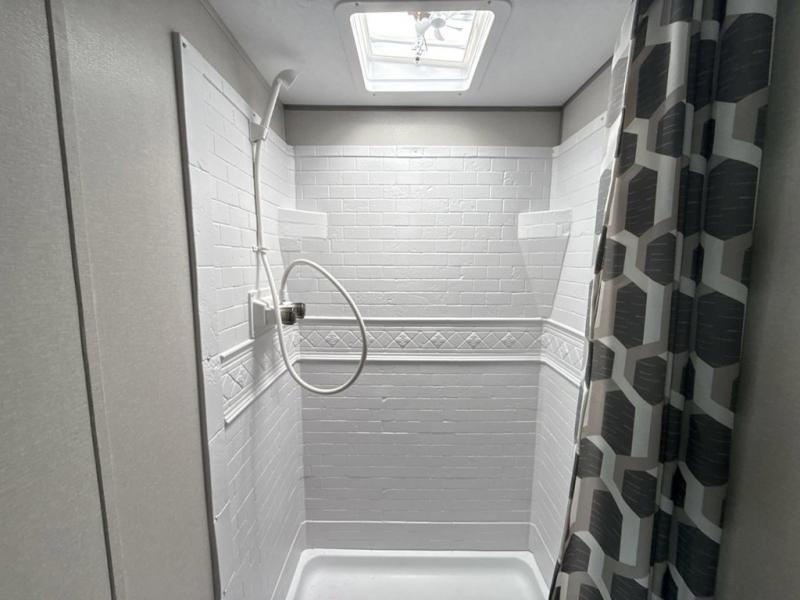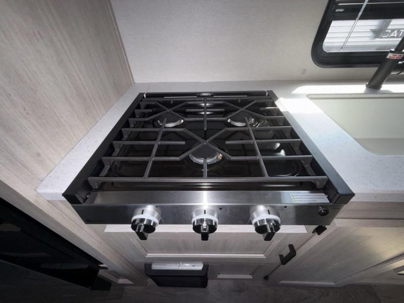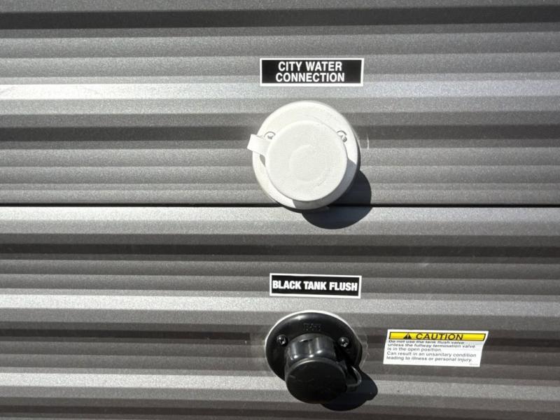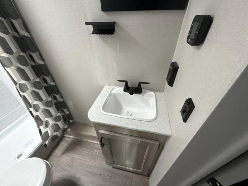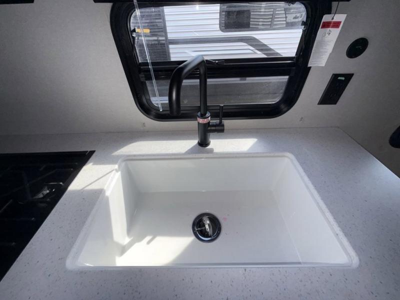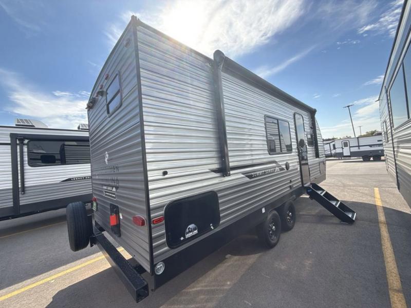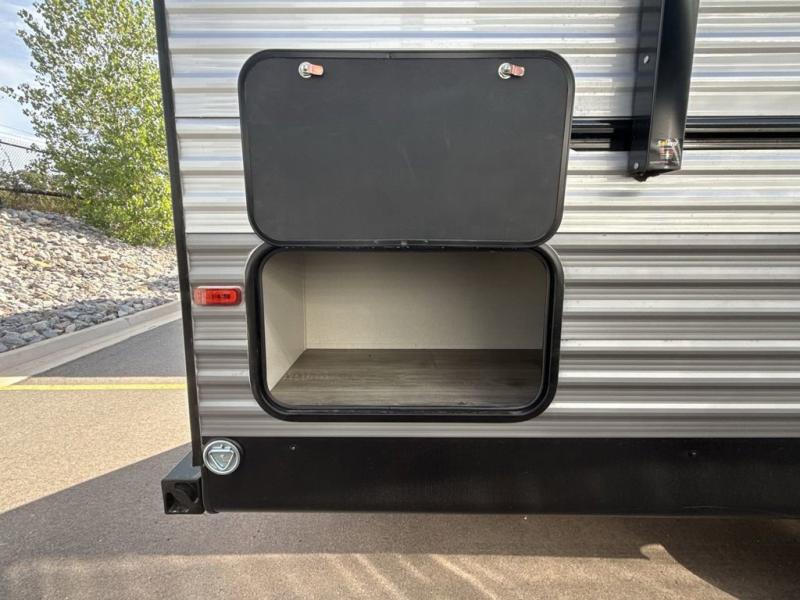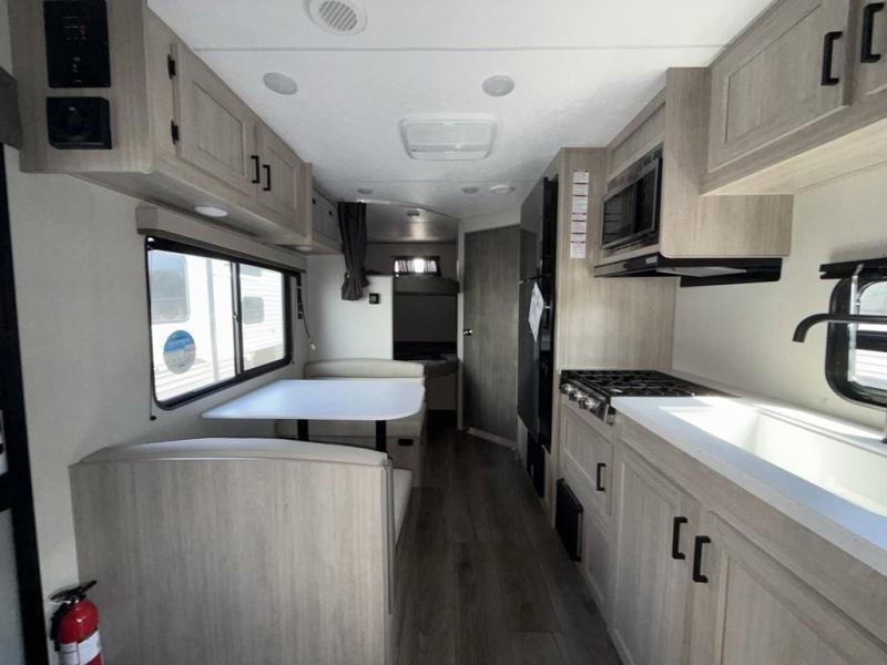 You'll love camping and spending time together in this travel trailer for seven! The bunk beds include under-bunk storage to keep bags out of the way, and the full bath is right next to the bunks for easy nighttime use. A semi-private bedroom up front includes a privacy curtain so you can get dressed each morning, and there are dual wardrobes to keep your things tidy. The chef of your group can whip up breakfast each morning on the three burner cooktop or in the GE stainless microwave, and there is a GE 10.7 cu. ft. 12V refrigerator to keep perishables fresh! A booth dinette provides a place to dine, or you can take your plate outdoors to sit under the 15' power awning with multicolored lights!