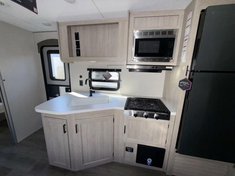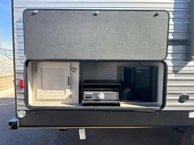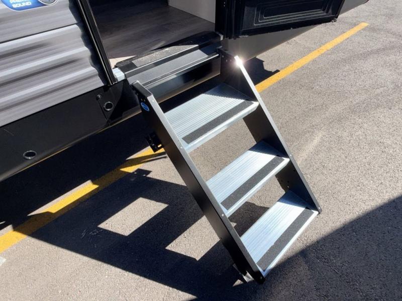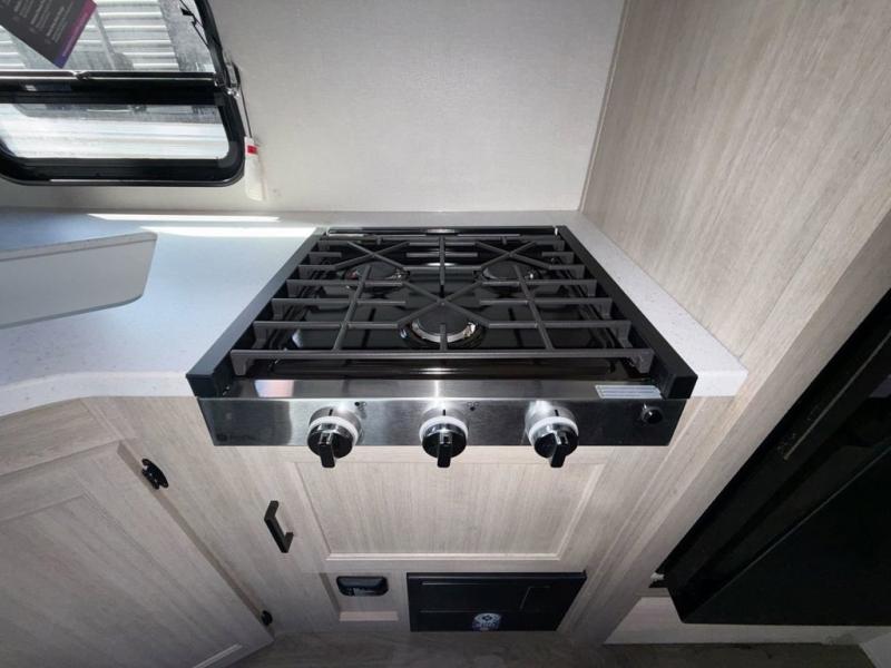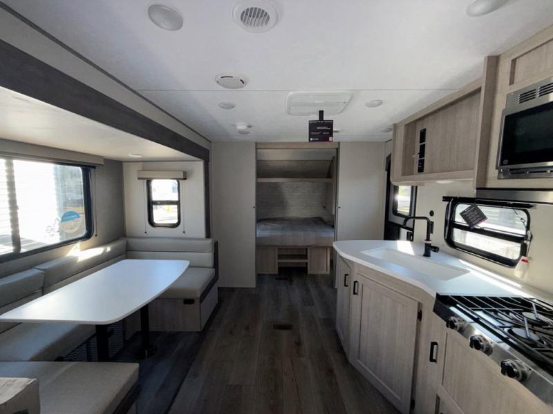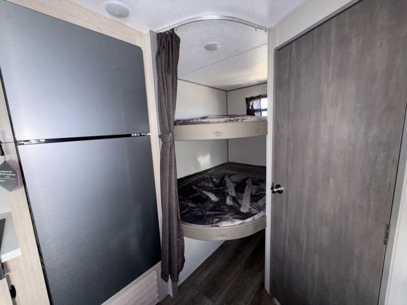 This is the perfect mid-size travel trailer for you and your family! The 46" x 74" double-size bunk beds with lower interior storage offer a comfortable sleeping space for the kids and you will have your own private sleeping space with the 60" x 74" queen bed in the front bedroom. Freshen up each morning in the rear corner bathroom with the tub/shower and a mirror to get ready each morning. You can prepare your best home cooked meals with the GE stainless three burner cooktop and GE stainless 10.7 cu. ft. 12V refrigerator, then enjoy them together at the booth dinette. The sofa is near the entertainment center for a relaxing movie night. Don't leave any of your outdoor gear behind either, thanks to the front pass-through storage area and the exterior outside storage area. You could even add the optional outside camper kitchen to grill the catch of the day on the pull out griddle!
