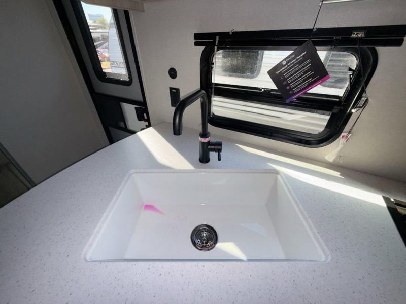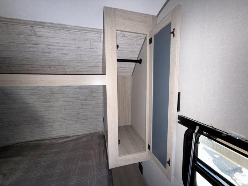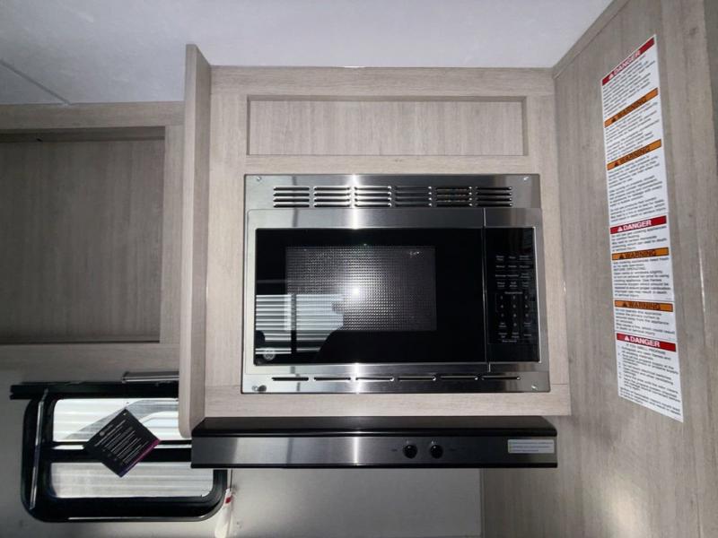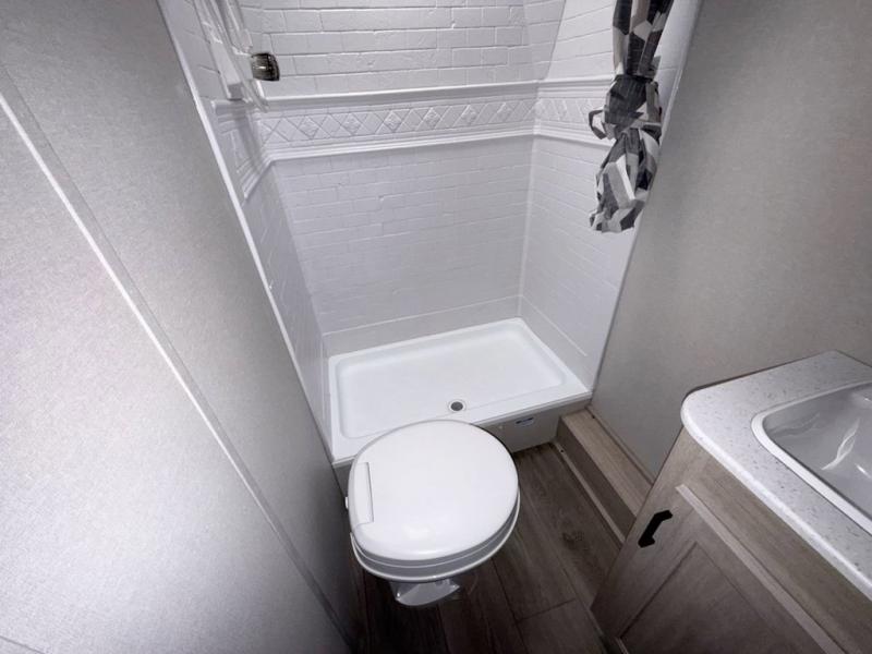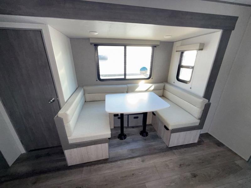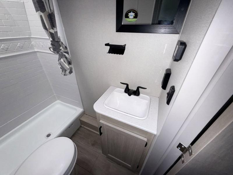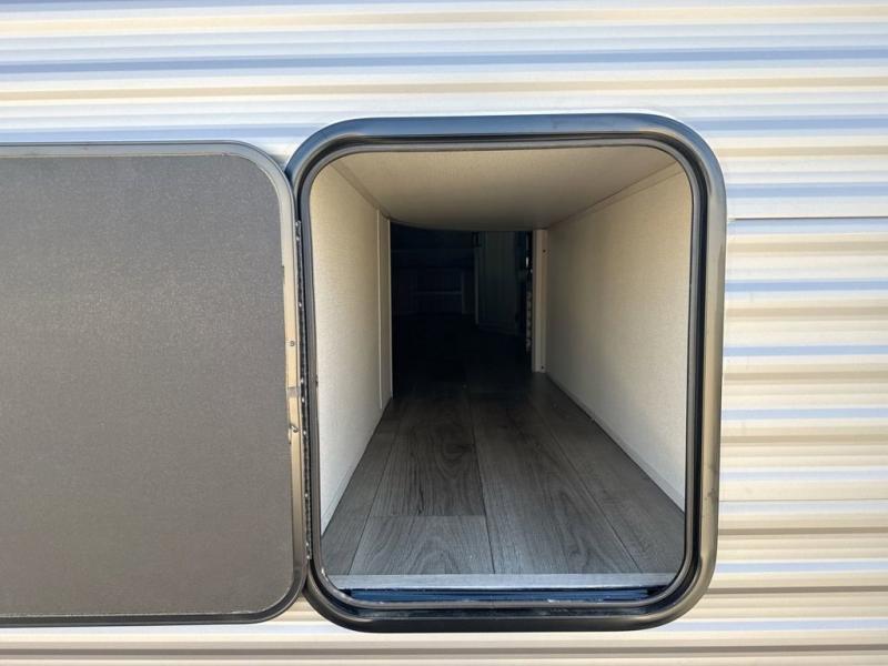 This is the perfect mid-size travel trailer for you and your family! The 46" x 74" double-size bunk beds with lower interior storage offer a comfortable sleeping space for the kids and you will have your own private sleeping space with the 60" x 74" queen bed in the front bedroom. Freshen up each morning in the rear corner bathroom with the tub/shower and a mirror to get ready each morning. You can prepare your best home cooked meals with the GE stainless three burner cooktop and GE stainless 10.7 cu. ft. 12V refrigerator, then enjoy them together at the booth dinette. The sofa is near the entertainment center for a relaxing movie night. Don't leave any of your outdoor gear behind either, thanks to the front pass-through storage area and the exterior outside storage area. You could even add the optional outside camper kitchen to grill the catch of the day on the pull out griddle!
