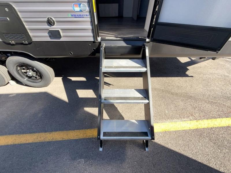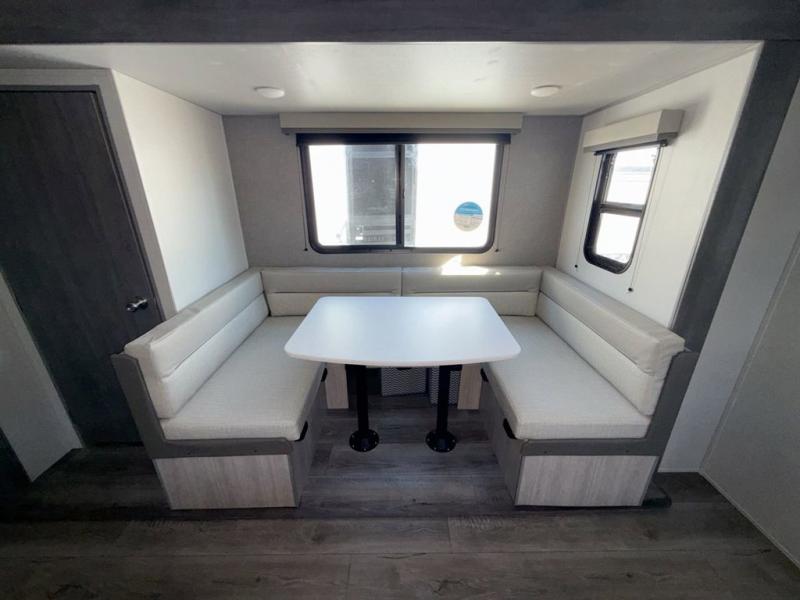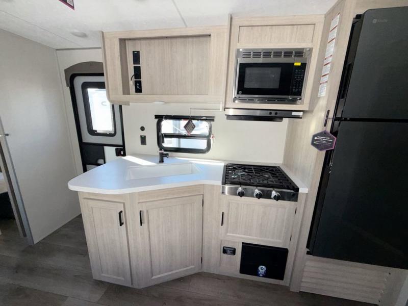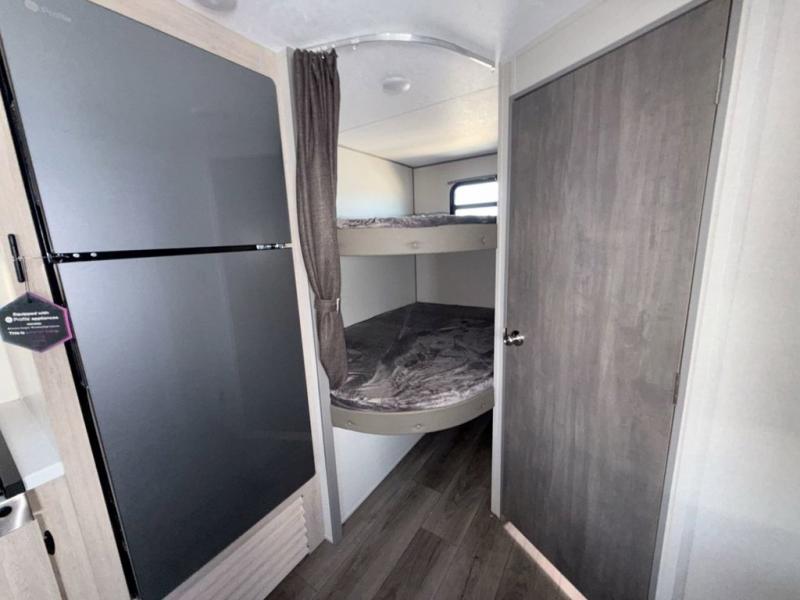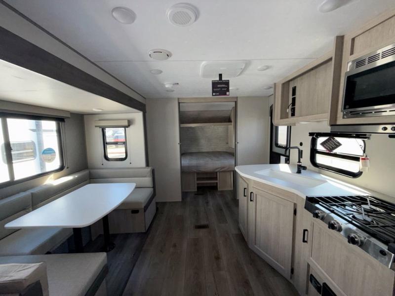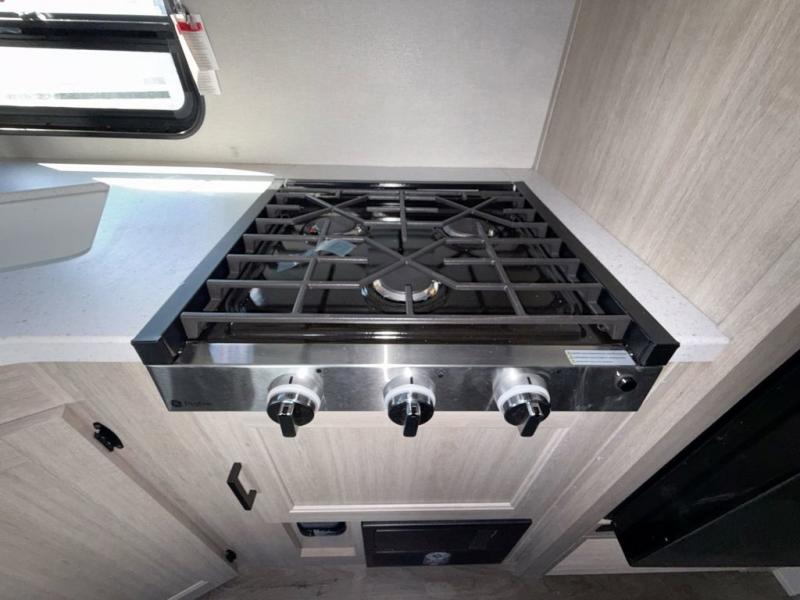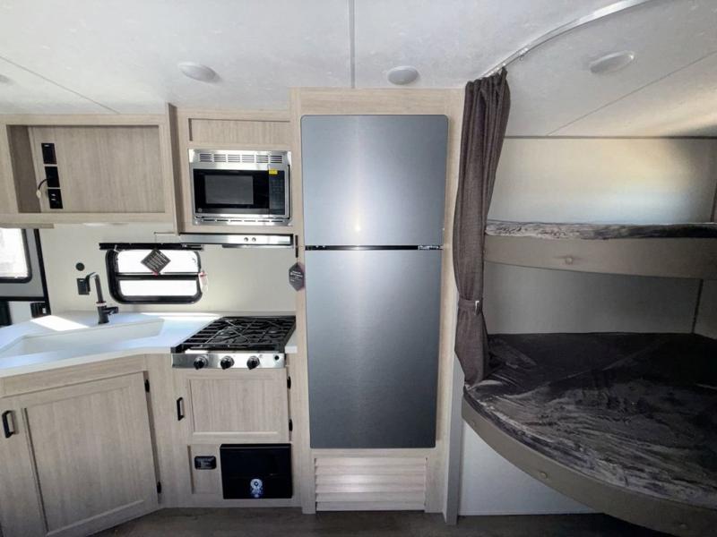 This is the perfect mid-size travel trailer for you and your family! The double-size bunks offer a comfortable sleeping space for the kids and you will have your own private sleeping space with a queen bed in the front bedroom. Freshen up each day in the rear corner bathroom with the tub/shower and a mirror to get ready each morning. You can prepare your best home cooked meals with the GE stainless three burner cooktop and GE stainless 10.7 cu. ft. 12V refrigerator, then enjoy them together at the u-shaped dinette. There is also a large pantry to store all your goods. Don't leave any of your outdoor gear behind either, thanks to the front pass-through storage area and the exterior outside storage area. You could even add the optional outside camper kitchen to grill the catch of the day on the pull out griddle!