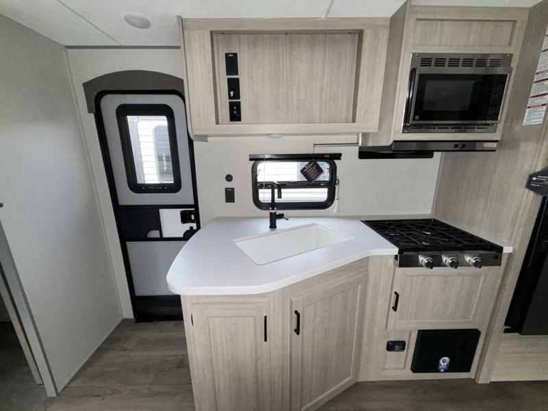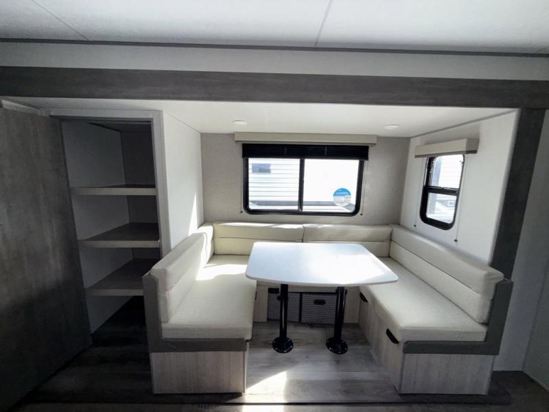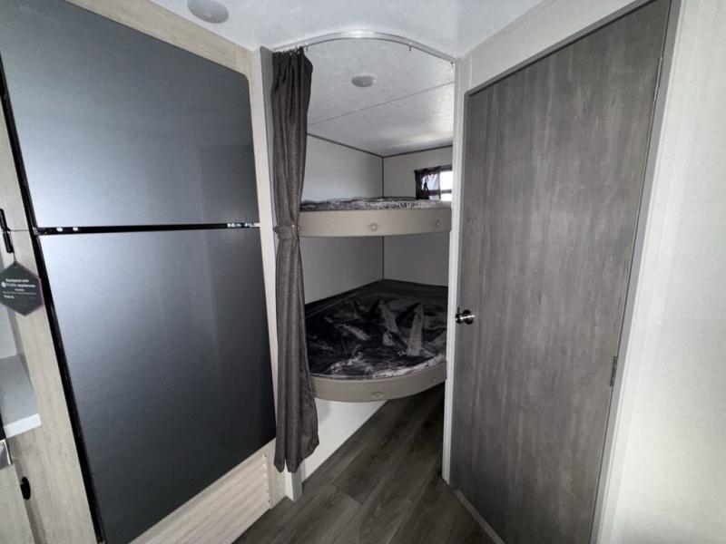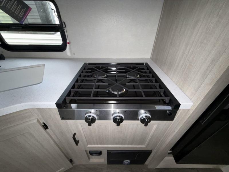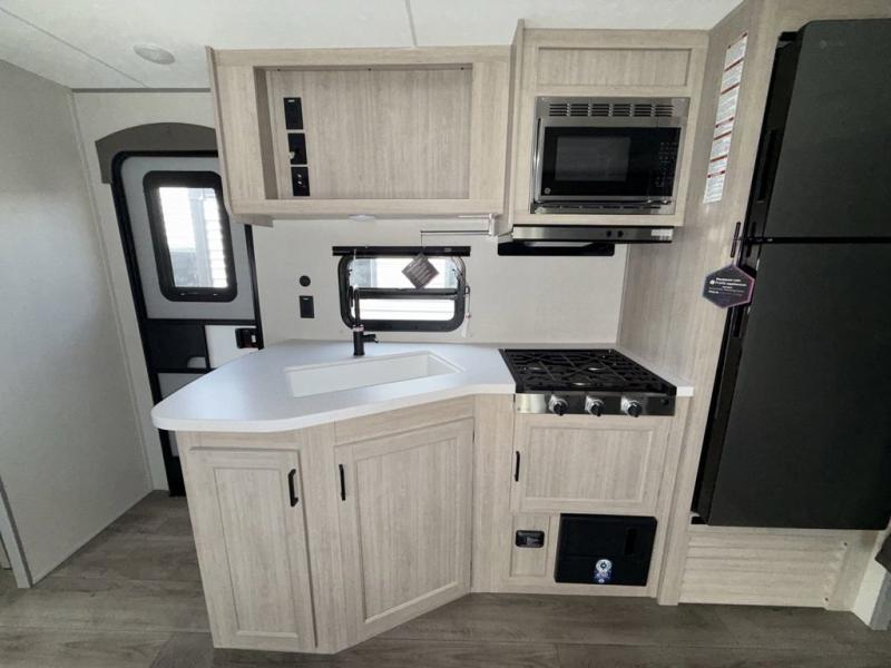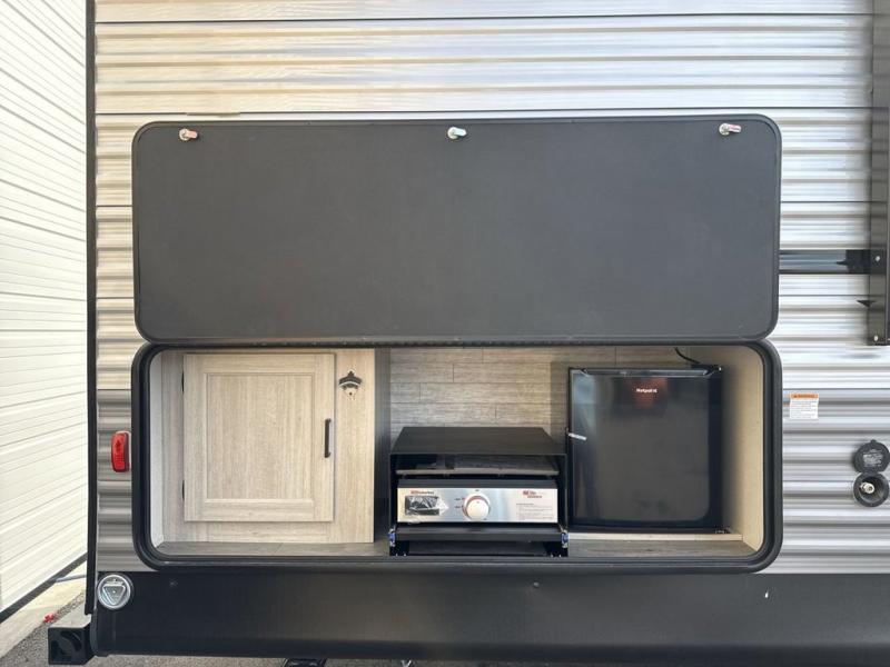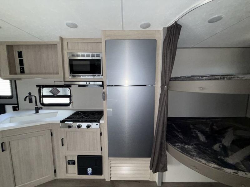 This is the perfect mid-size travel trailer for you and your family! The double-size bunks offer a comfortable sleeping space for the kids and you will have your own private sleeping space with a queen bed in the front bedroom. Freshen up each day in the rear corner bathroom with the tub/shower and a mirror to get ready each morning. You can prepare your best home cooked meals with the GE stainless three burner cooktop and GE stainless 10.7 cu. ft. 12V refrigerator, then enjoy them together at the u-shaped dinette. There is also a large pantry to store all your goods. Don't leave any of your outdoor gear behind either, thanks to the front pass-through storage area and the exterior outside storage area. You could even add the optional outside camper kitchen to grill the catch of the day on the pull out griddle!