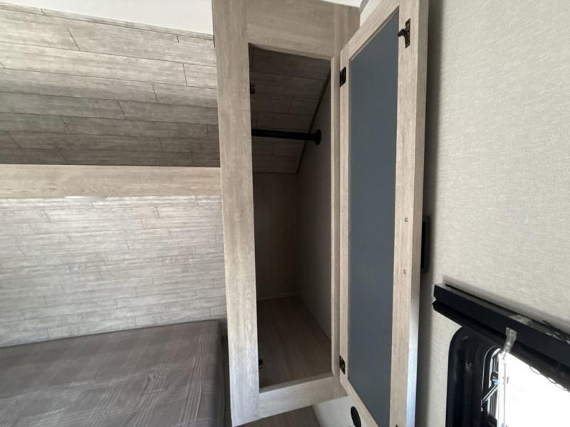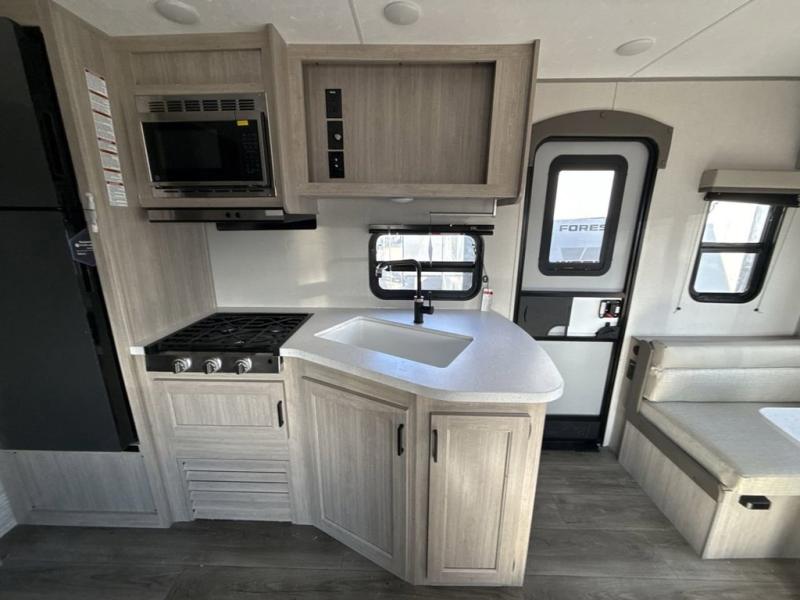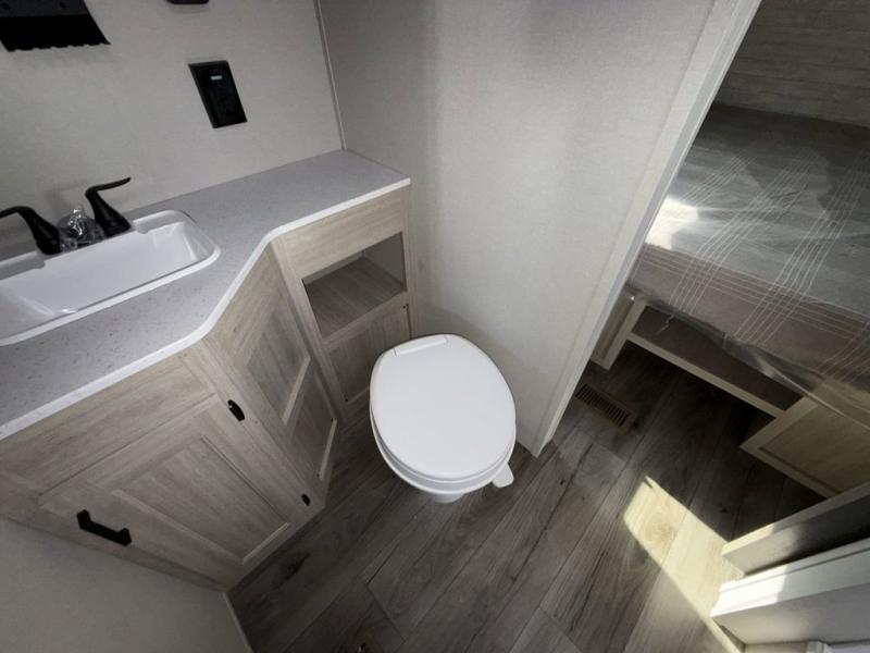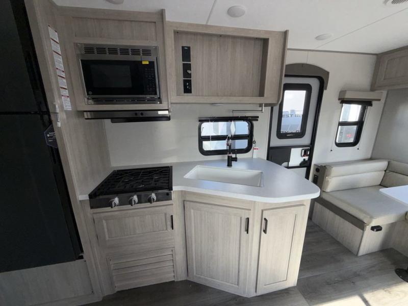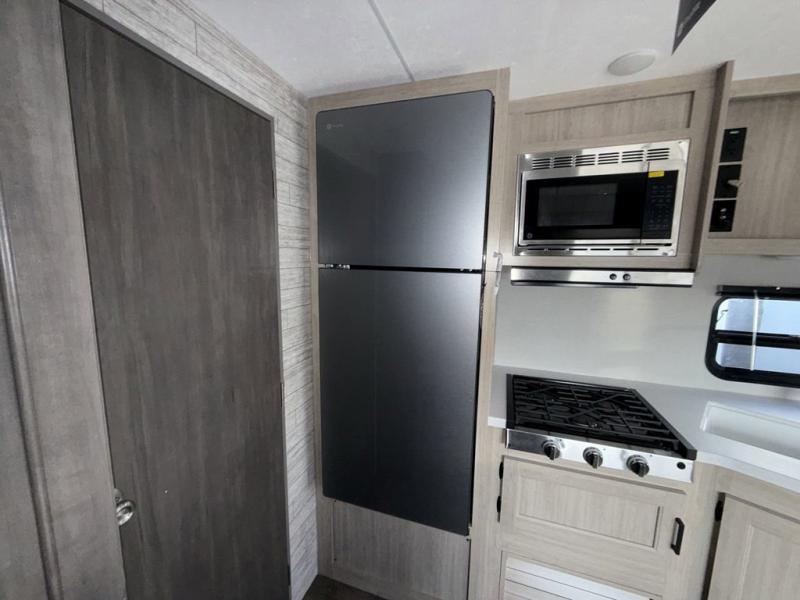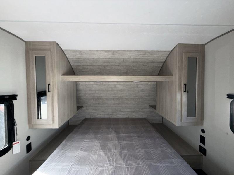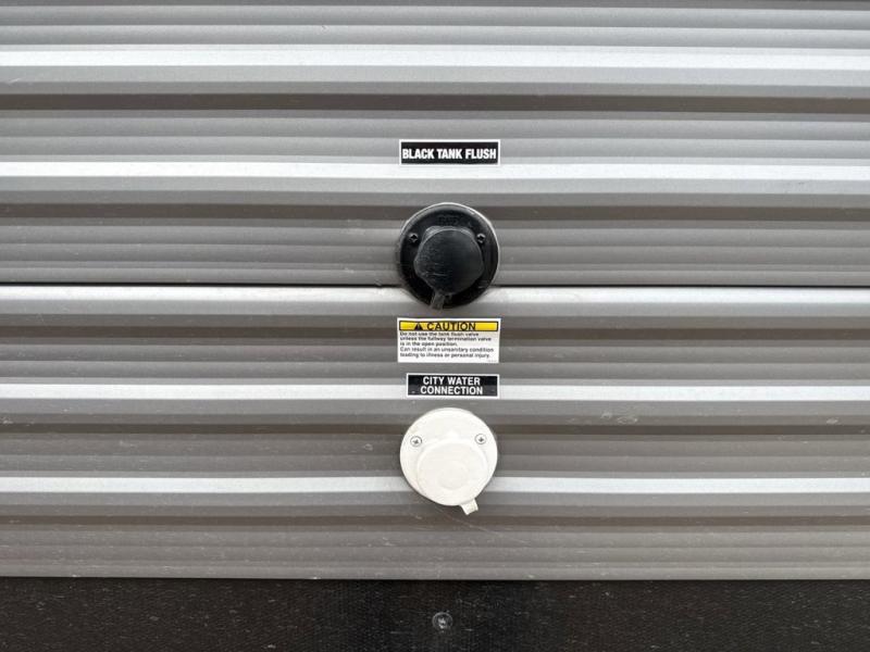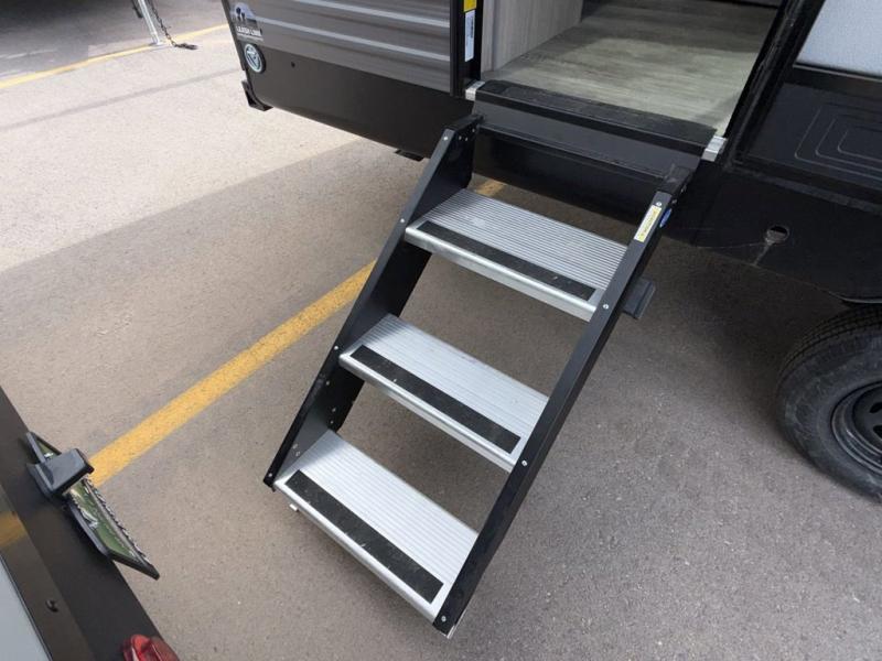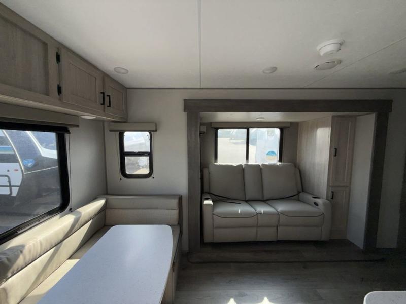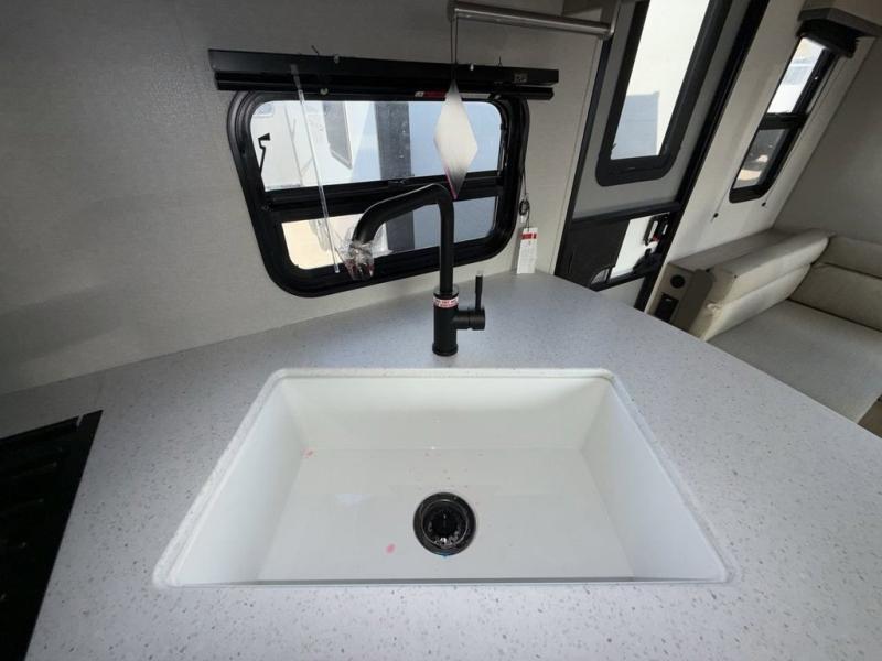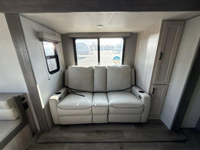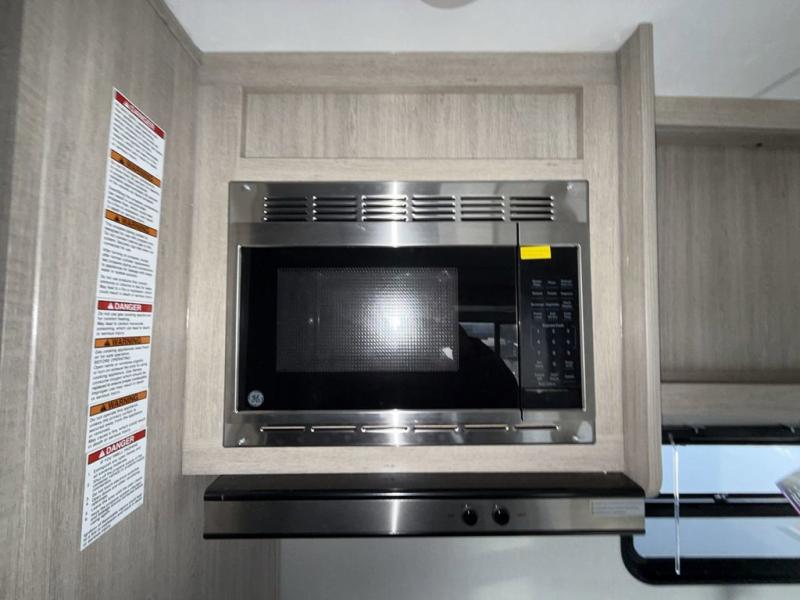 You and your partner will love the layout of this trailer with a walk-through bathroom which is convenient for you when you are in the front bedroom, and handy for your guests when they stay overnight on the U-shaped dinette. The rear U-shaped dinette includes dual end tables to set your drink on, and the theater seating within the slide out will let you relax each evening. The galley kitchen offers all the appliances needed to make all your meals, such as a GE stainless three burner cooktop, a GE stainless microwave, plus a GE stainless 10.7 cu. ft. 12V refrigerator. You will have your own side of the walk-around queen bed and a wardrobe, as well as USB ports and outlets in the nightstands.
