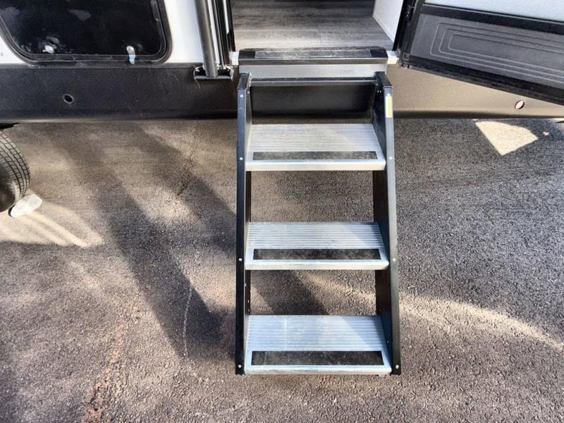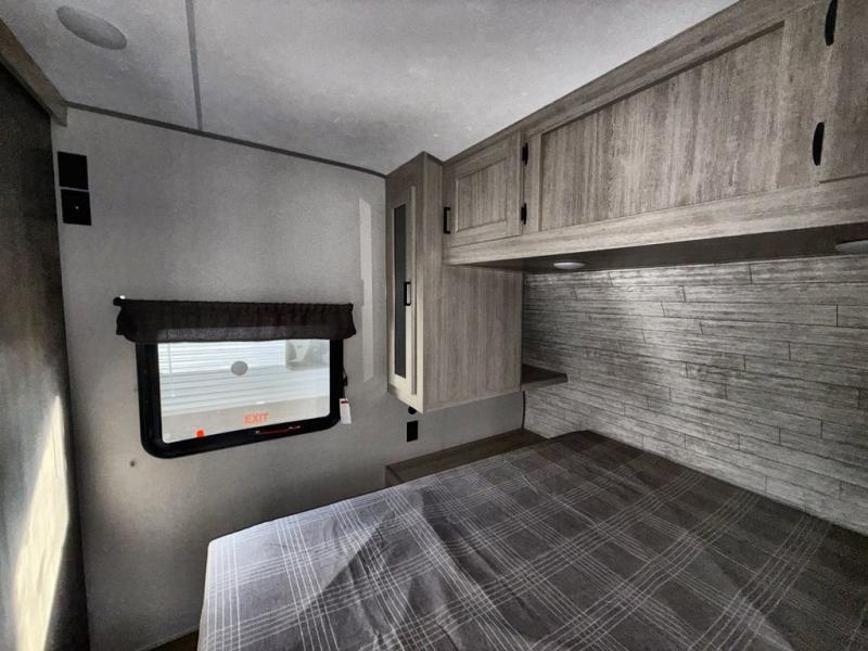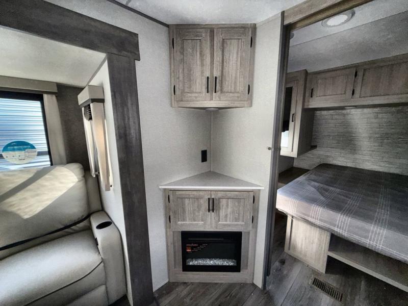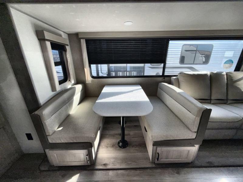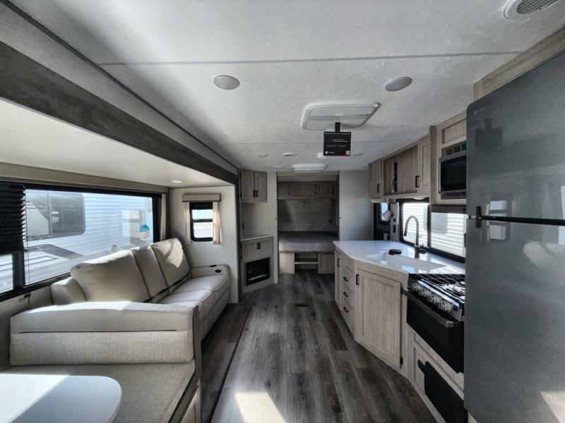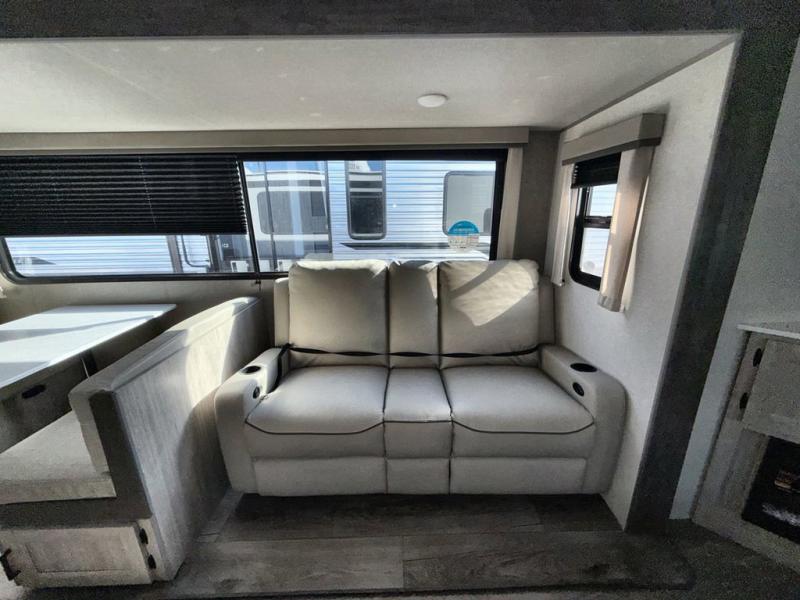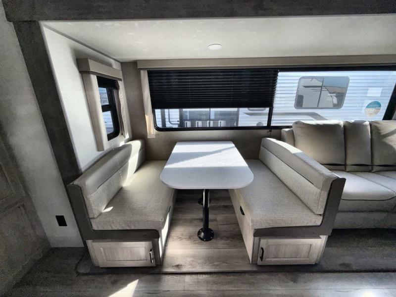 This family-friendly trailer offers lots of floor space thanks to the triple slides throughout! You and your family will love the combined living and kitchen area with a slide out booth dinette and a sofa with drink holders. The L-shaped kitchen counter allows the cook to make meals without moving for anyone trying to get to the full bathroom or the rear bunkhouse. The kids will have their own privacy, two bunk beds, a jack knife sofa with storage totes below plus a TV/wardrobe cabinet. The front private bedroom allows you to sleep like royalty and offers a large closet for your clothing and another closet prepped for a washer/dryer. And don't forget about the full-size camper kitchen and the 21' power awning with multicolor LED lights when you are outside.
