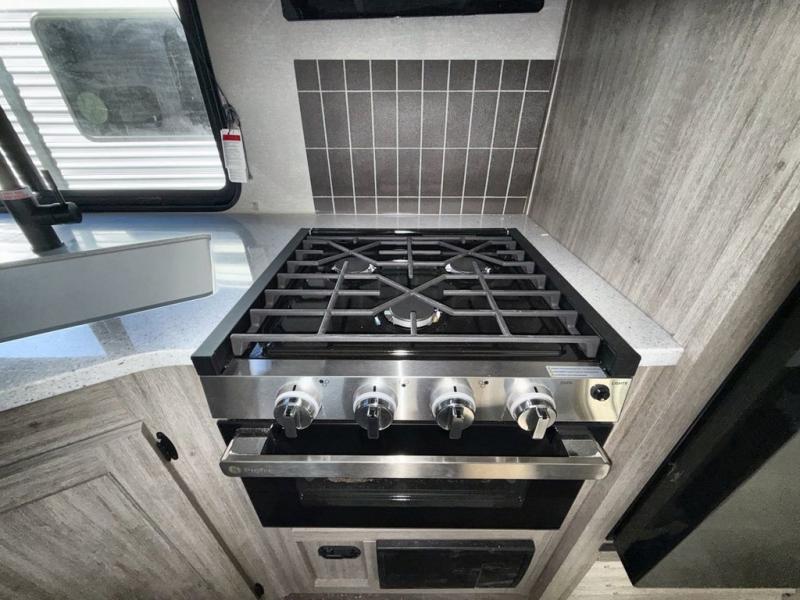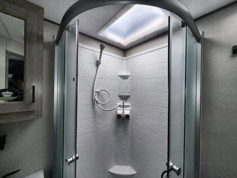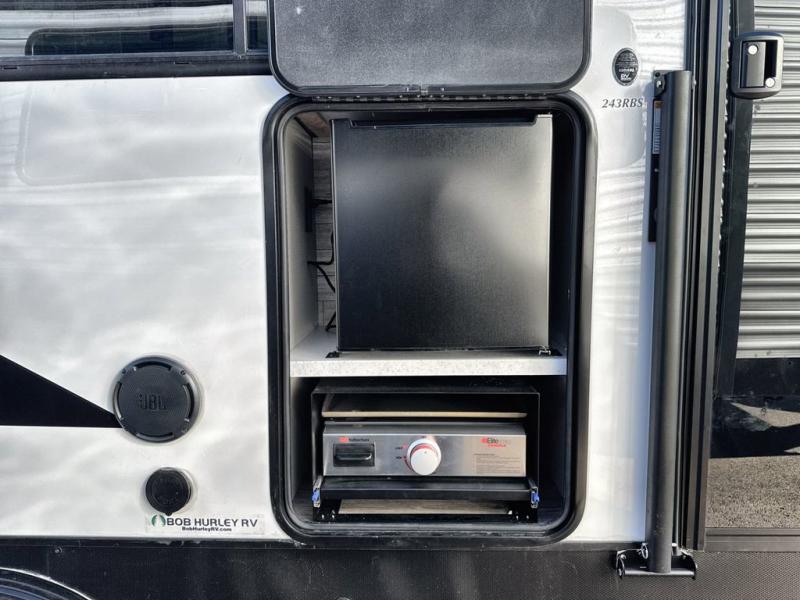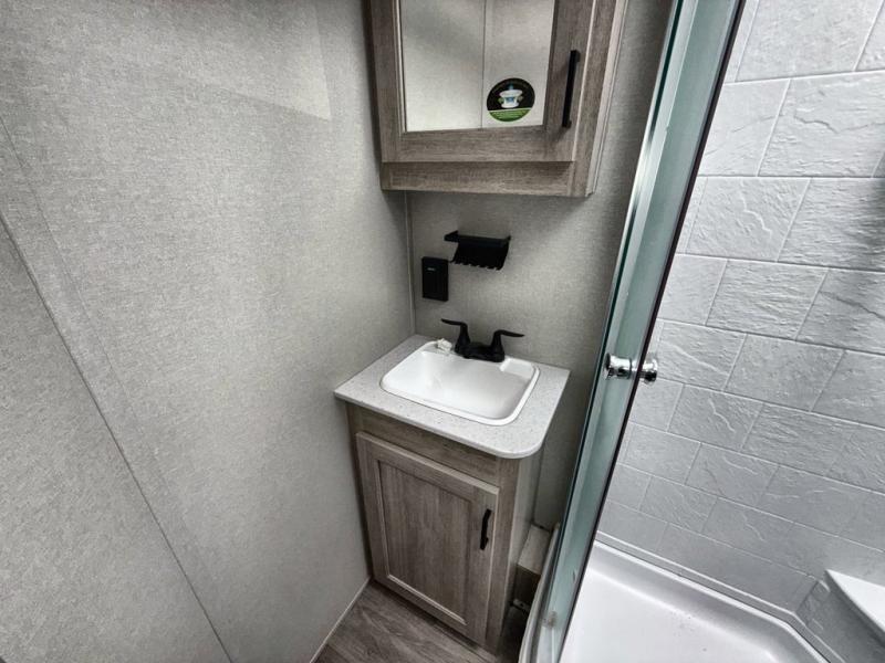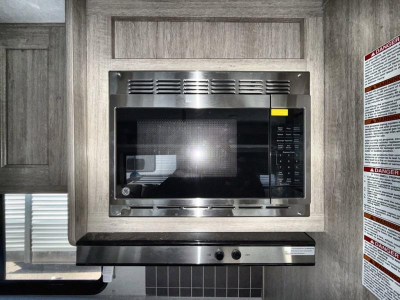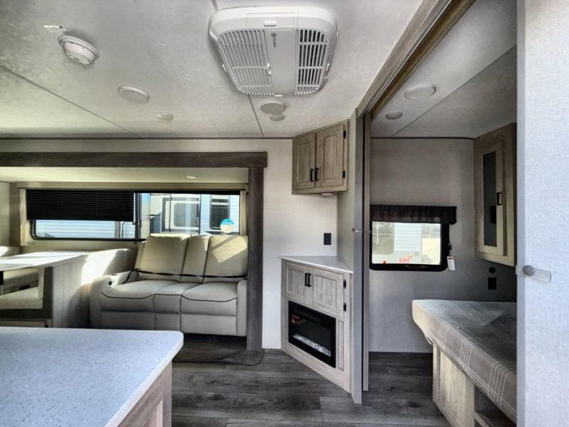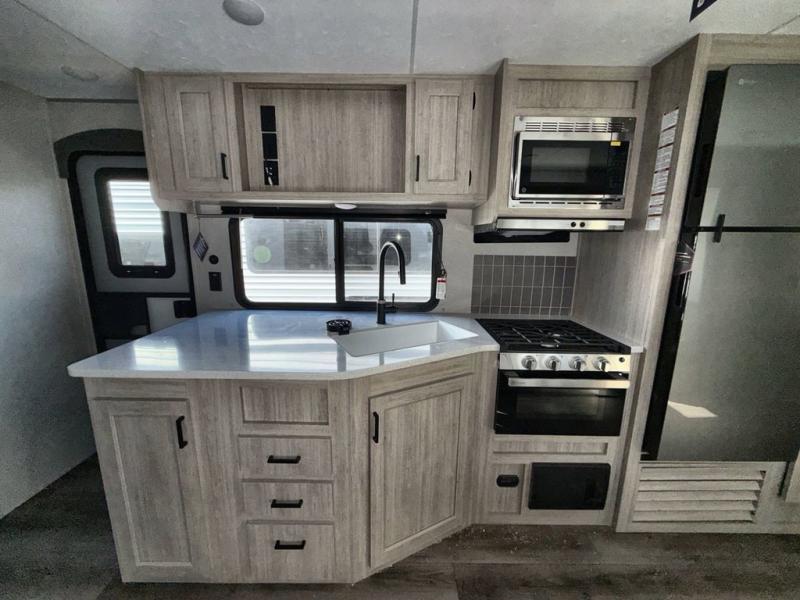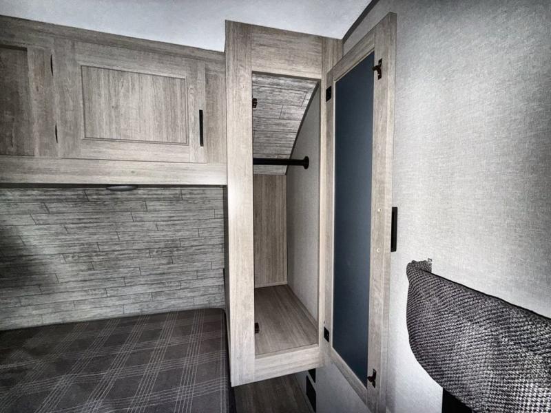 This family-friendly trailer offers lots of floor space thanks to the triple slides throughout! You and your family will love the combined living and kitchen area with a slide out booth dinette and a sofa with drink holders. The L-shaped kitchen counter allows the cook to make meals without moving for anyone trying to get to the full bathroom or the rear bunkhouse. The kids will have their own privacy, two bunk beds, a jack knife sofa with storage totes below plus a TV/wardrobe cabinet. The front private bedroom allows you to sleep like royalty and offers a large closet for your clothing and another closet prepped for a washer/dryer. And don't forget about the full-size camper kitchen and the 21' power awning with multicolor LED lights when you are outside.
