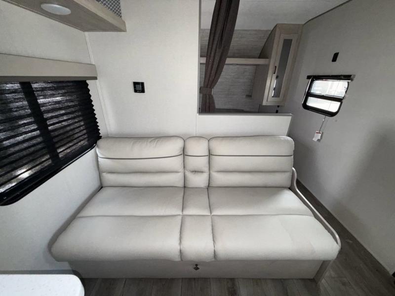 You get to choose to sit at the sofa or at the booth dinette when you are relaxing inside. There is a shelf with storage totes above the sofa for your belongings, and an additional overhead cabinet above the dinette for games. Maybe you want to rest on your own queen bed in the front semi-private bedroom before you make a meal in the kitchen or take a hike through the trails around the lake. The 15' electric awning with multi-color LED lights and a remote offers an outdoor living area where you can visit with other RVers. The kids will love their own double-size bunks that they can share with a friend or two, and the full bathroom is nearby as an added convenience.