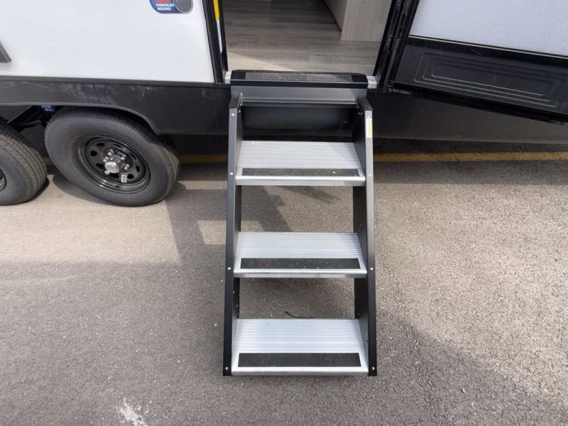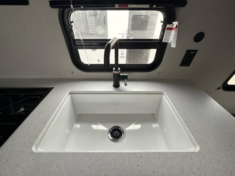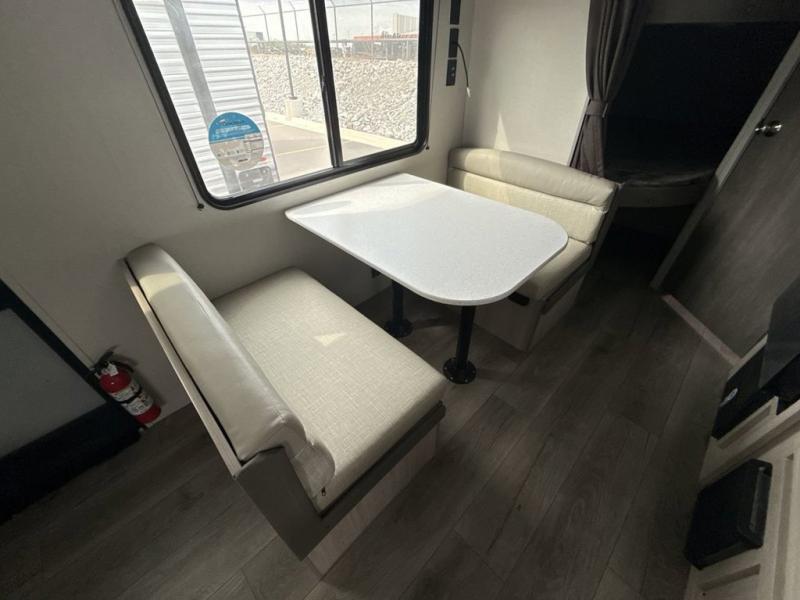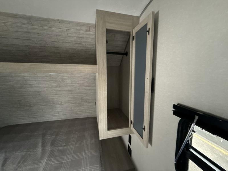 You get to choose to sit at the sofa or at the booth dinette when you are relaxing inside. There is a shelf with storage totes above the sofa for your belongings, and an additional overhead cabinet above the dinette for games. Maybe you want to rest on your own queen bed in the front semi-private bedroom before you make a meal in the kitchen or take a hike through the trails around the lake. The 15' electric awning with multi-color LED lights and a remote offers an outdoor living area where you can visit with other RVers. The kids will love their own double-size bunks that they can share with a friend or two, and the full bathroom is nearby as an added convenience.