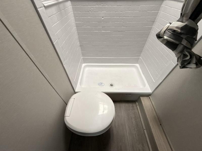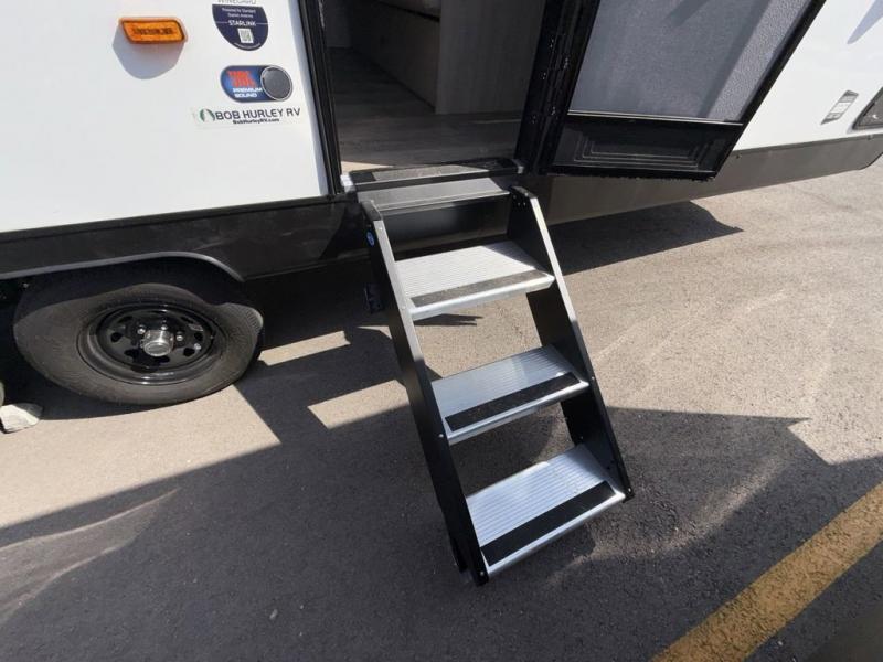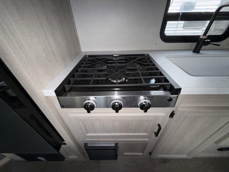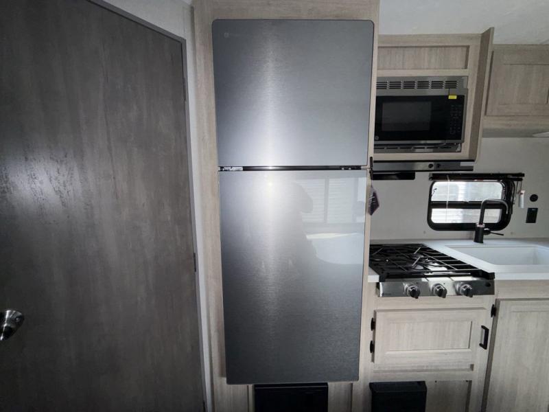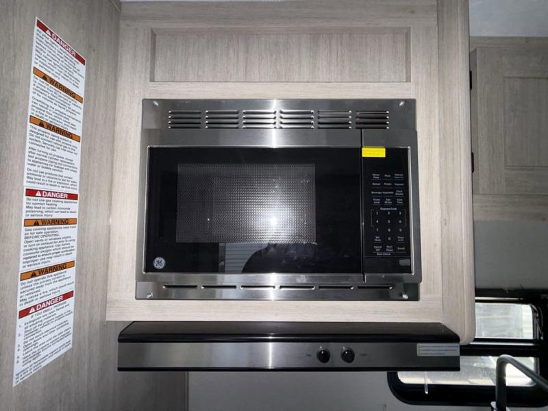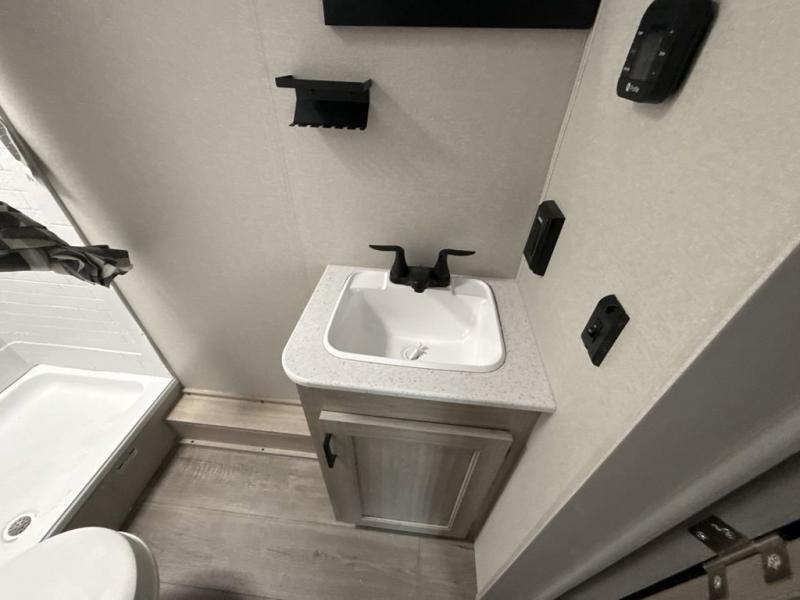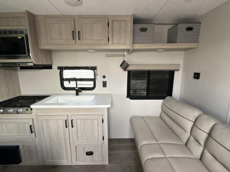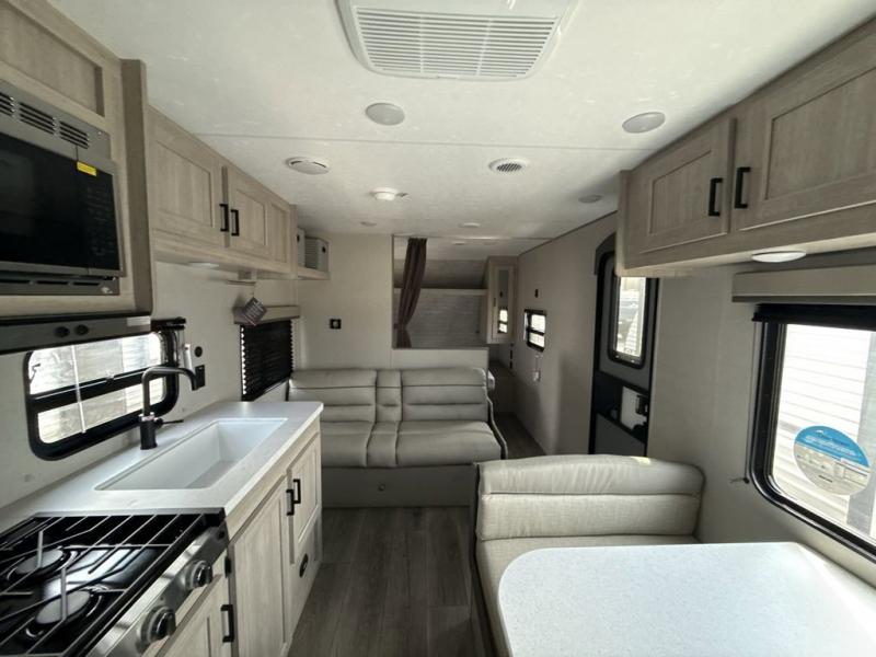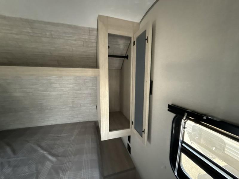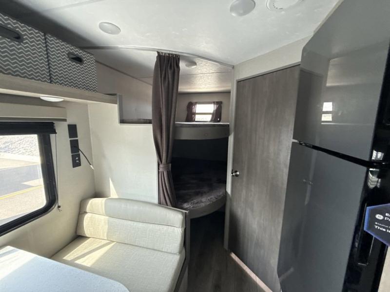 You get to choose to sit at the sofa or at the booth dinette when you are relaxing inside. There is a shelf with storage totes above the sofa for your belongings, and an additional overhead cabinet above the dinette for games. Maybe you want to rest on your own queen bed in the front semi-private bedroom before you make a meal in the kitchen or take a hike through the trails around the lake. The 15' electric awning with multi-color LED lights and a remote offers an outdoor living area where you can visit with other RVers. The kids will love their own double-size bunks that they can share with a friend or two, and the full bathroom is nearby as an added convenience.